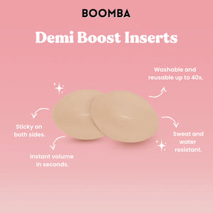 Unlike a sticky bra that is supported by the adhesive, BOOMBA inserts are supported by the clothing, they cannot stay up by themselves. It is crucial to wear them in tight, structured, and fitted tops.