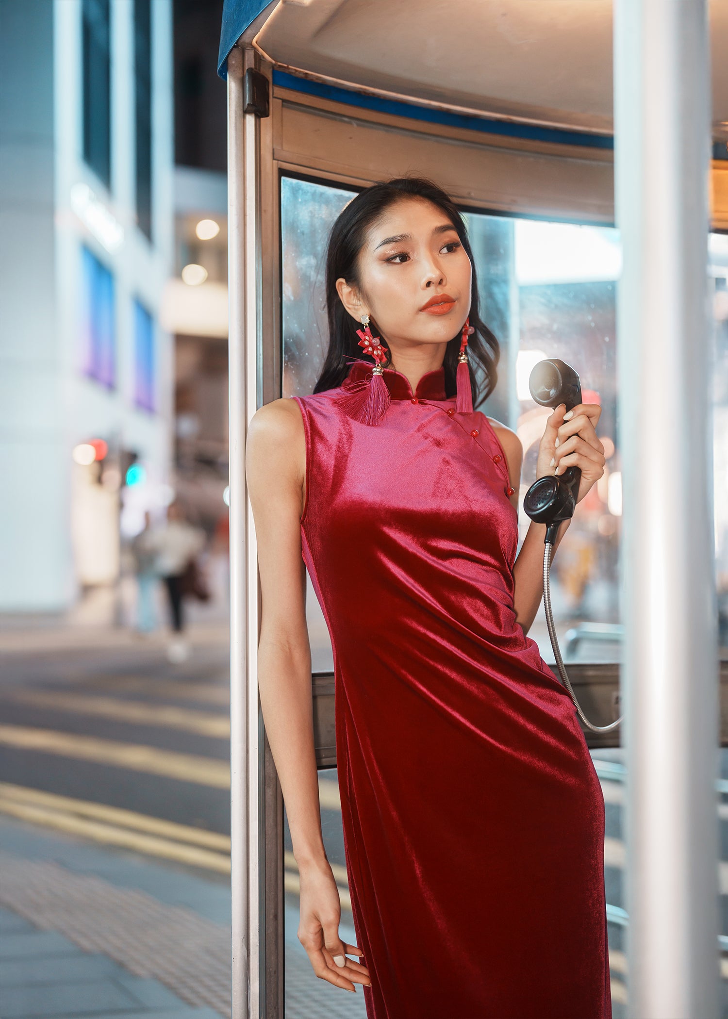 The Fuchsia Hellebores qipao is designed for those who want to look glamorous. Cut from stretched velvet, in a sleeveless open back design with ruching to help hide your belly, the qipao was originally designed for Tango / Milonga parties. This is our definition of Oriental glamour. Wear it with heeled sandals.