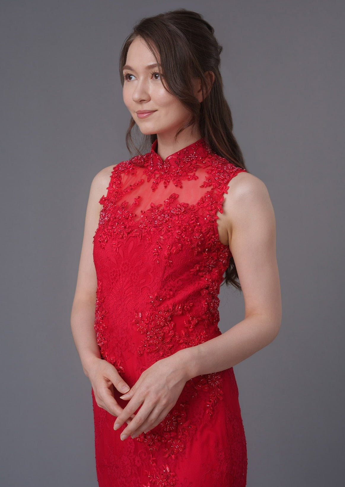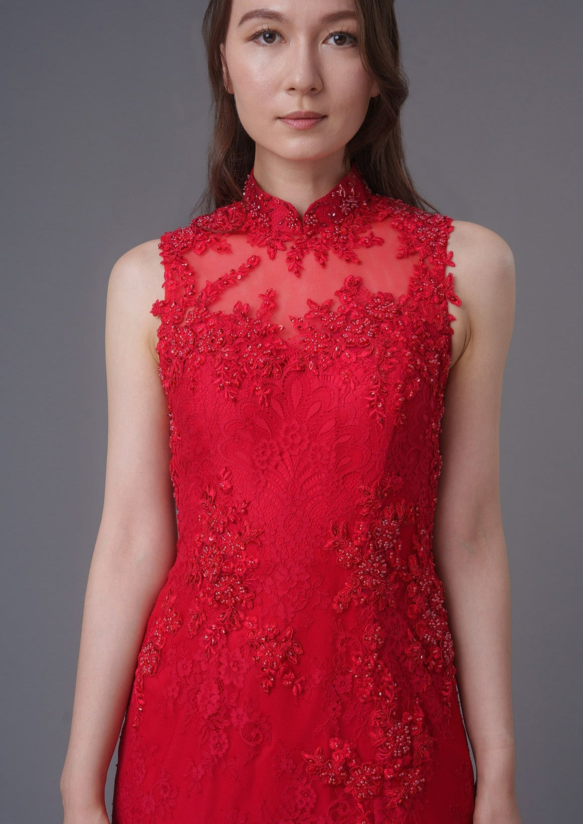 The Hyacinth Hues Bridal Qipao Gown boasts a sophisticated and contemporary embroidered lace design, making it both comfortable and stylish. Its fitted bodice flows into a delicate fishtail skirt, while the mesh back adds a touch of elegance. We love the front slit for the added sexiness.