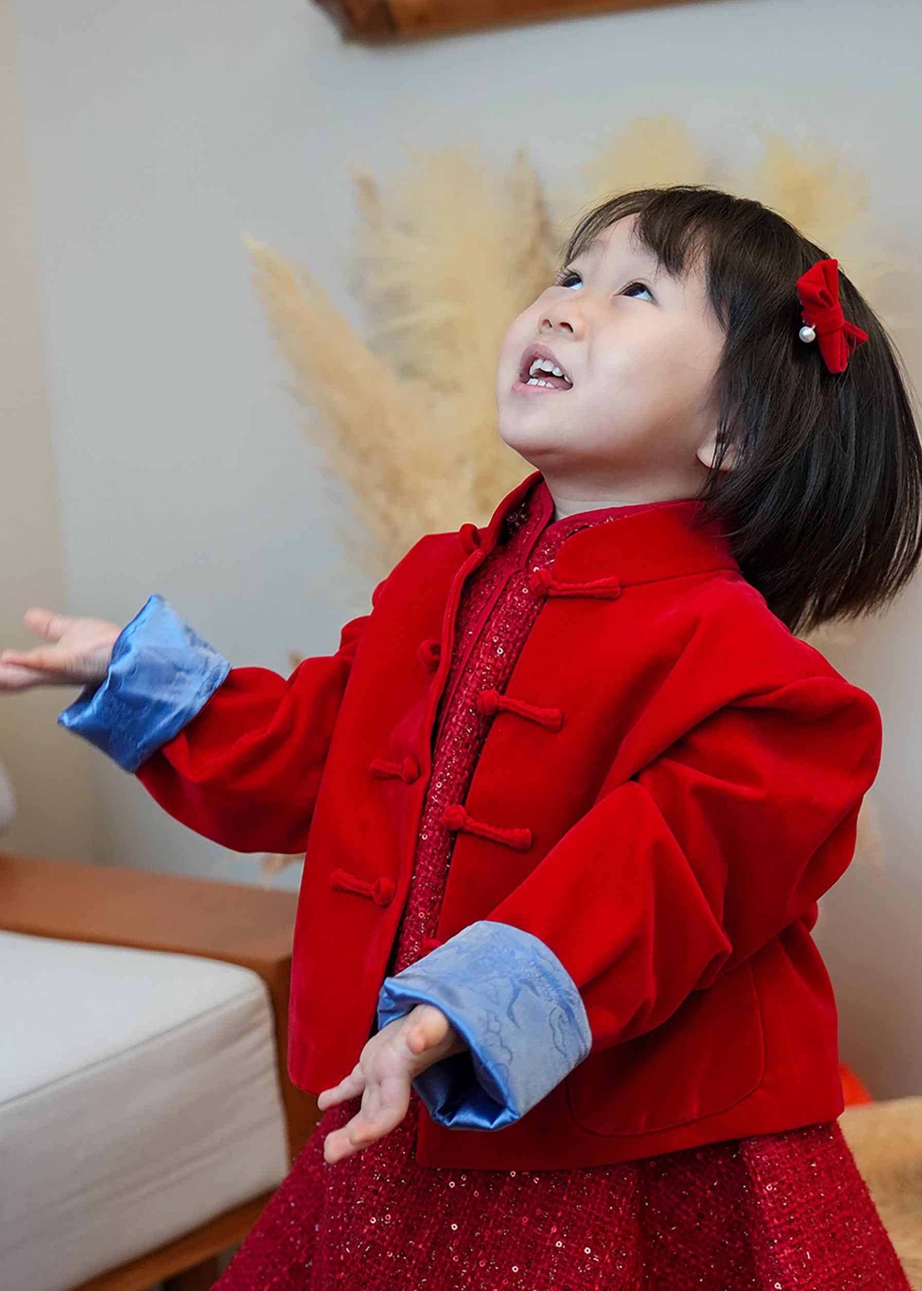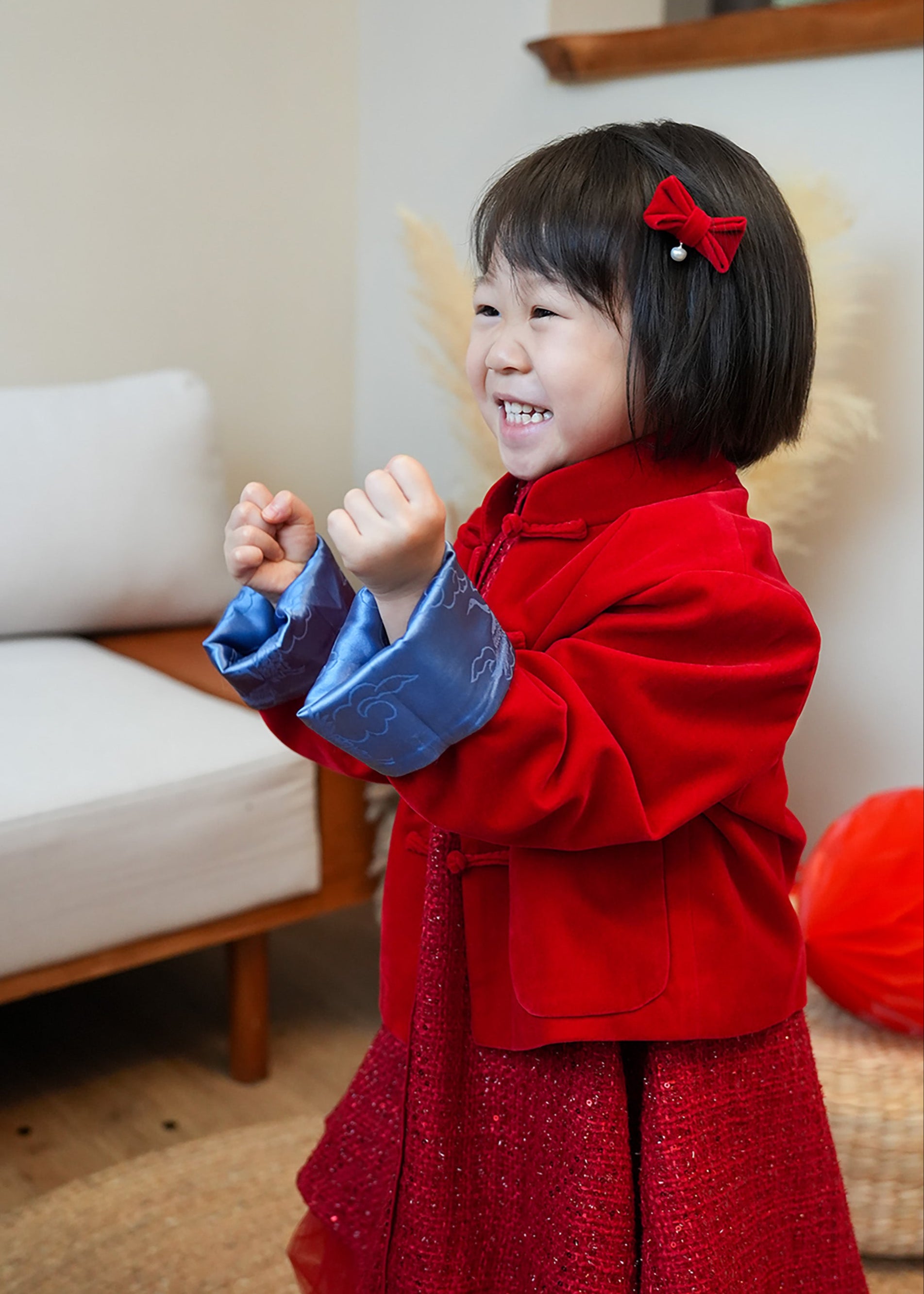 Dress your little one in our Kids Velvet Tang Jacket, perfect for Chinese New Year celebrations. Crafted from rich red velvet, this charming jacket features traditional pankou buttons that add a touch of cultural elegance. The foldable sleeves reveal a vibrant blue satin lining, creating a playful contrast that enhances the jacket's appeal. Ideal for family gatherings and special occasions, this jacket combines comfort and style, ensuring your child shines brightly during the festivities.