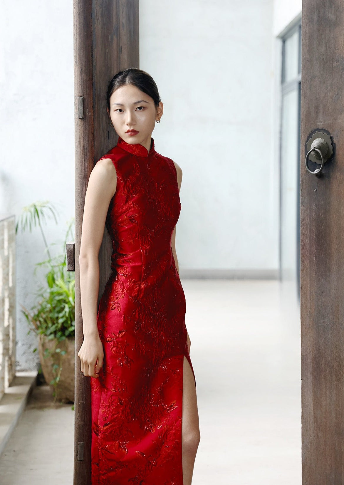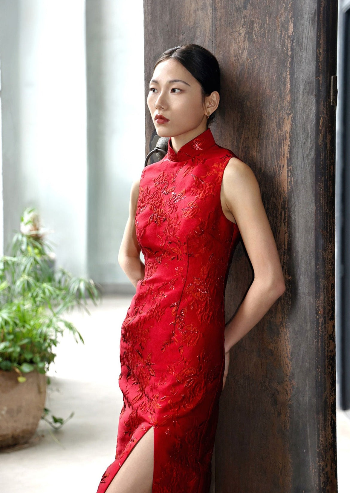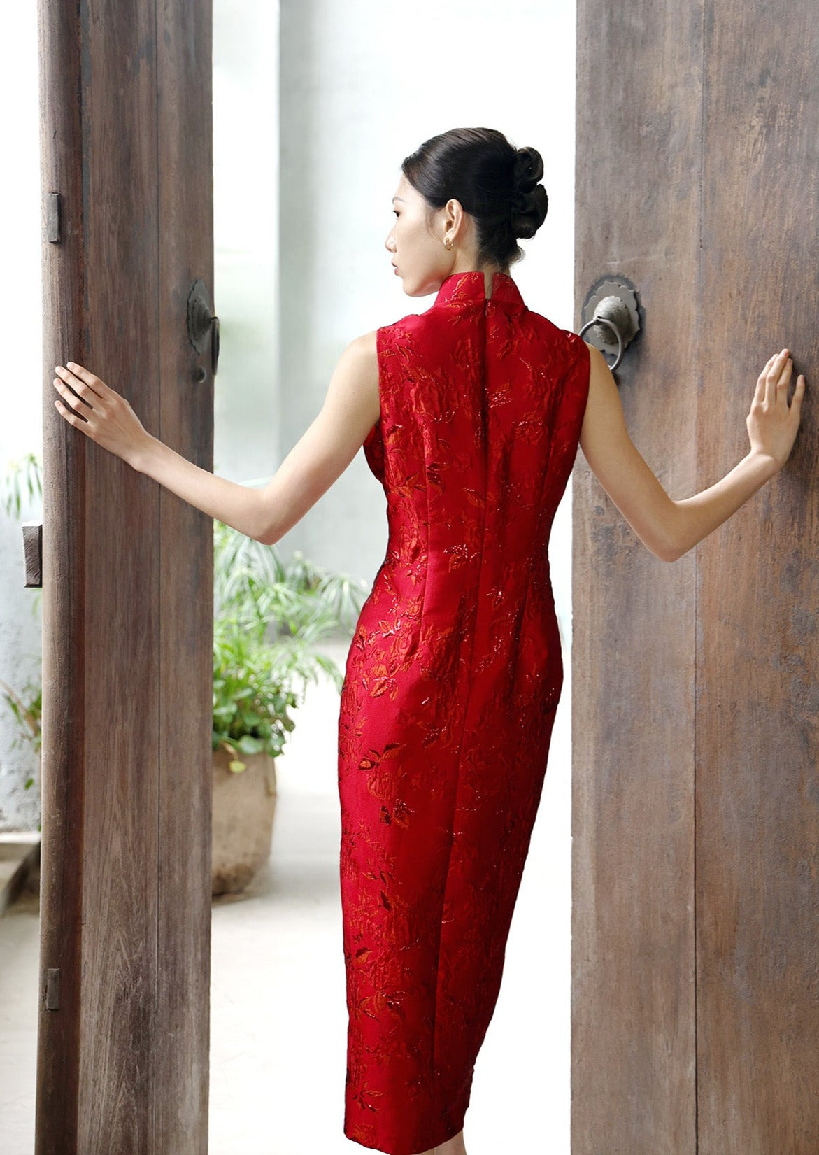 Perfect for tea ceremonies or civil ceremonies, our Canna sleeveless brocade qipao is cut from shimmering floral-brocade. Designed for a slim fit, it features a mandarin collar and a front slit for easy movement and a chance to show off some legs. Pair with metallic jewelry and shoes to complete your look.