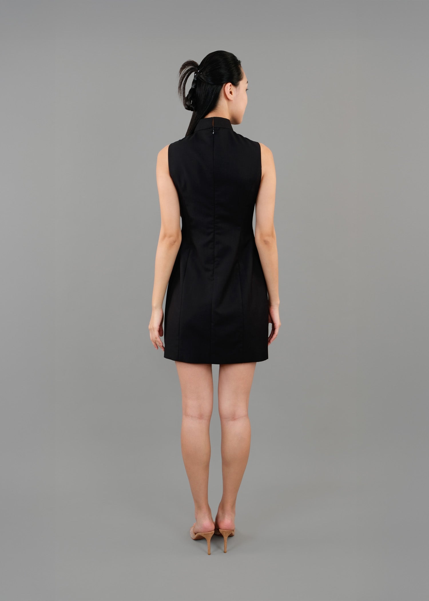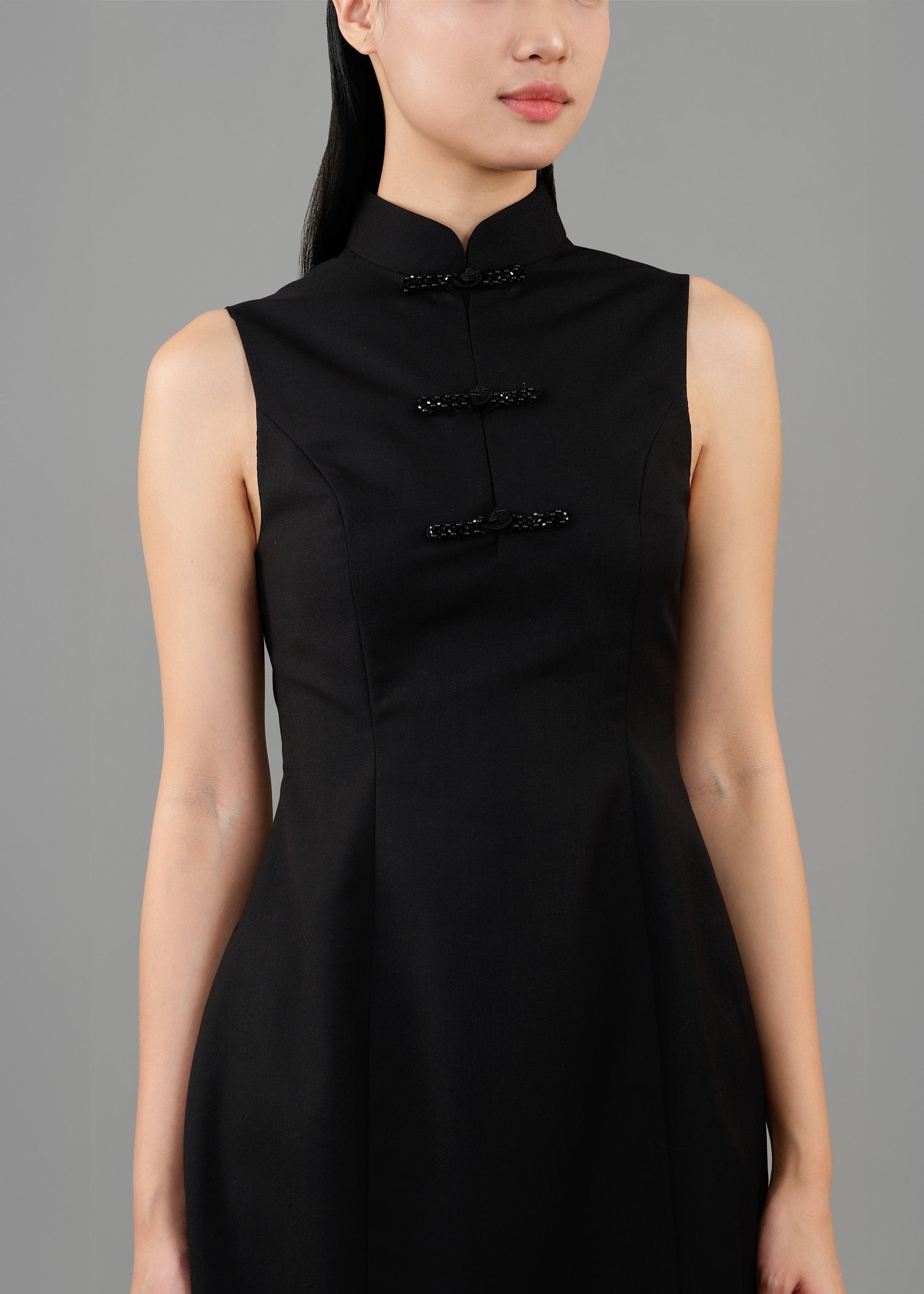 Our Sleeveless A-line Mini Qipao offers a refined A-line silhouette for a flattering fit that suits all body types. It features our signature mandarin collar matched with decorative pankou buttons that provide a stylish accent and a touch of elegance. Ideal for making a sophisticated statement at any event, this dress combines timeless detail with contemporary design.
