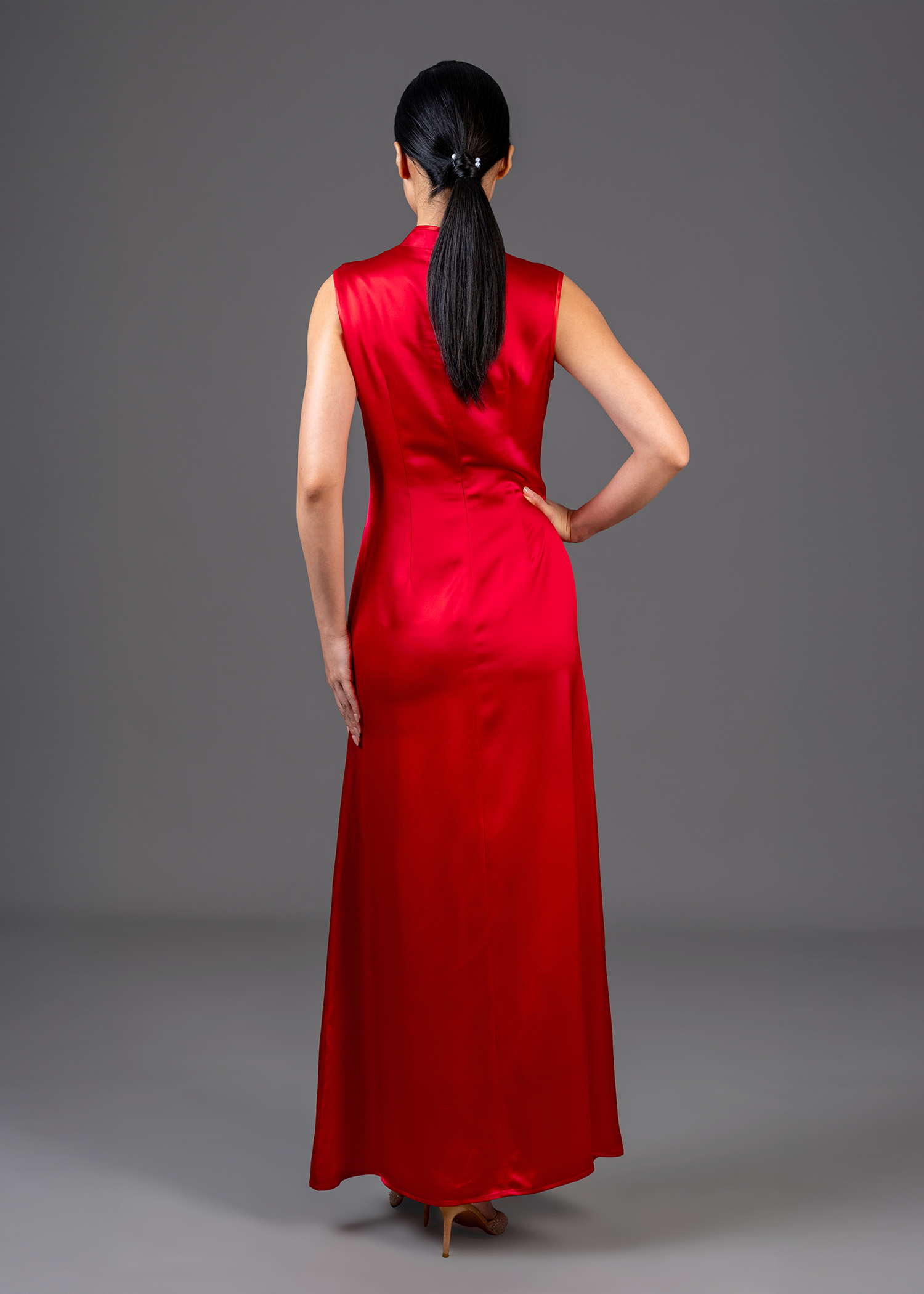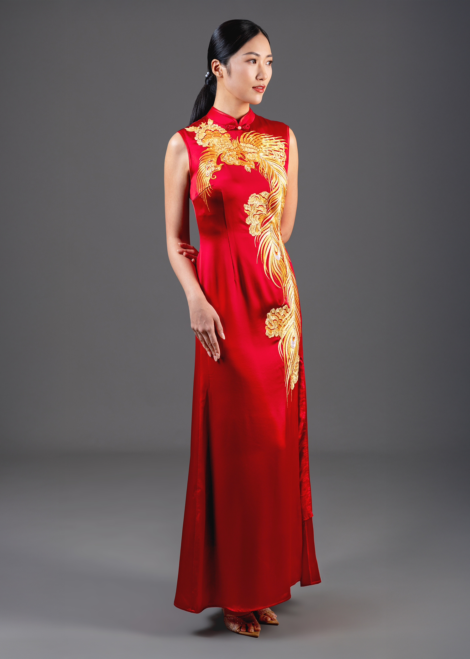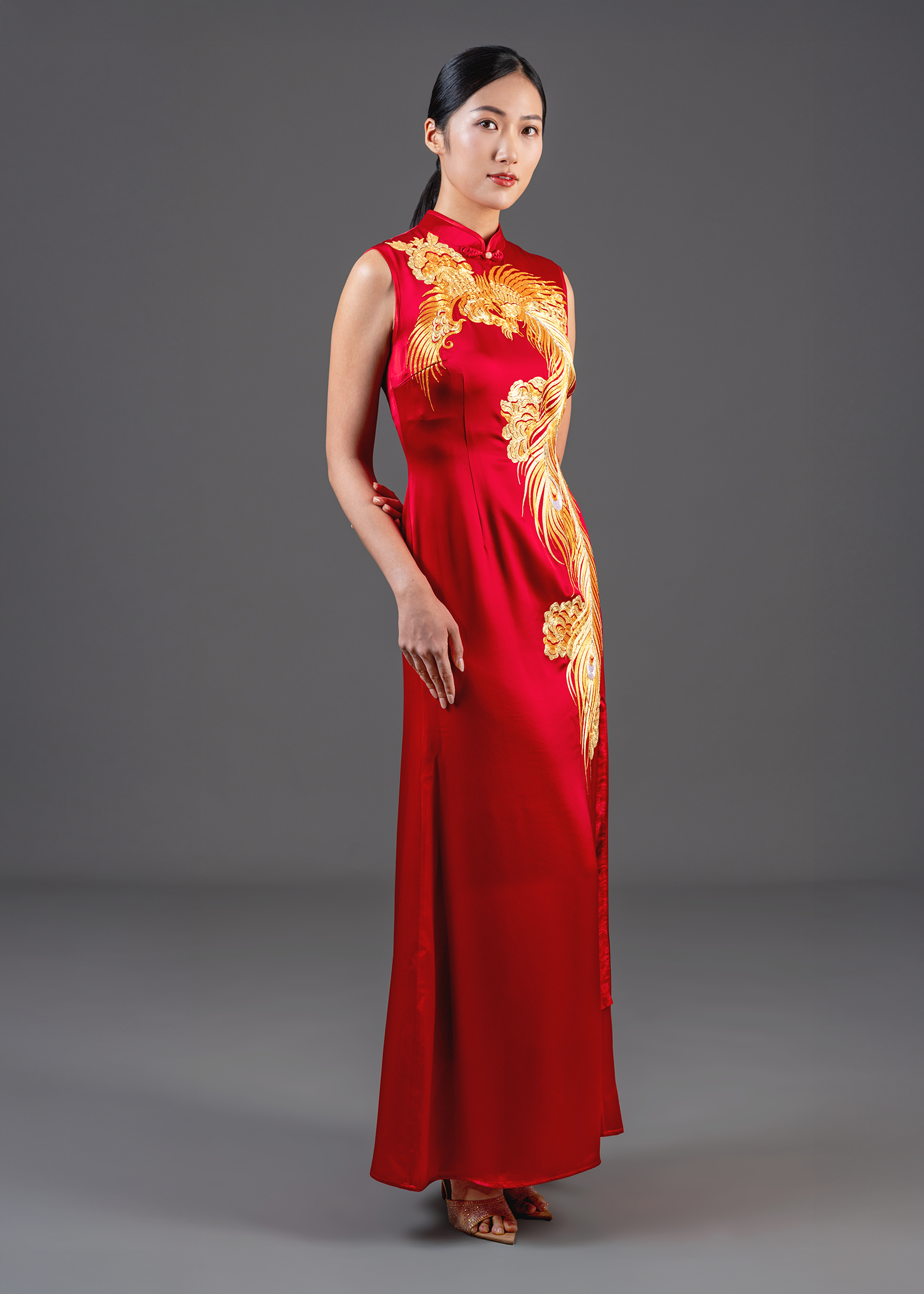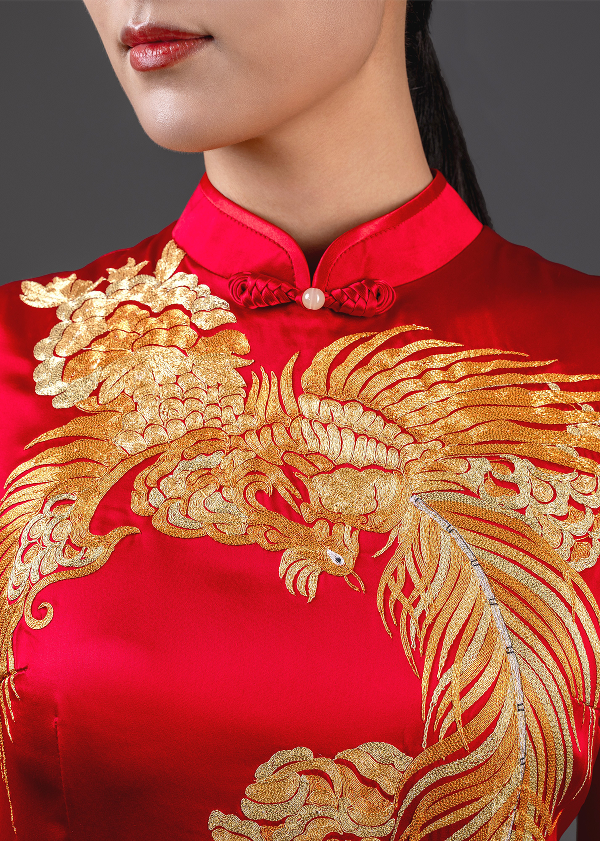 Embrace the perfect blend of contemporary style and traditional allure with our Gloriosa Lily Phoenix Qipao. Made from a heavyweight satin, this qipao showcases a delicate mermaid silhouette, sexy fun, front slit, and exquisite hand-embroidered classic phoenix motifs by our skilled silk tailor. A captivating and refined choice for brides looking to honor their heritage while making a modern statement on their special day.
