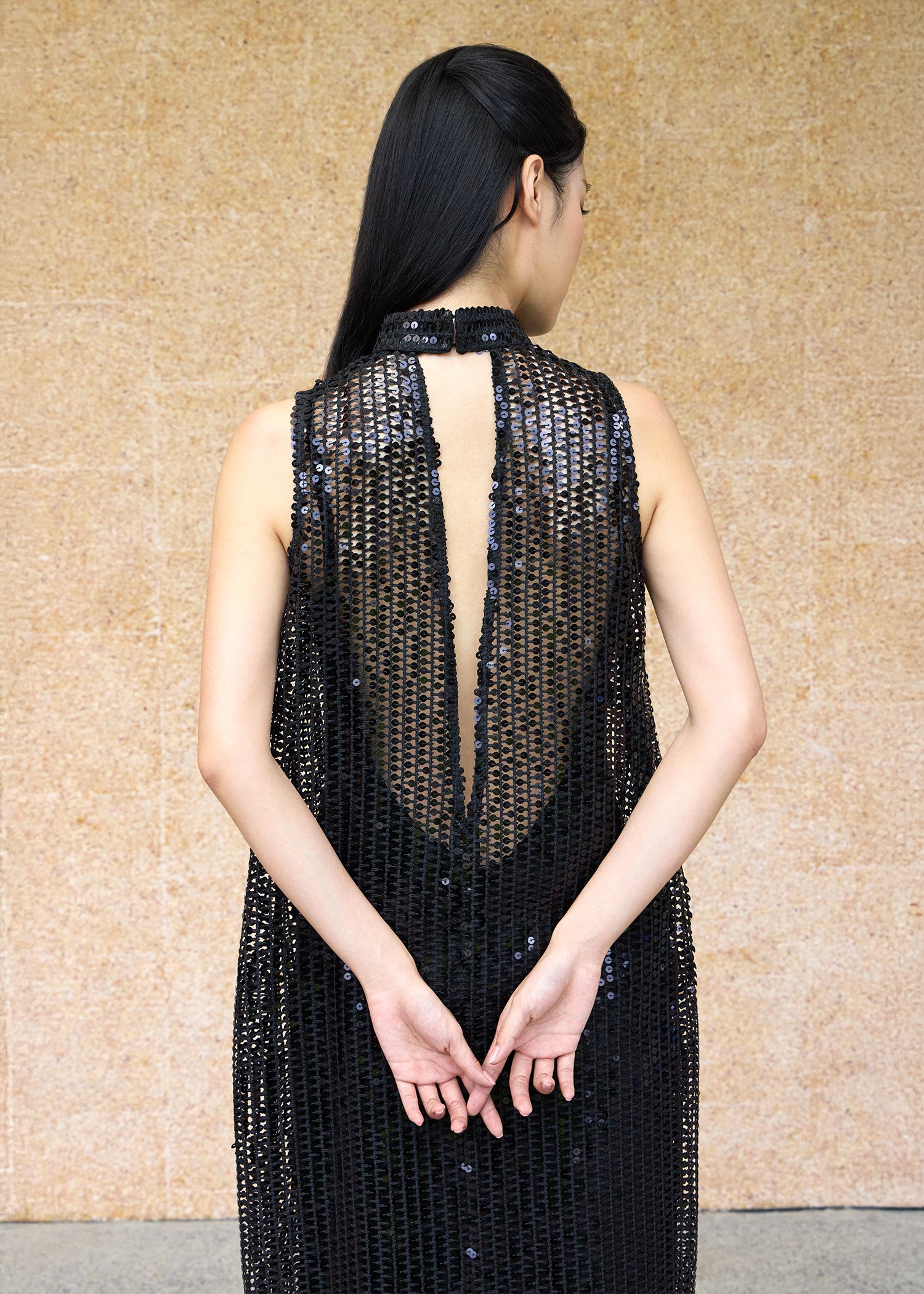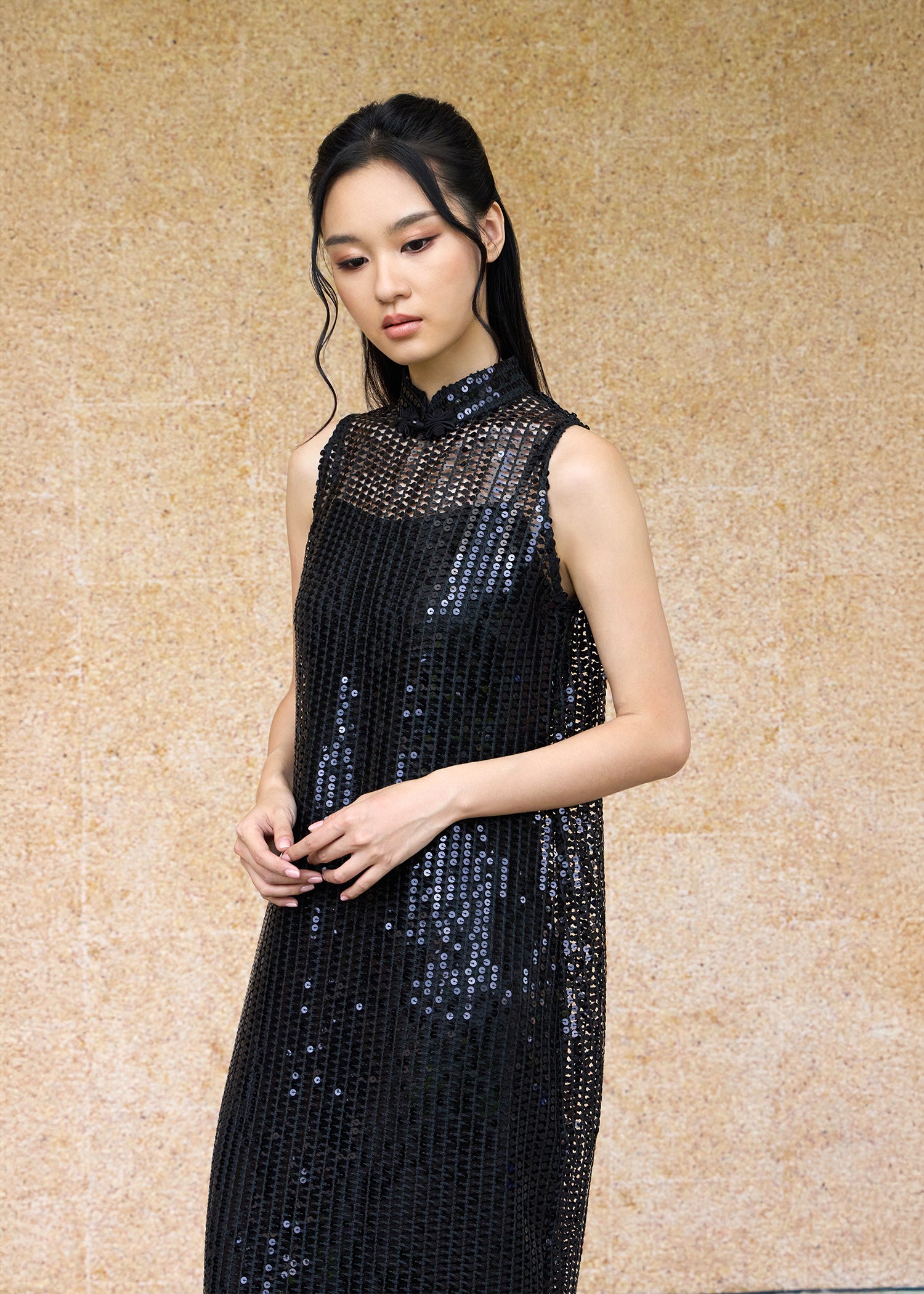 This two-piece lace and slip qipao dress has a cool, layered design. It's made from sheer sequinned lace in a shift silhouette matched with a slip for coverage. This is not a form fitting piece and is great for those who want something a bit more comfortable.