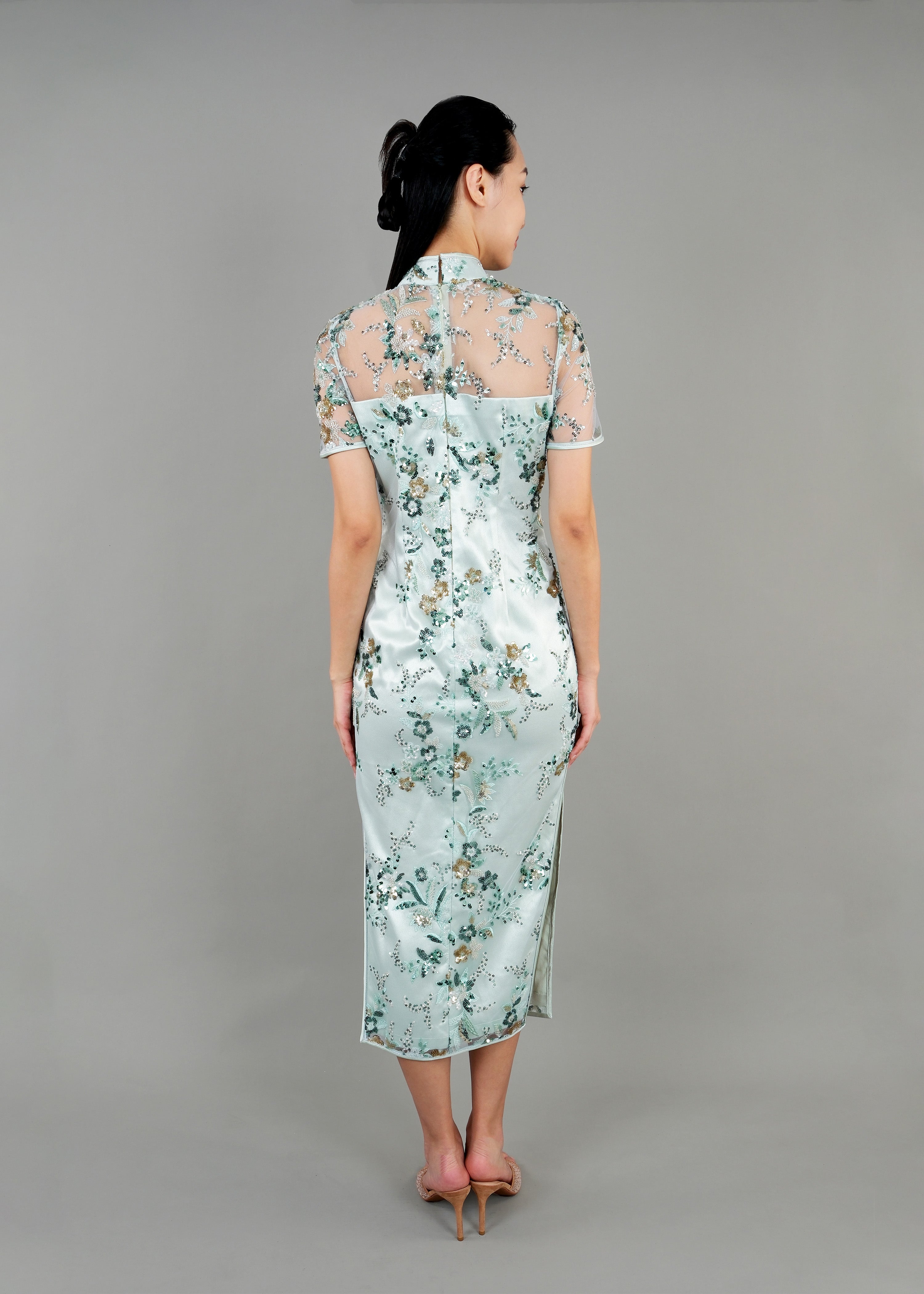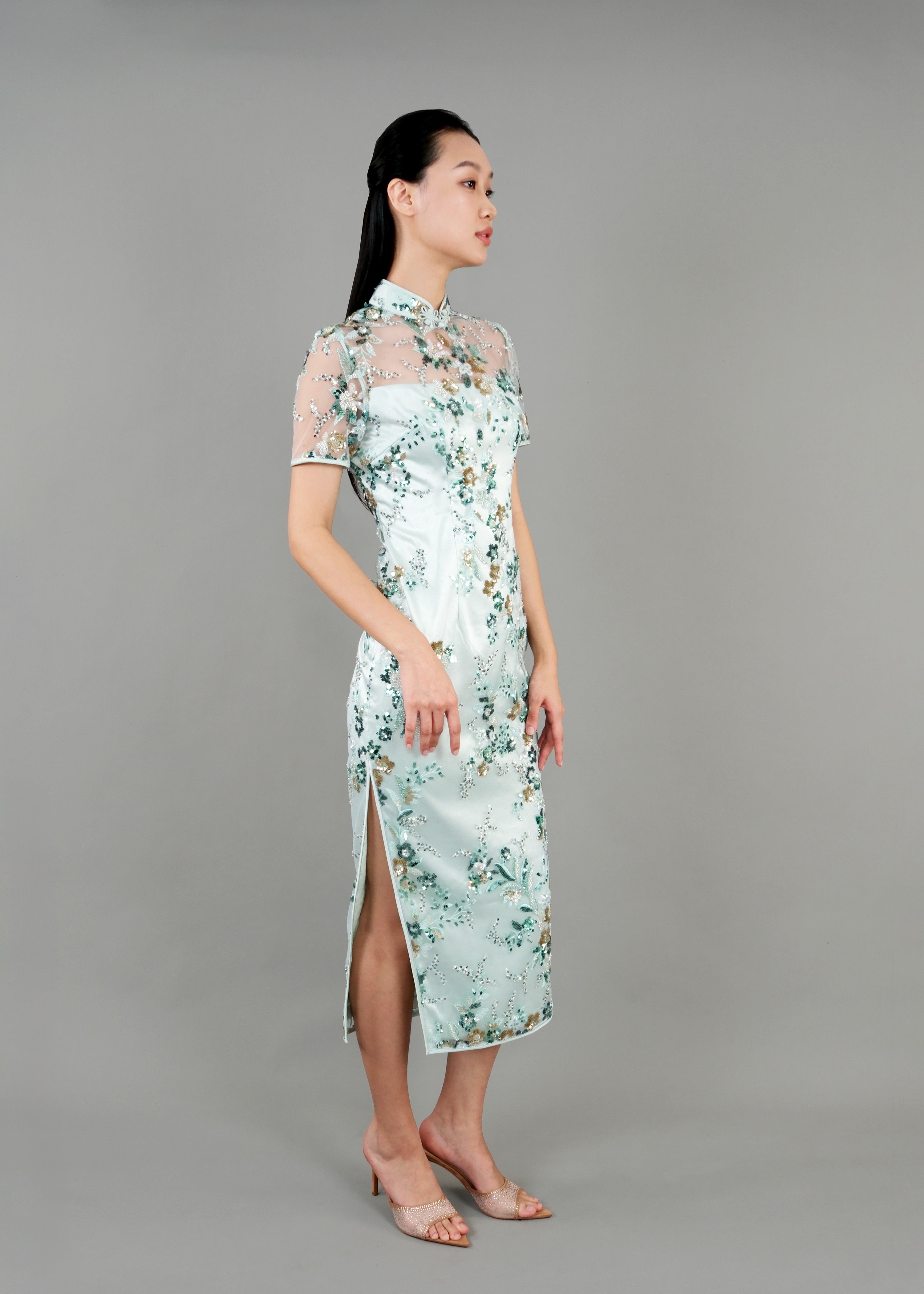 Hydrangea Short Sleeves Sequins Qipao (Light Green)