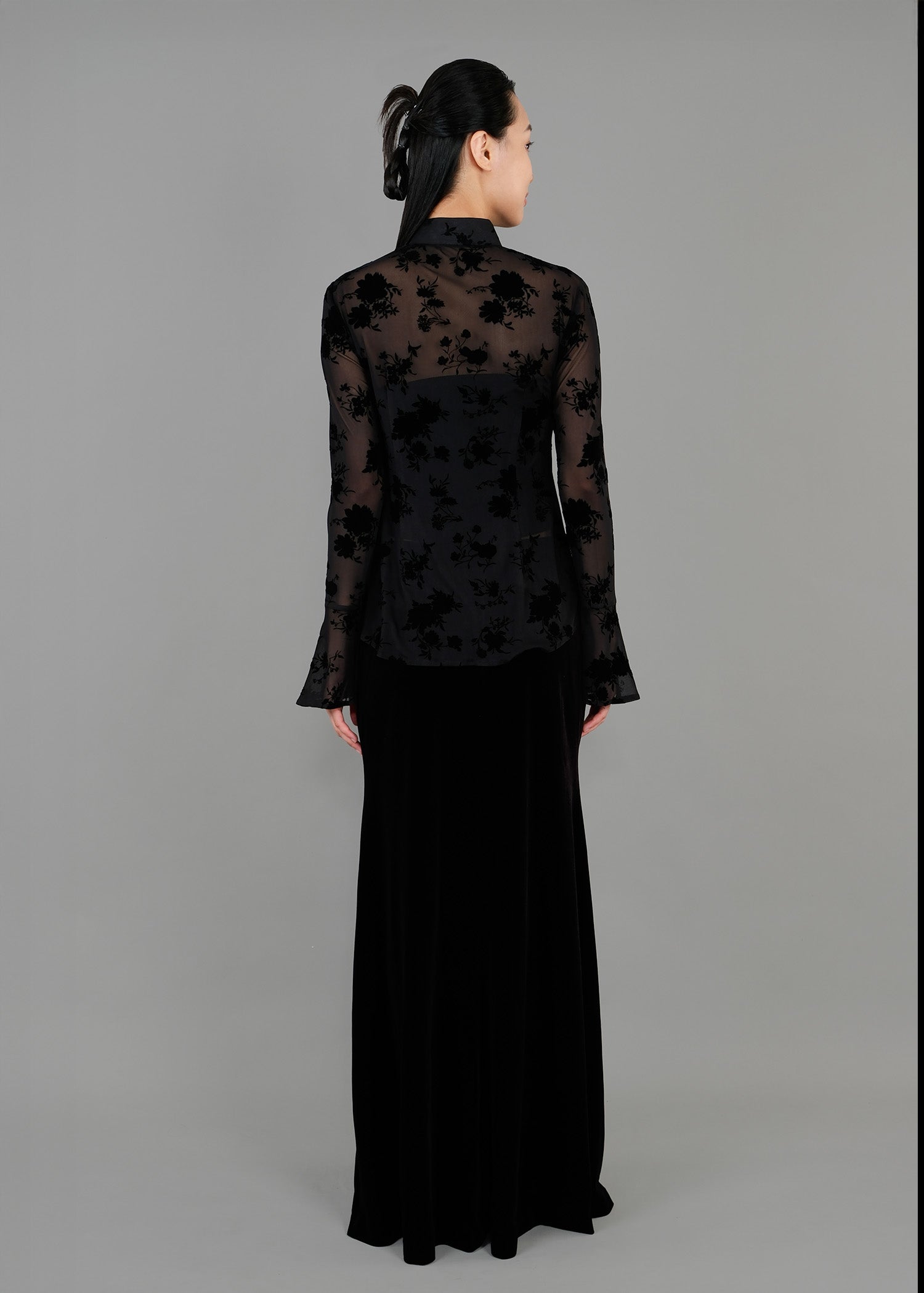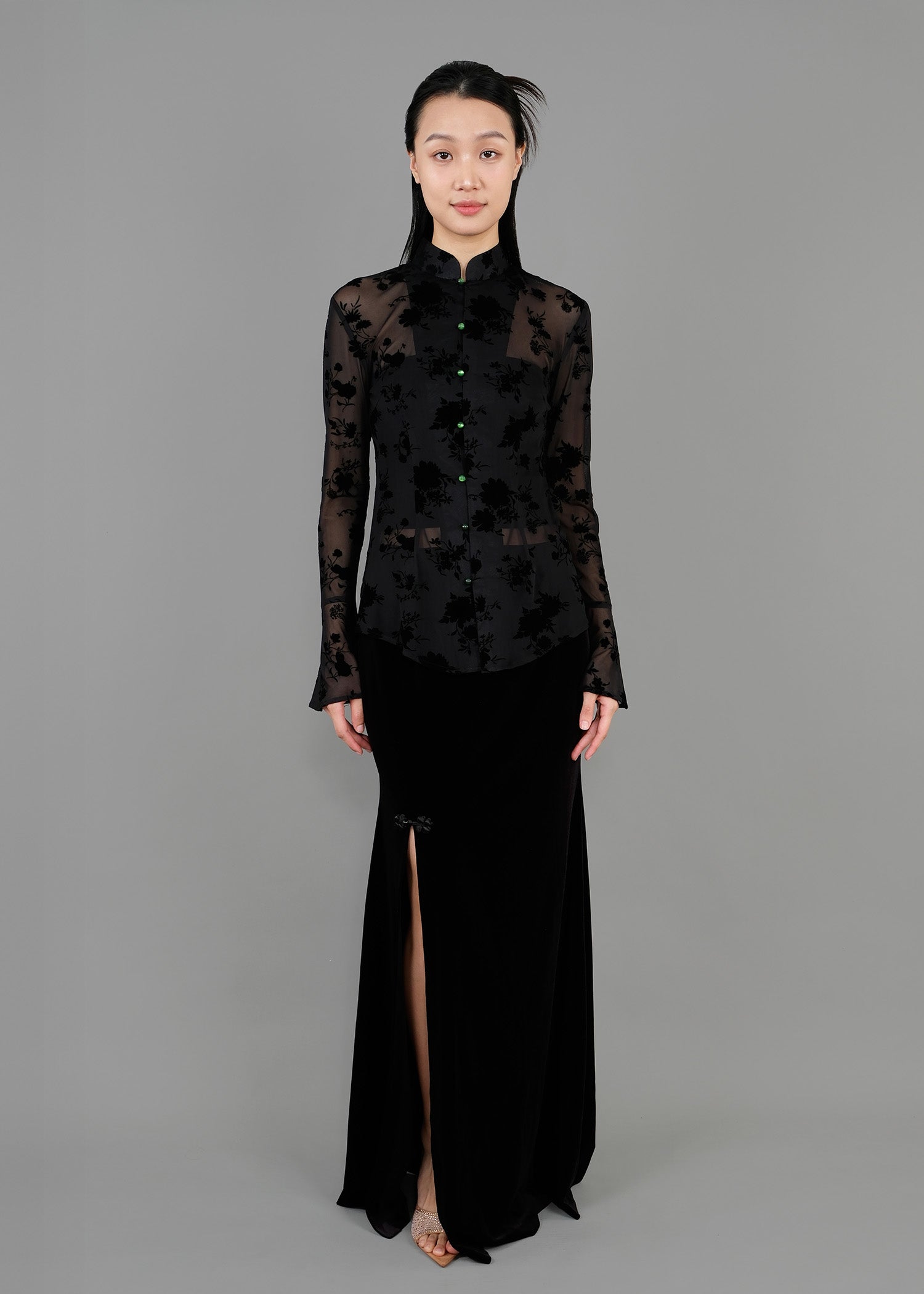 Our Floral Print Velvet Mandarin Blouse is woven with a romantic, floral strethcy sheer mesh that not only provides comfort but also elegance. The blouse is matched with striking contrast buttons for a playful twist. Layer over a camisole or bralette for additional coverage.