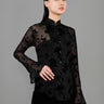 Long Sleeves Stretchy Floral Print Velvet Qipao Top (Black)