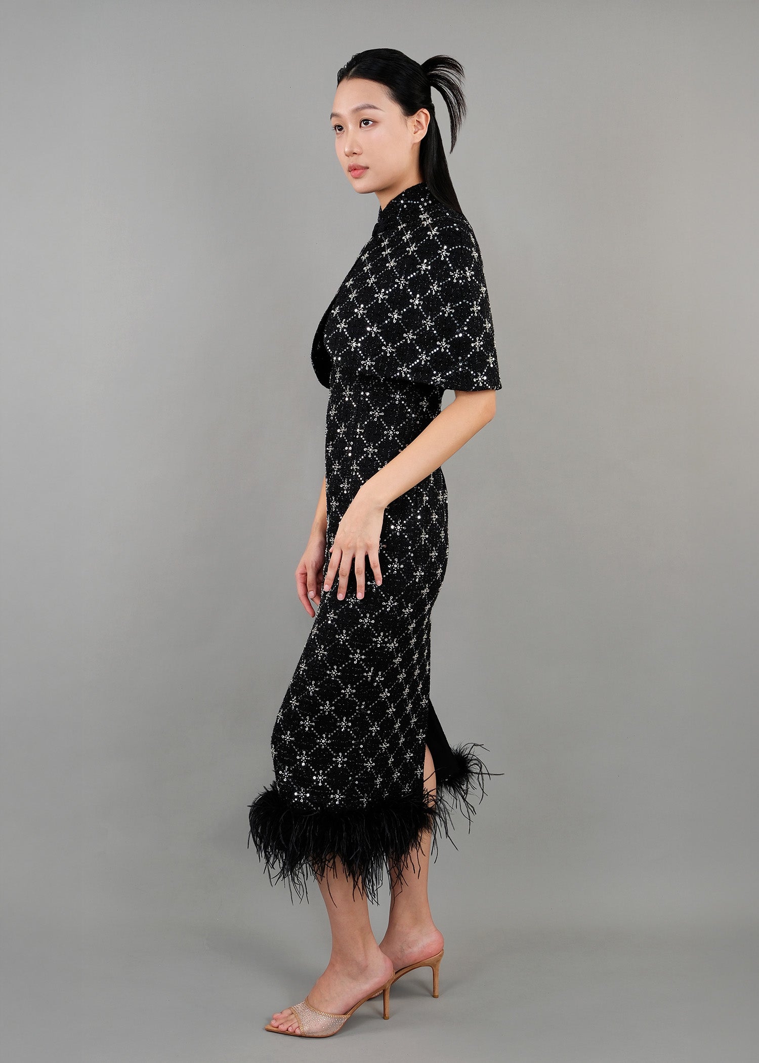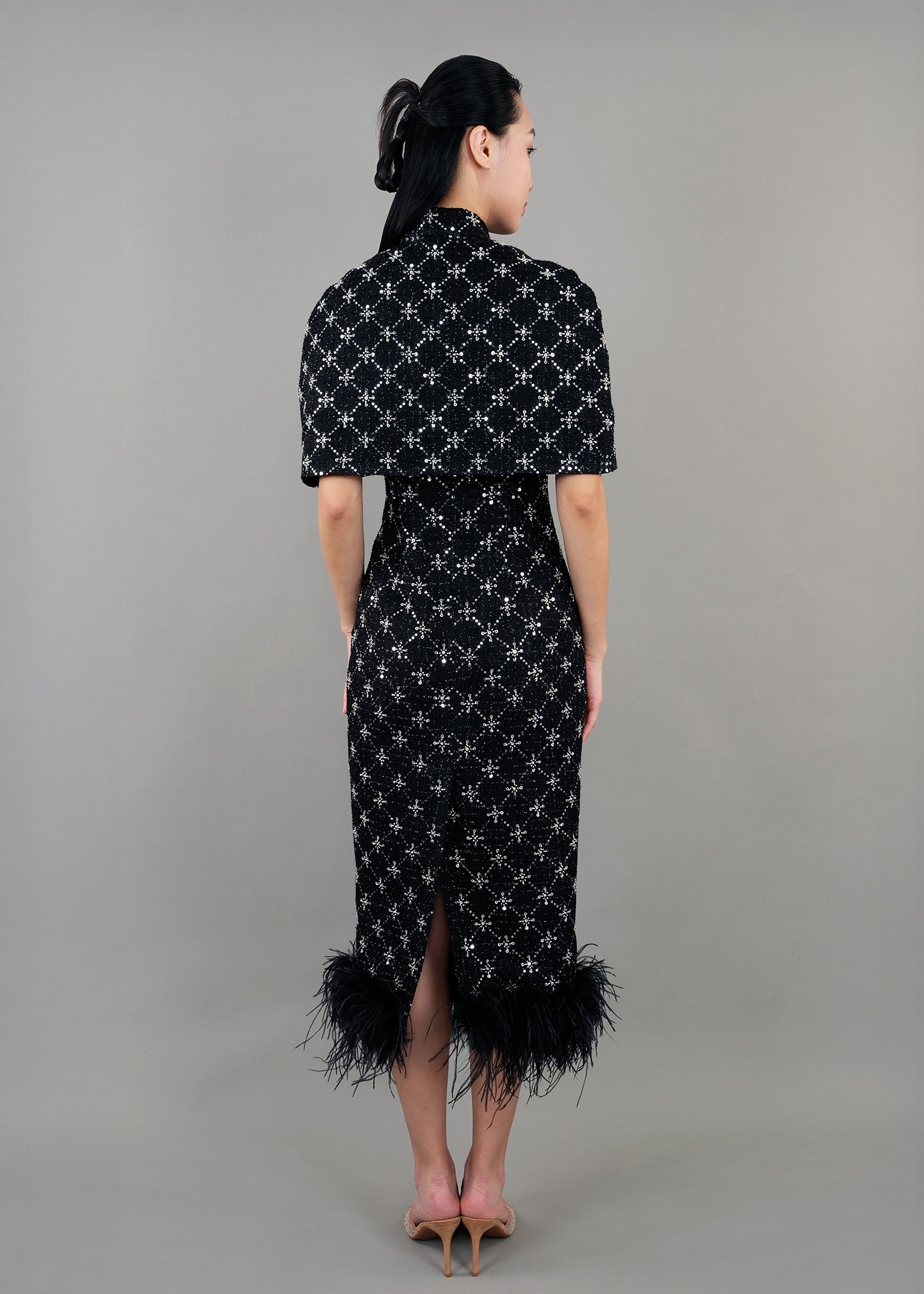 Our matching Viola cape can be paired with our Viola sleeveless tweed qipao or worn alone with a simple black dress. The cape features a mandarin collar with a pankou button and is great for the cooler weather. Crafted in a luxurious embroidered tweed.