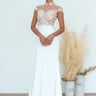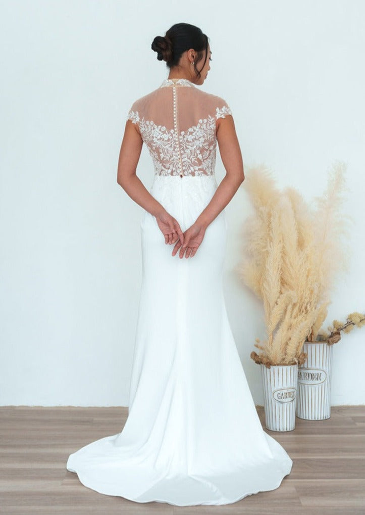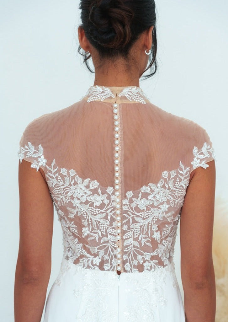 Ensure all eyes are on you at your wedding. The Amaryllis qipao features a mesh bodice embellished with lace, matched with a mermaid silhouette to accentuate your curves. This is a great choice as a reception or first dance dress. Style yours with jewelled heels.