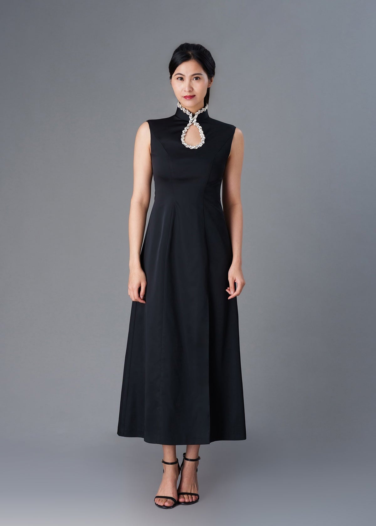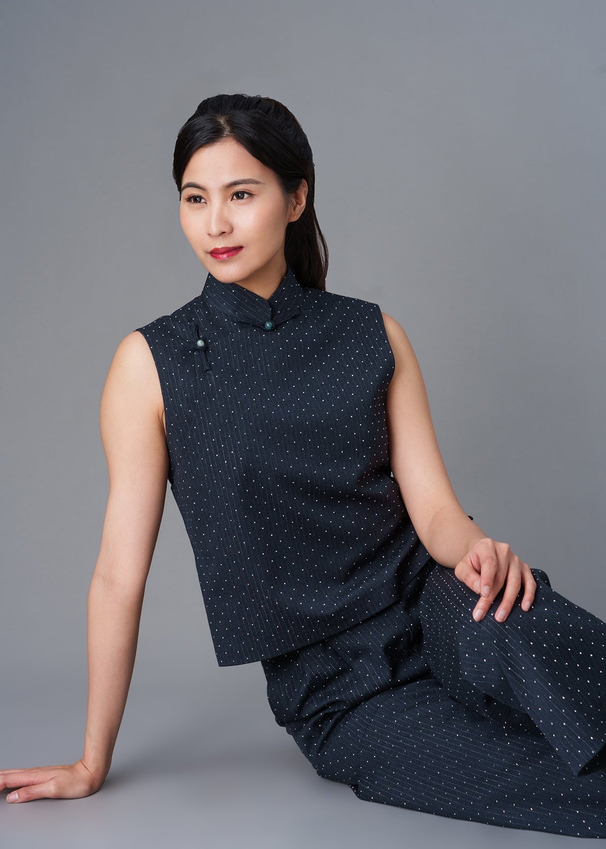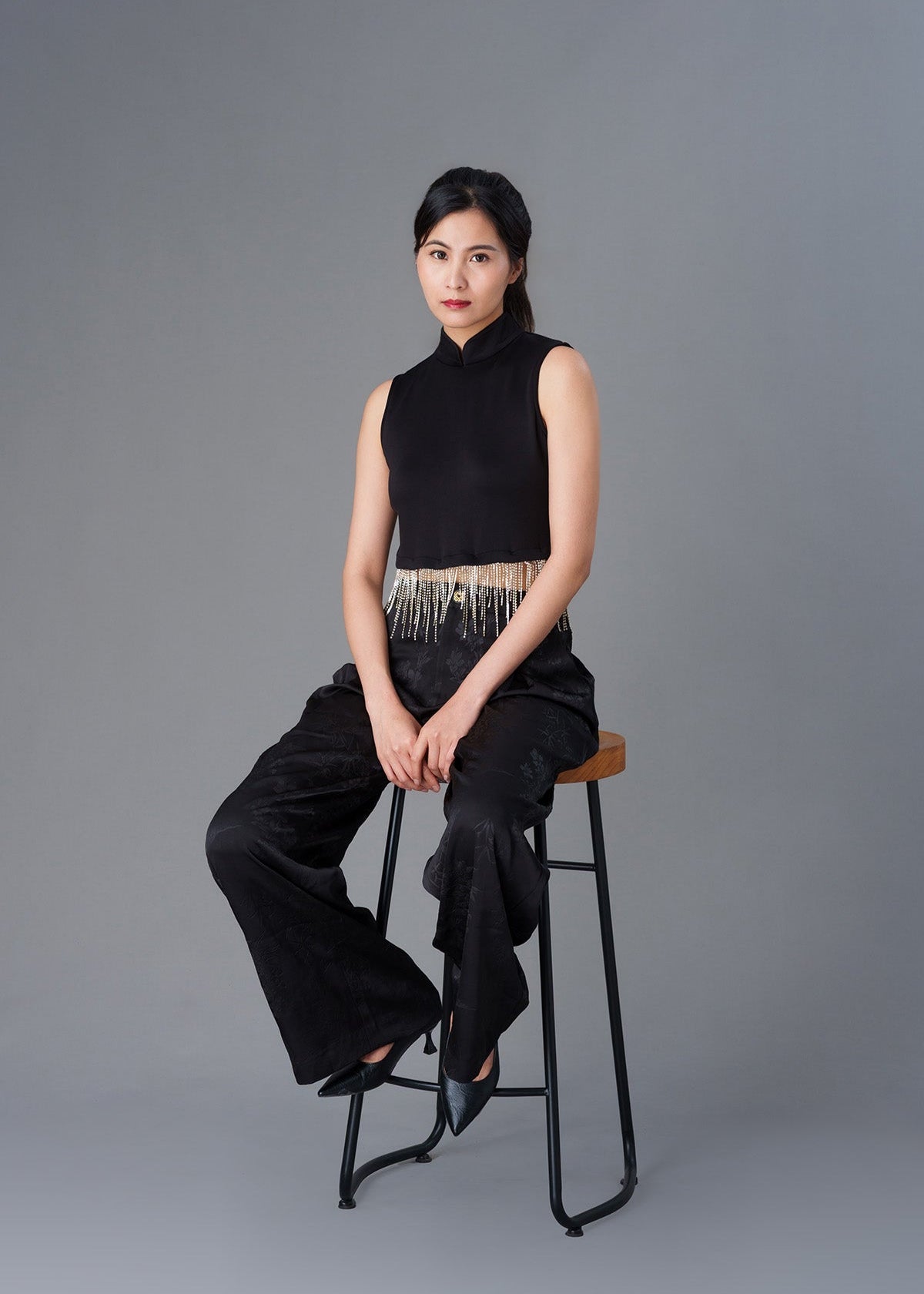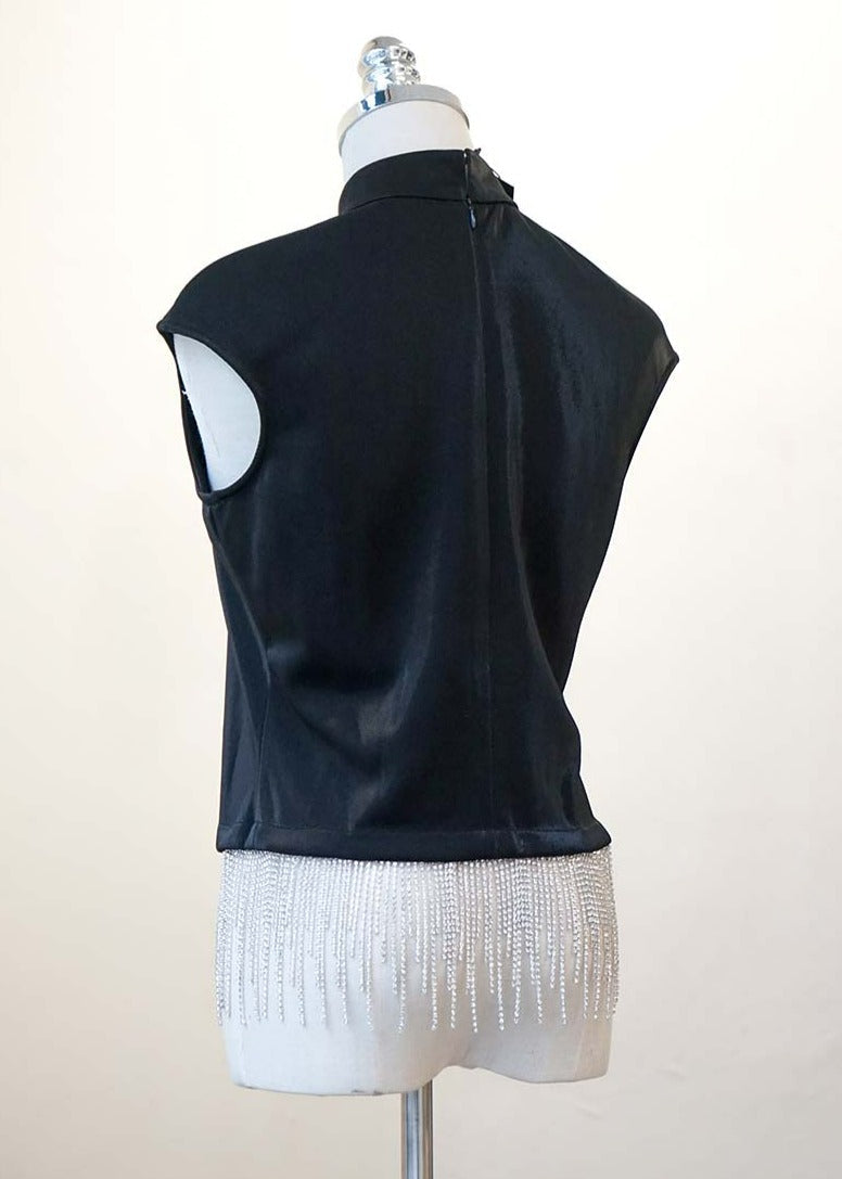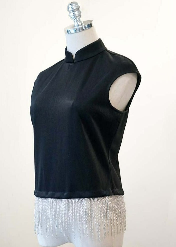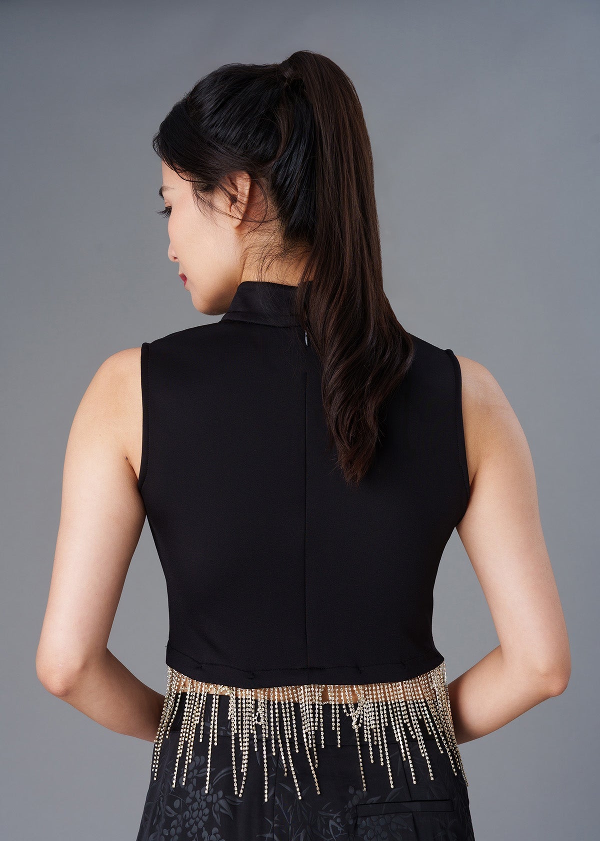 Cut from shiny black crepe for a close fit and trimmed with a row of detachable crystal embellished fringing along the cropped hem, this stunning piece is our definition of a modern qipao top. Wear it as a classic plain black qipao top with a skirt or pants for work and add the crystal fringing for party look for a dress up dinner.
