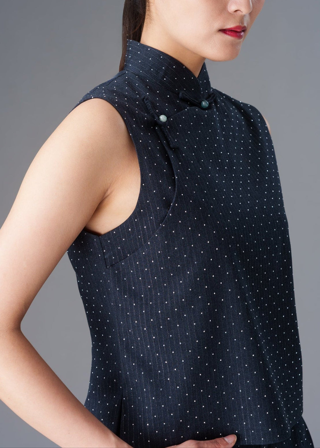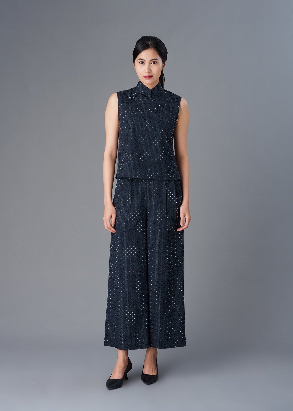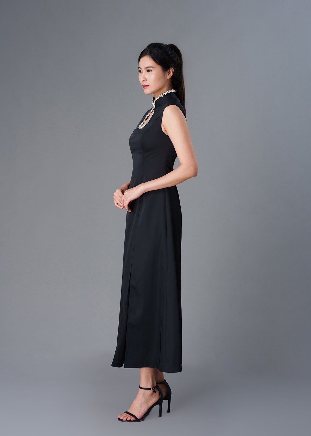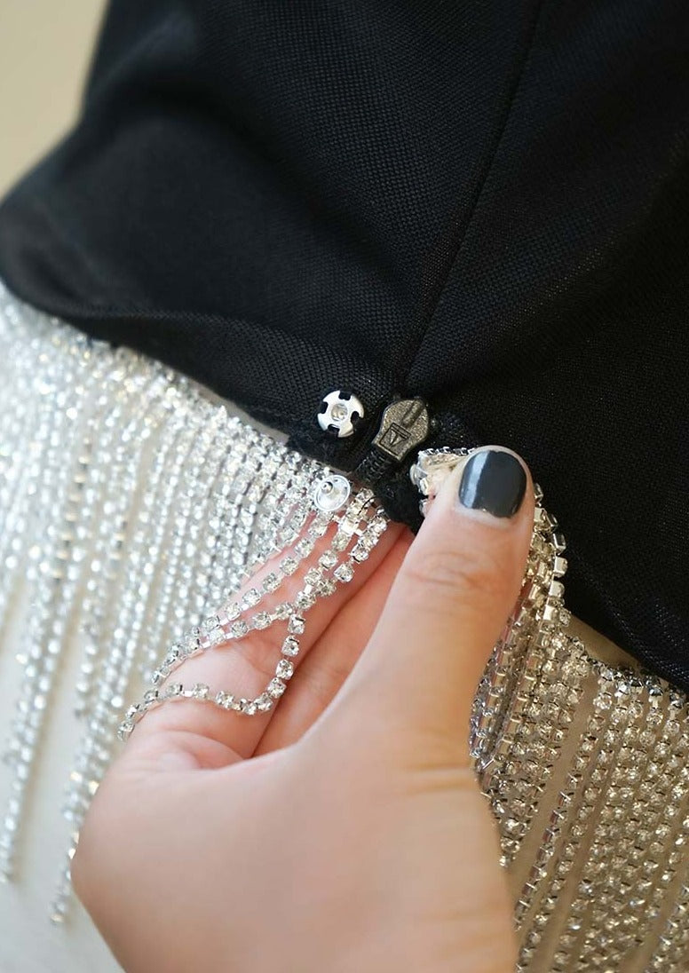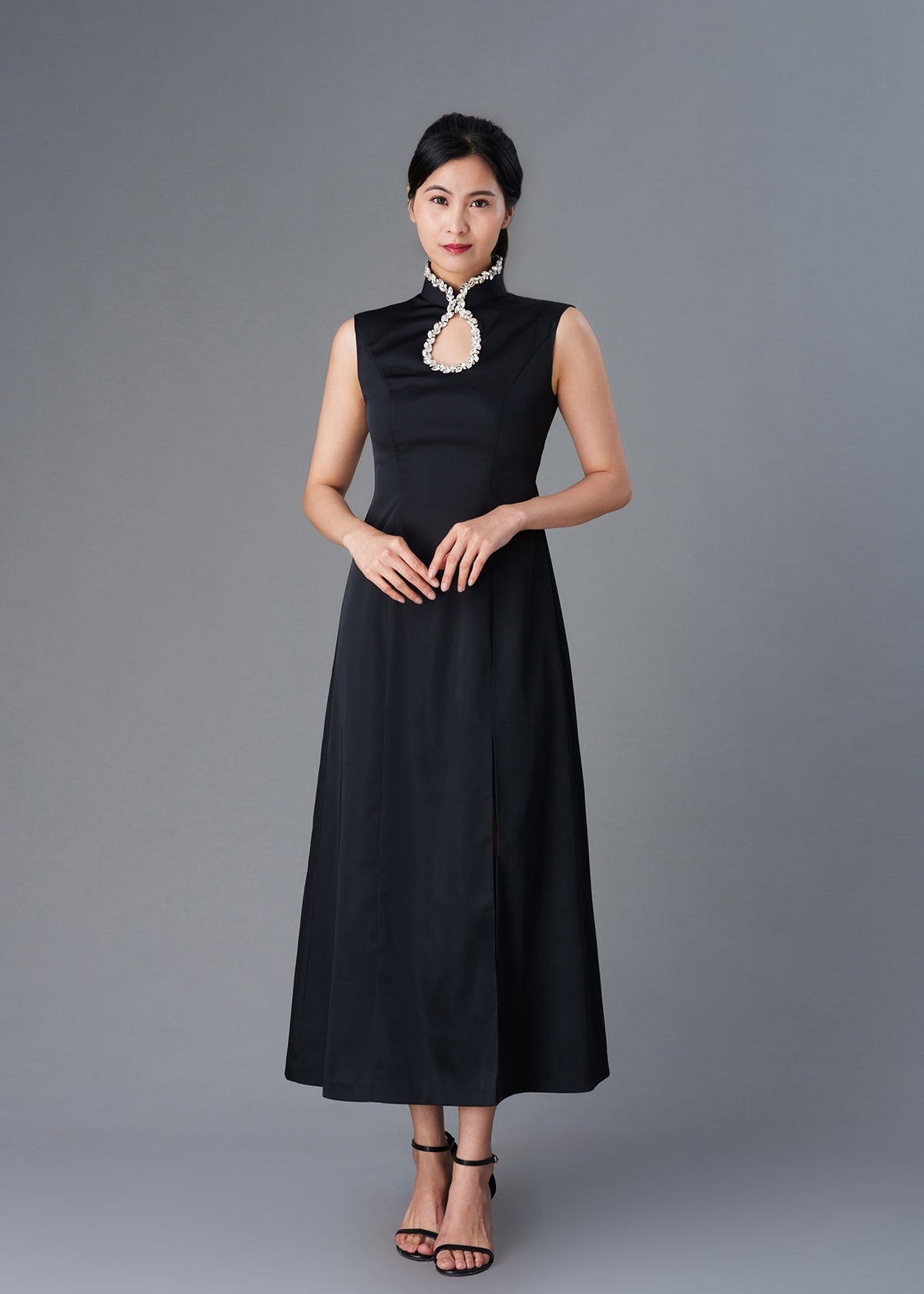 Cut from shiny black crepe for a close fit and trimmed with a row of detachable crystal embellished fringing along the cropped hem, this stunning piece is our definition of a modern qipao top. Wear it as a classic plain black qipao top with a skirt or pants for work and add the crystal fringing for party look for a dress up dinner.
