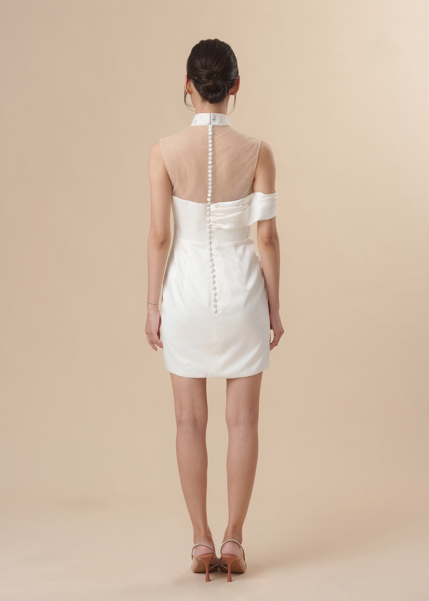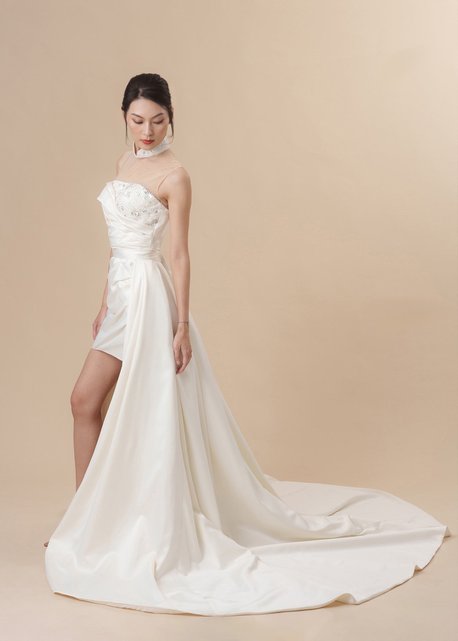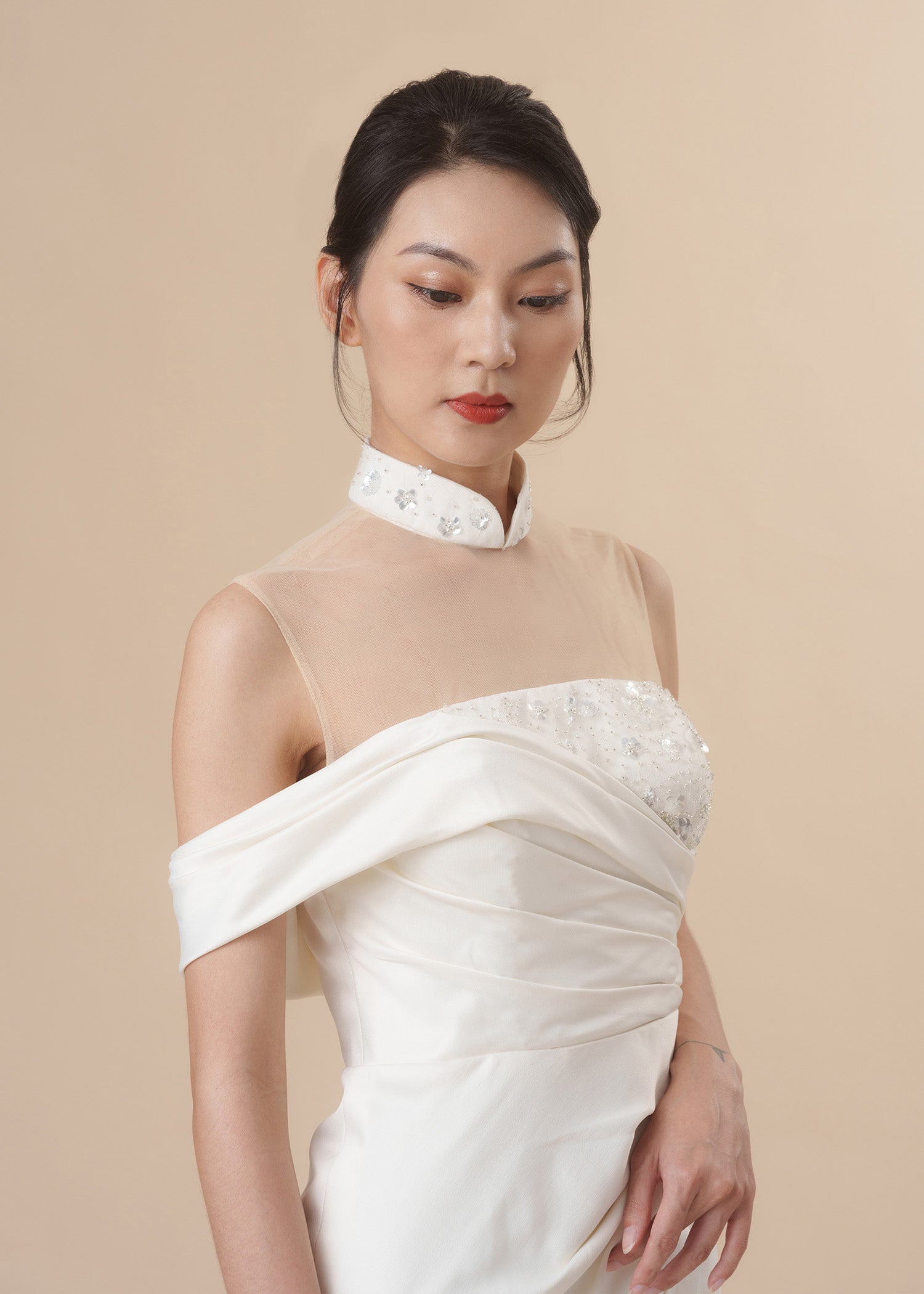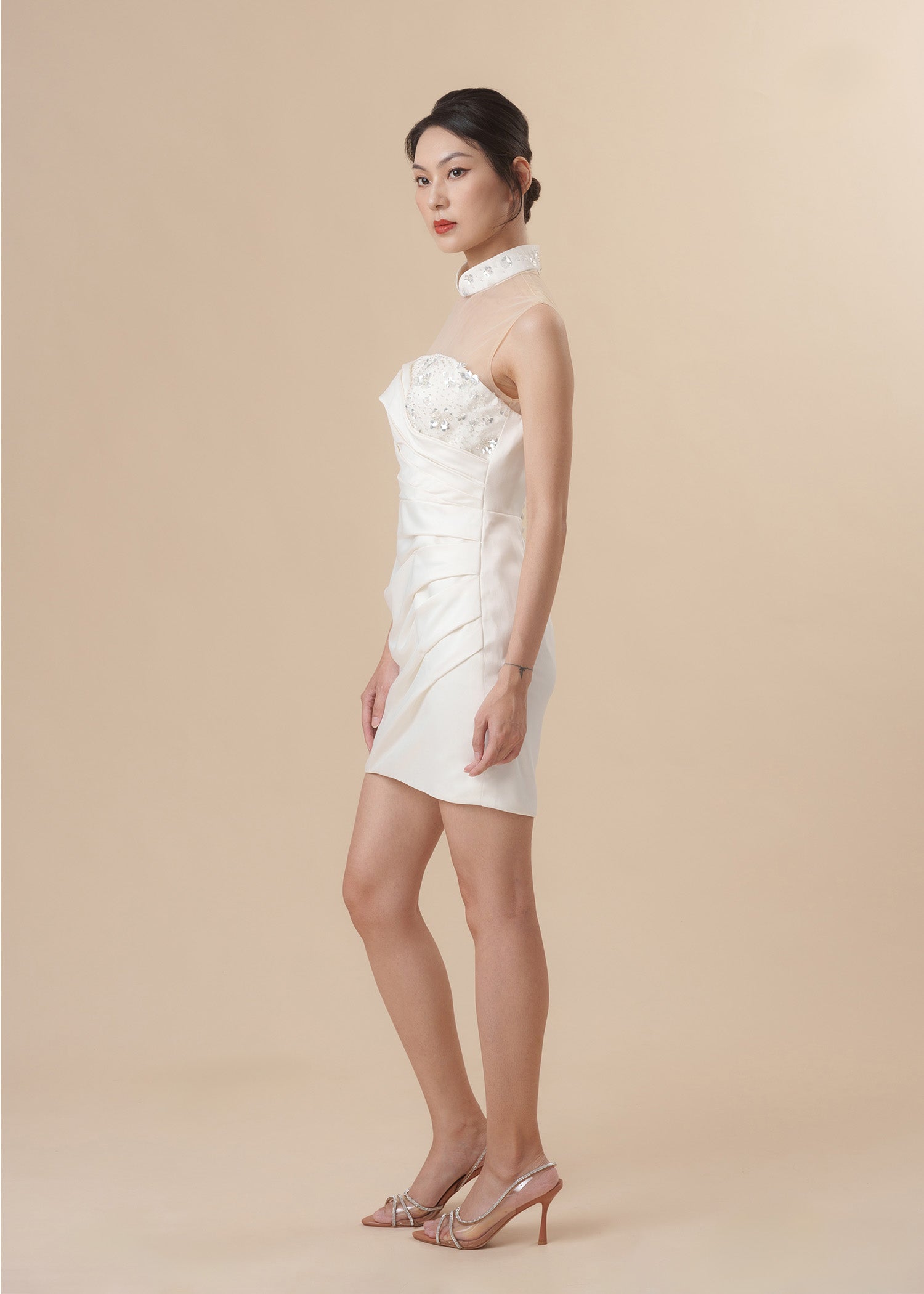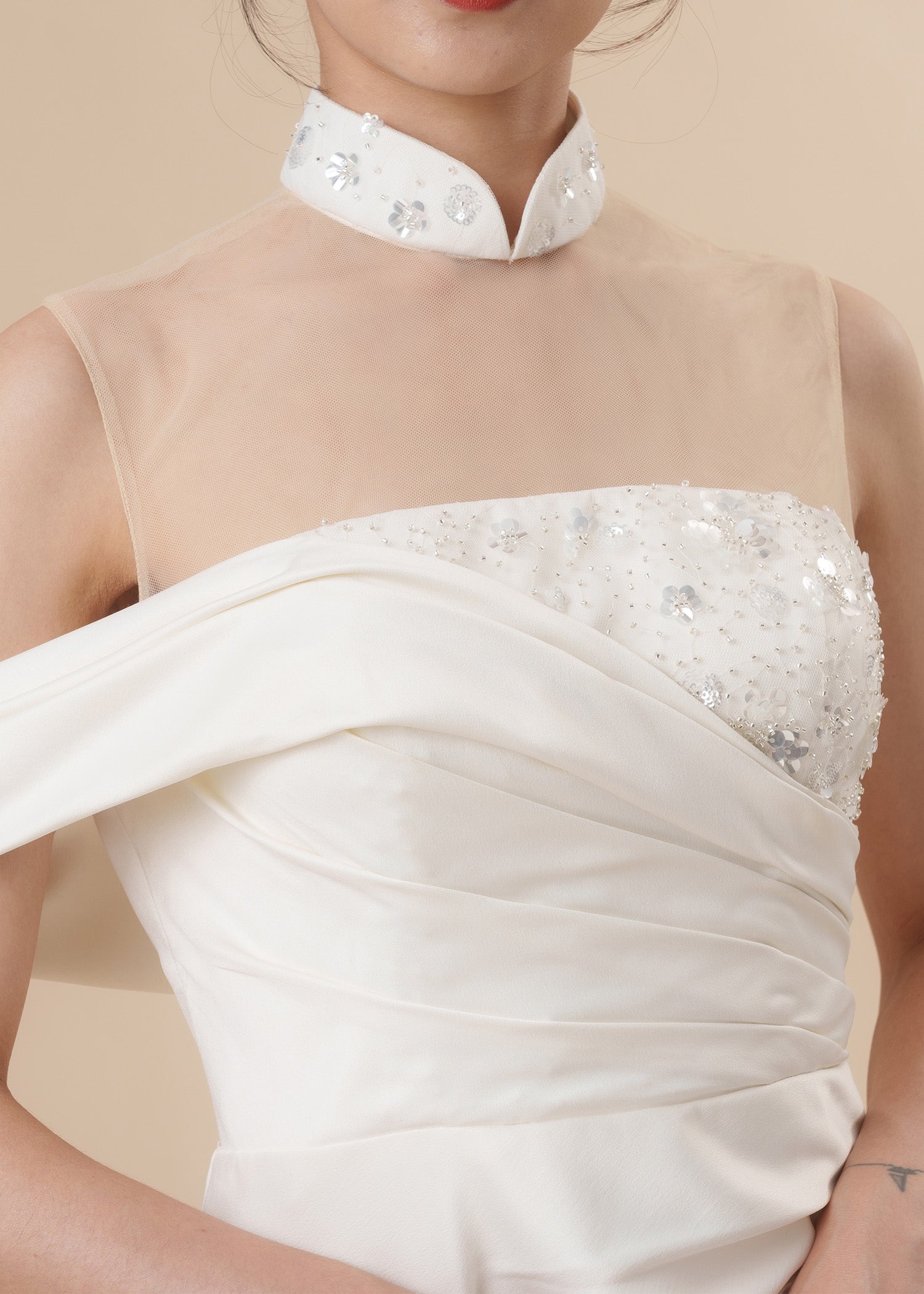 This mini bridal qipao combines classic elegance with contemporary charm. Made from luxurious satin, the dress is decorated with sparkling crystals that create a mesmerizing effect when they catch the light. The mini qipao is complemented by an A-line overskirt, complete with a dramatic train, making it the perfect choice for a seamless transition from ceremony to reception.