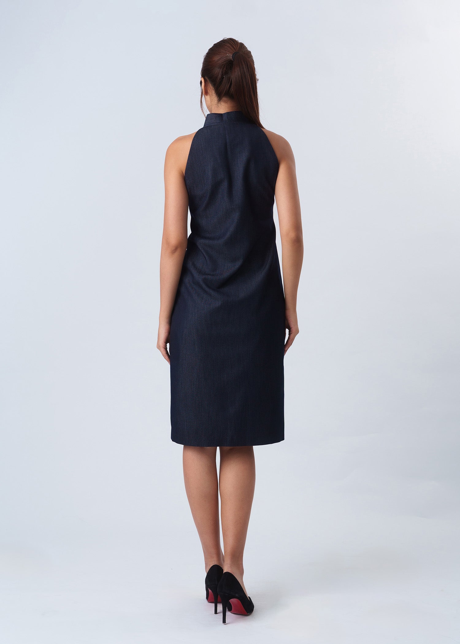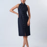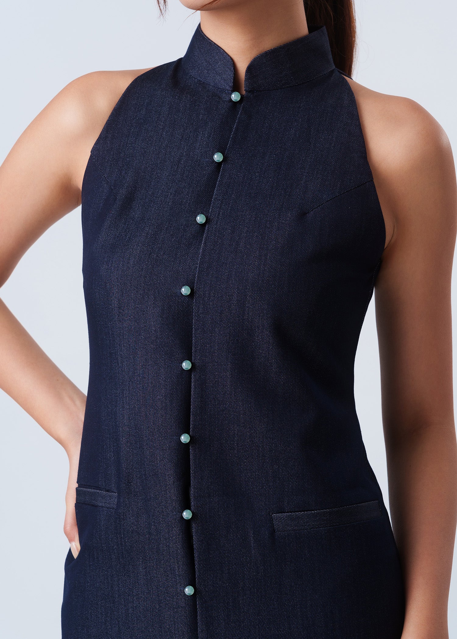 Discover versatility with our Halter Vest Qipao, featuring a row of jade buttons. Wear it buttoned up as a dress or leave it open and layer it over a tank top and jeans for a chic look. This piece combines comfort with a modern flair! Also available in off white cotton.
