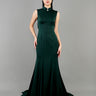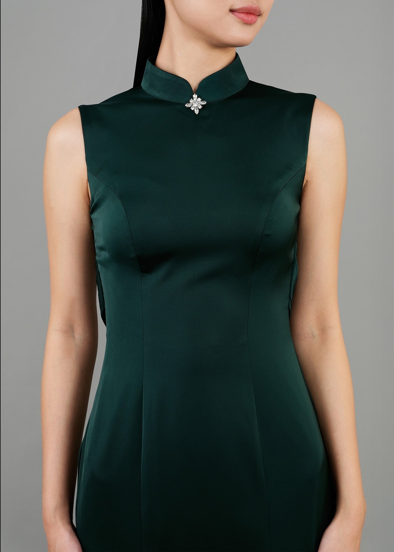 Our Atonement open back qipao features a mandarin collar adorned with a crystal brooch so you can skip your necklace. Made from satin crepe, the gown features a mermaid silhouette that flares out to a floor-skimming hem. We love the draped design a the back adding a hint of modern allure. Pair with metallic accessories.