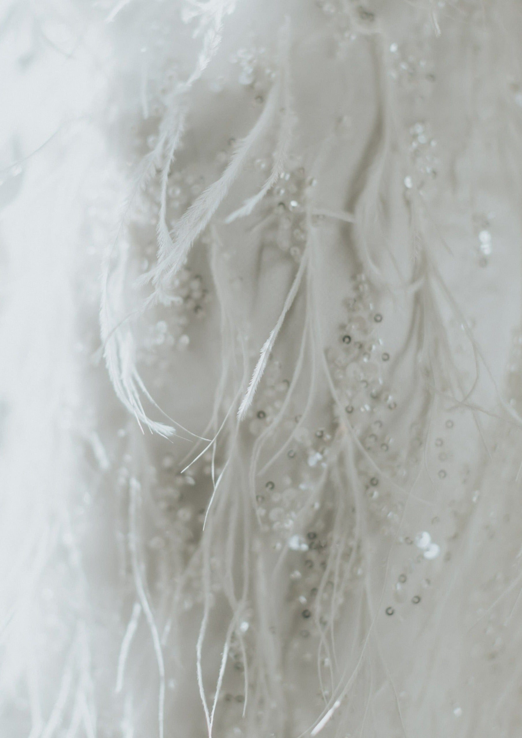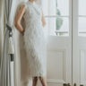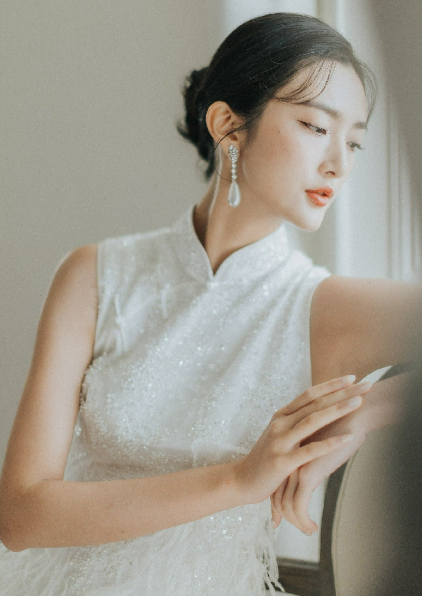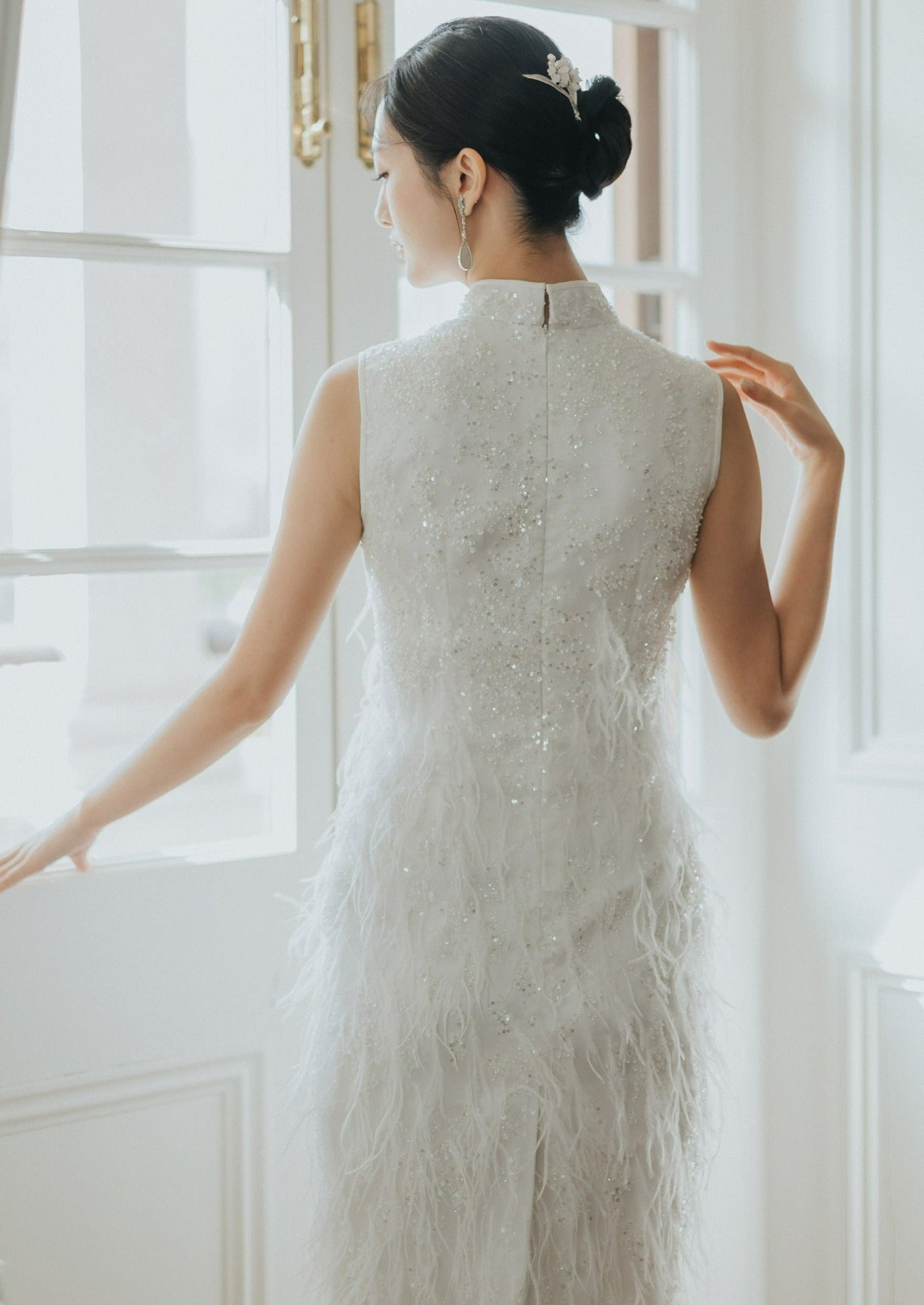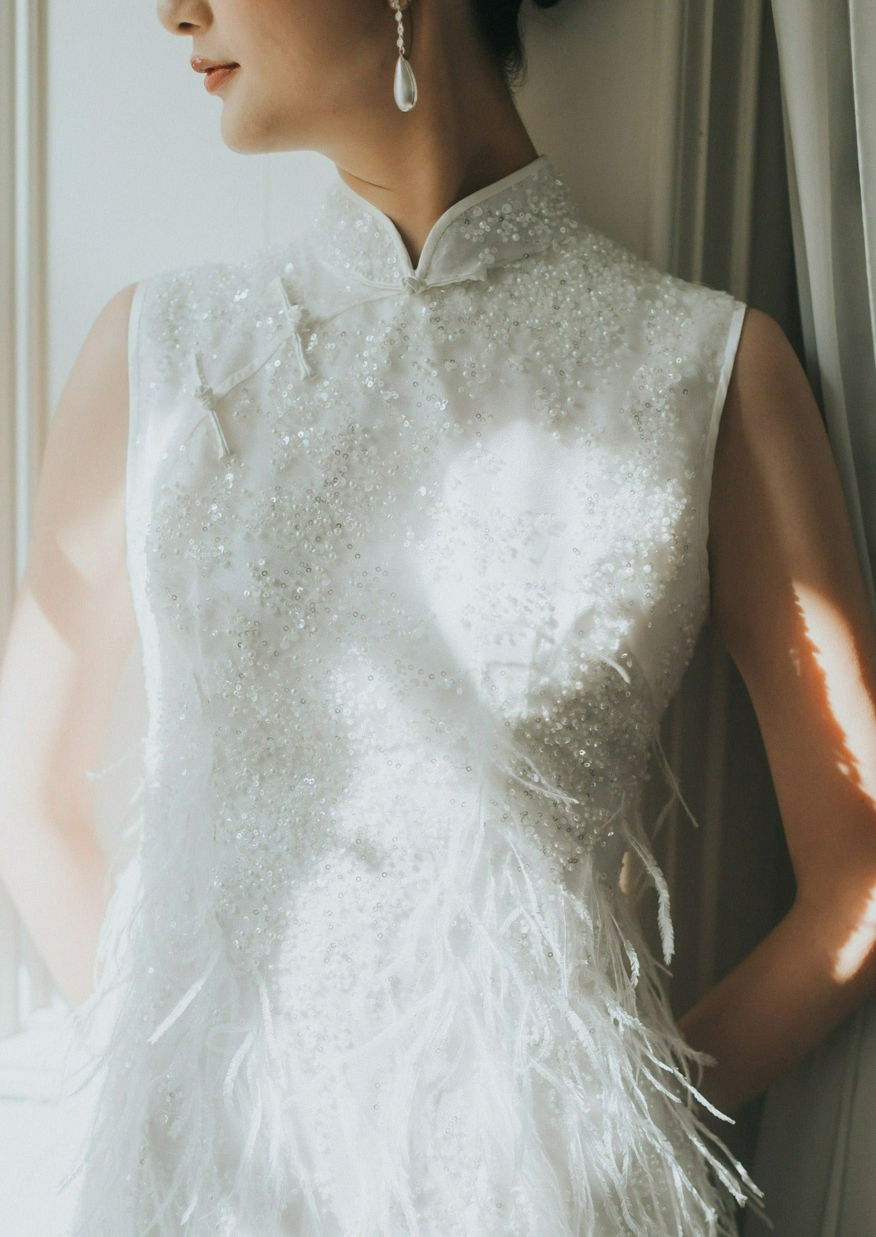 This exquisite qipao features a classic mandarin collar and is adorned with delicate feathers, creating a stunning, ethereal look. Embrace your inner goddess and complete the ensemble with minimalistic accessories and a soft, romantic updo for a truly captivating bridal style.