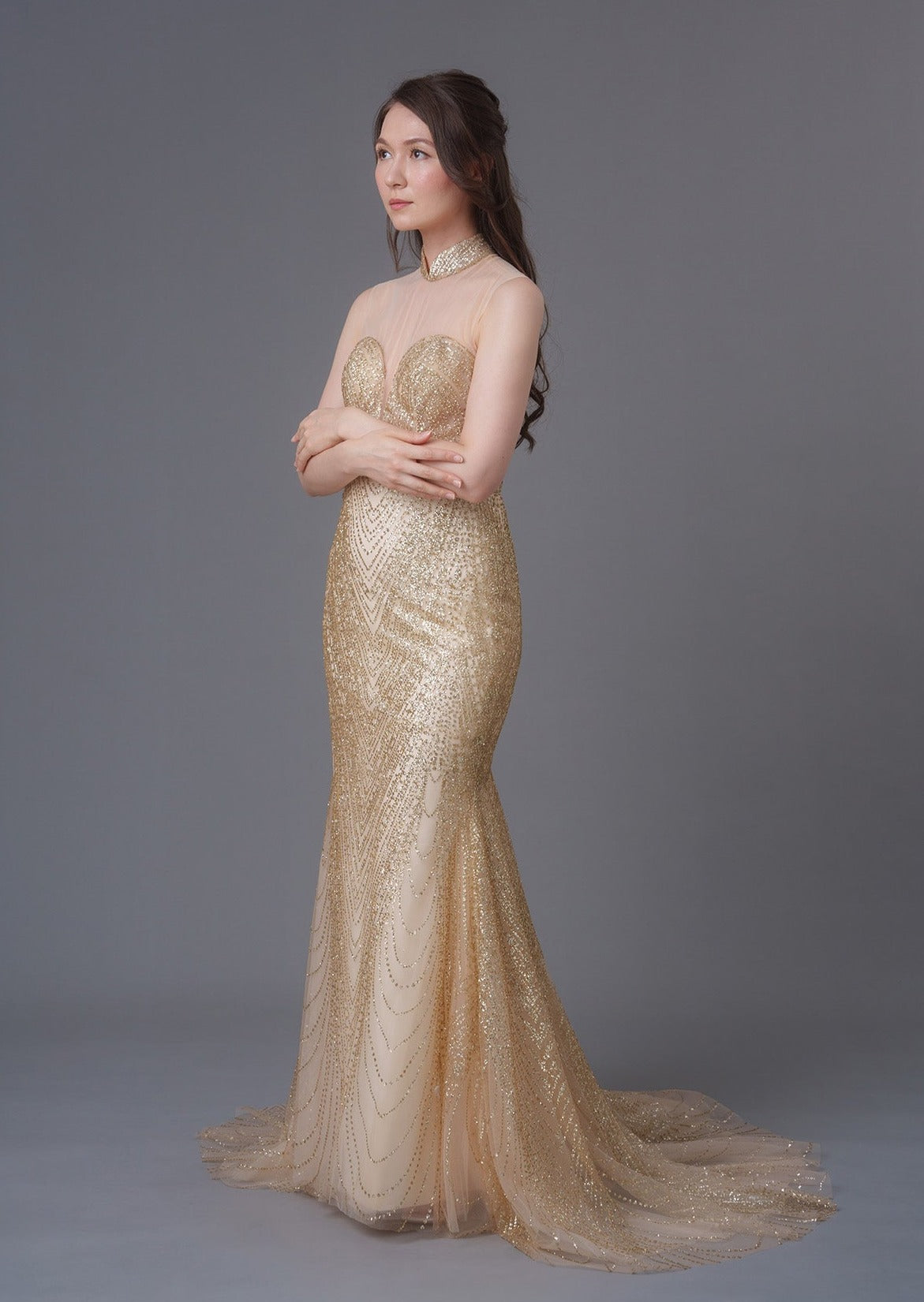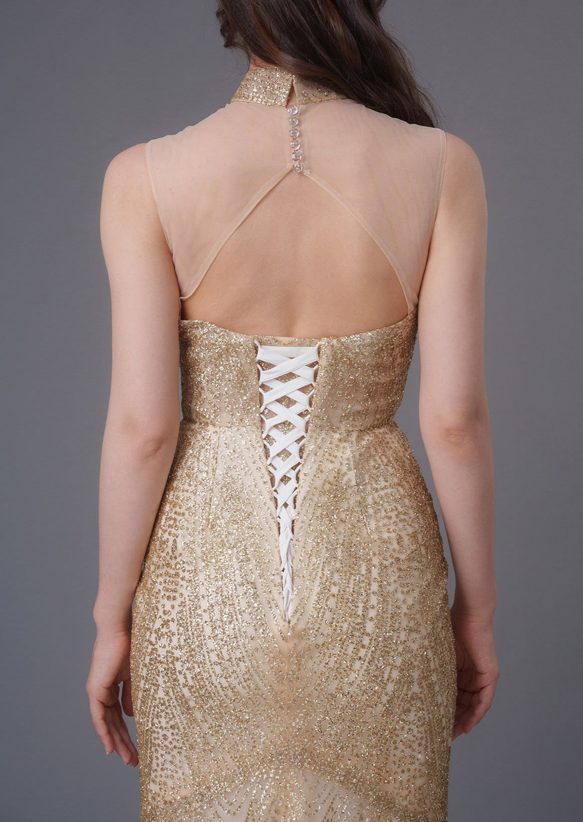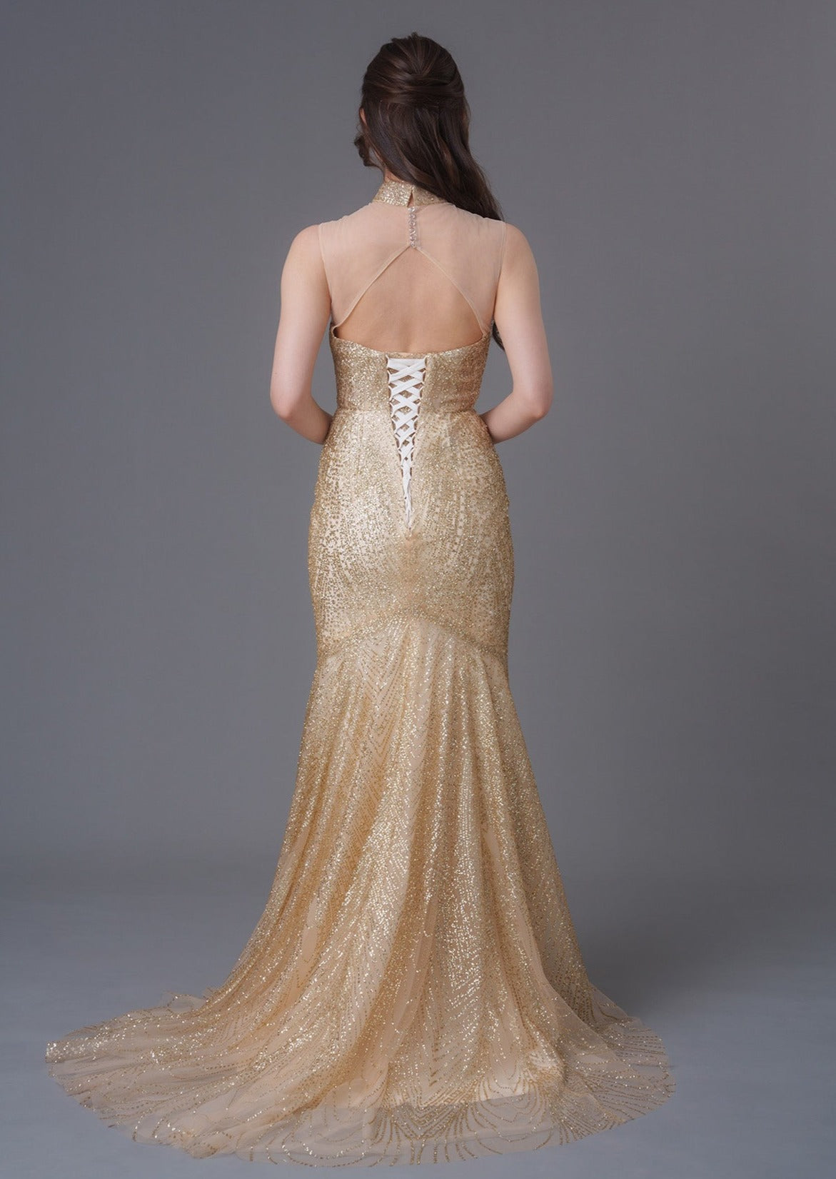 Your most special day truly warrants a really stunning outfit - and this gown is the one for you. Made from glittery tulle and featuring a mandarin collar with a lace up back in a mermaid silhouette, pair with the finest jewelry to complete your look.