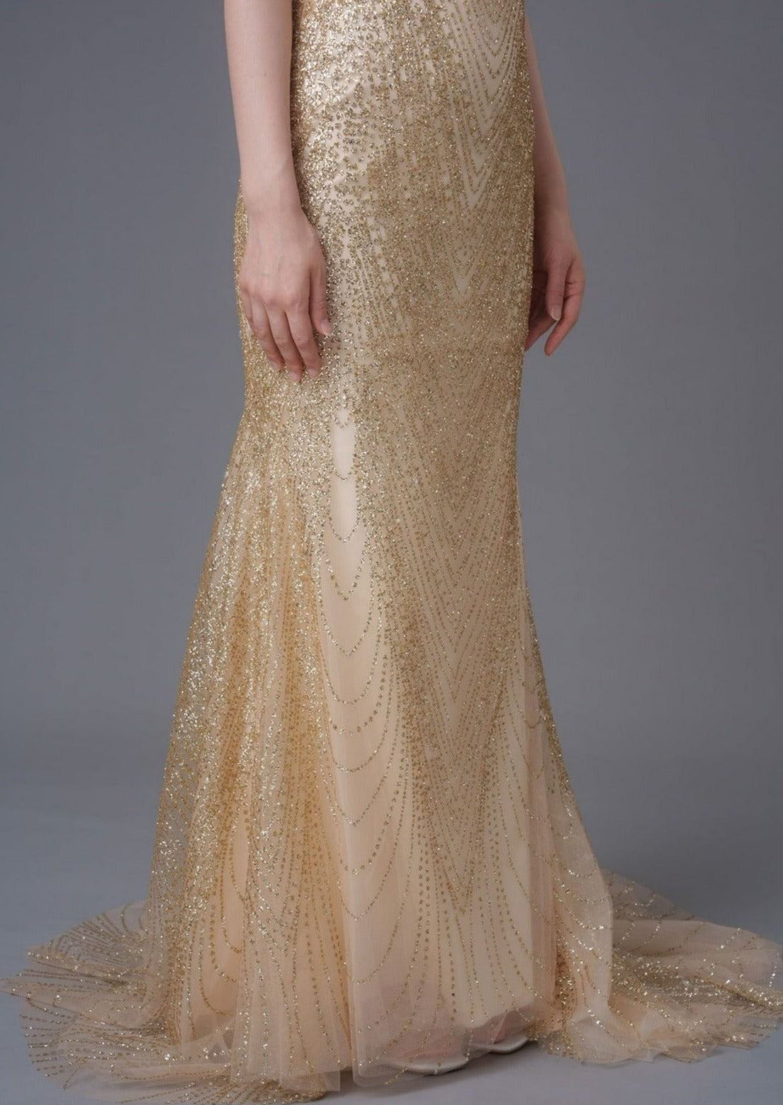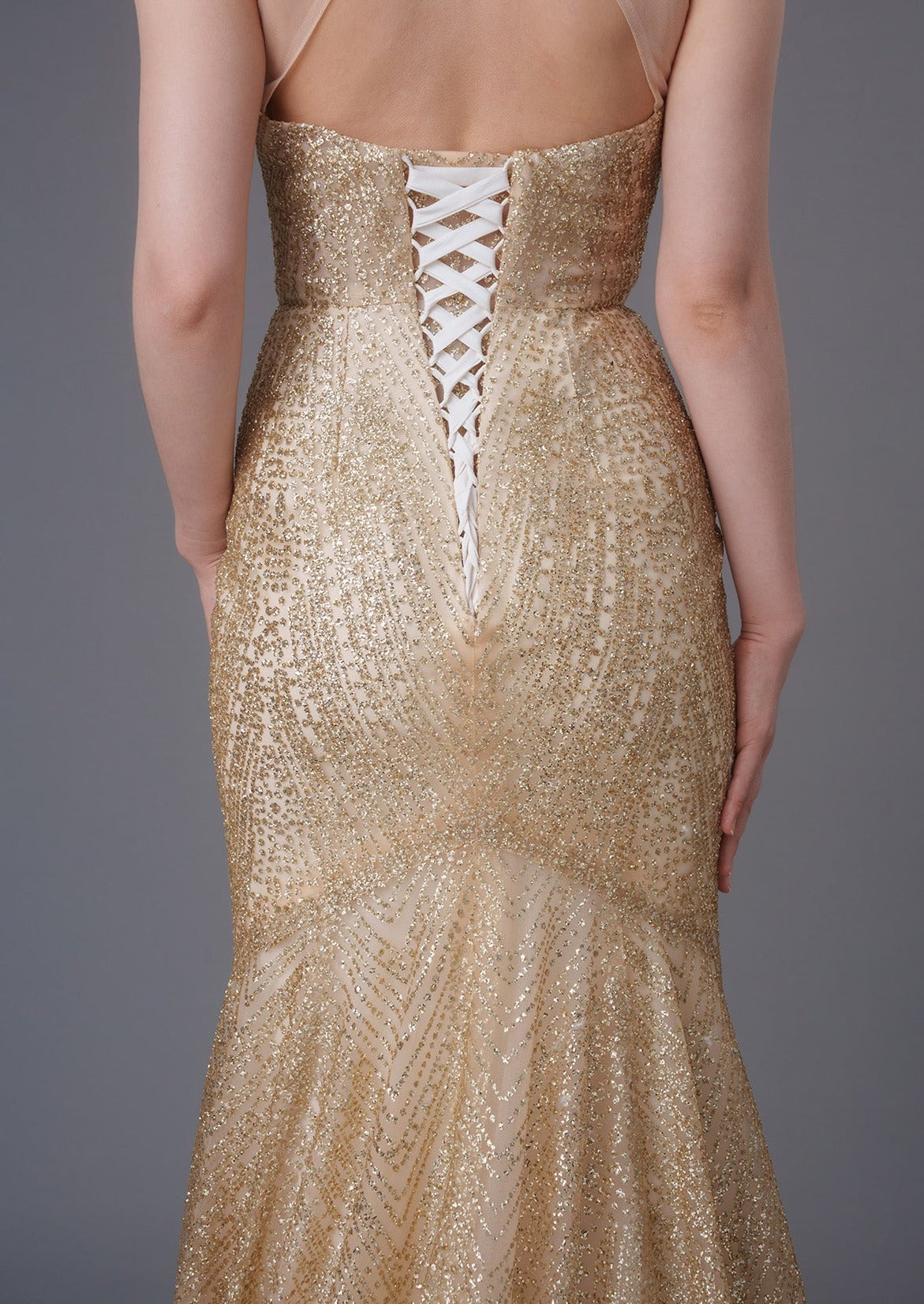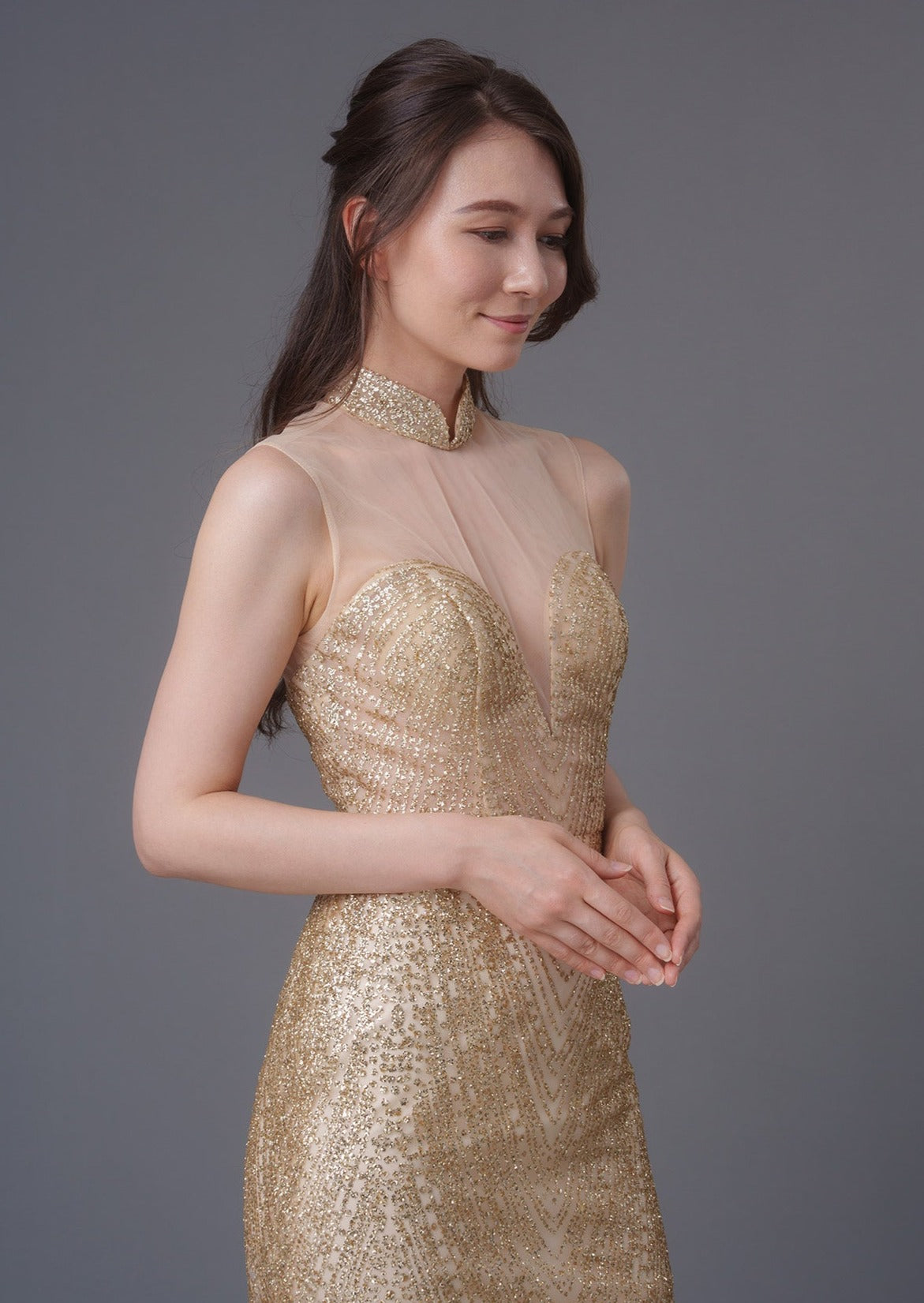 Your most special day truly warrants a really stunning outfit - and this gown is the one for you. Made from glittery tulle and featuring a mandarin collar with a lace up back in a mermaid silhouette, pair with the finest jewelry to complete your look.