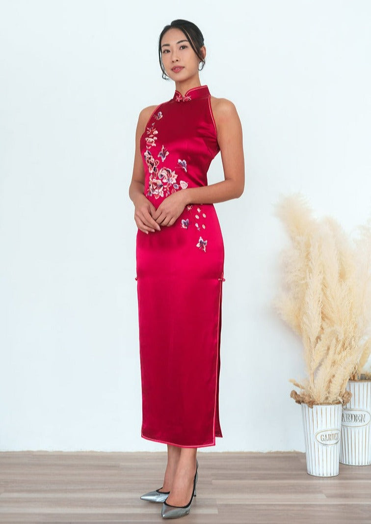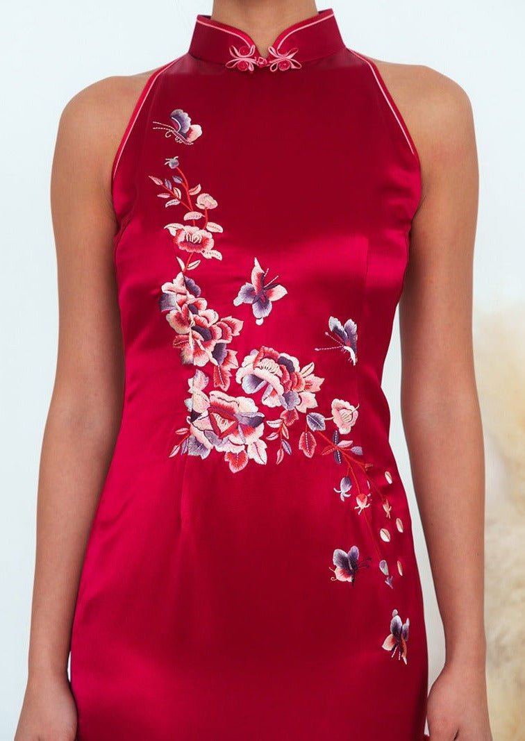 Halter Satin Qipao w Floral Embroidery (RTW)