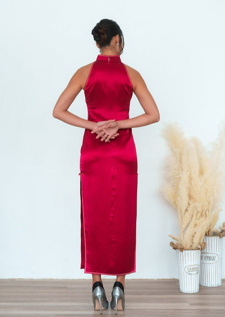 A simple and elegant halter qipao, perfect for brides who are looking for something a bit more classic. The ankle length qipao boasts a minimalist design, halter neckline, mandarin collar and two side slits - adorned with Oriental frog buttons. Wear it with a sleek updo.