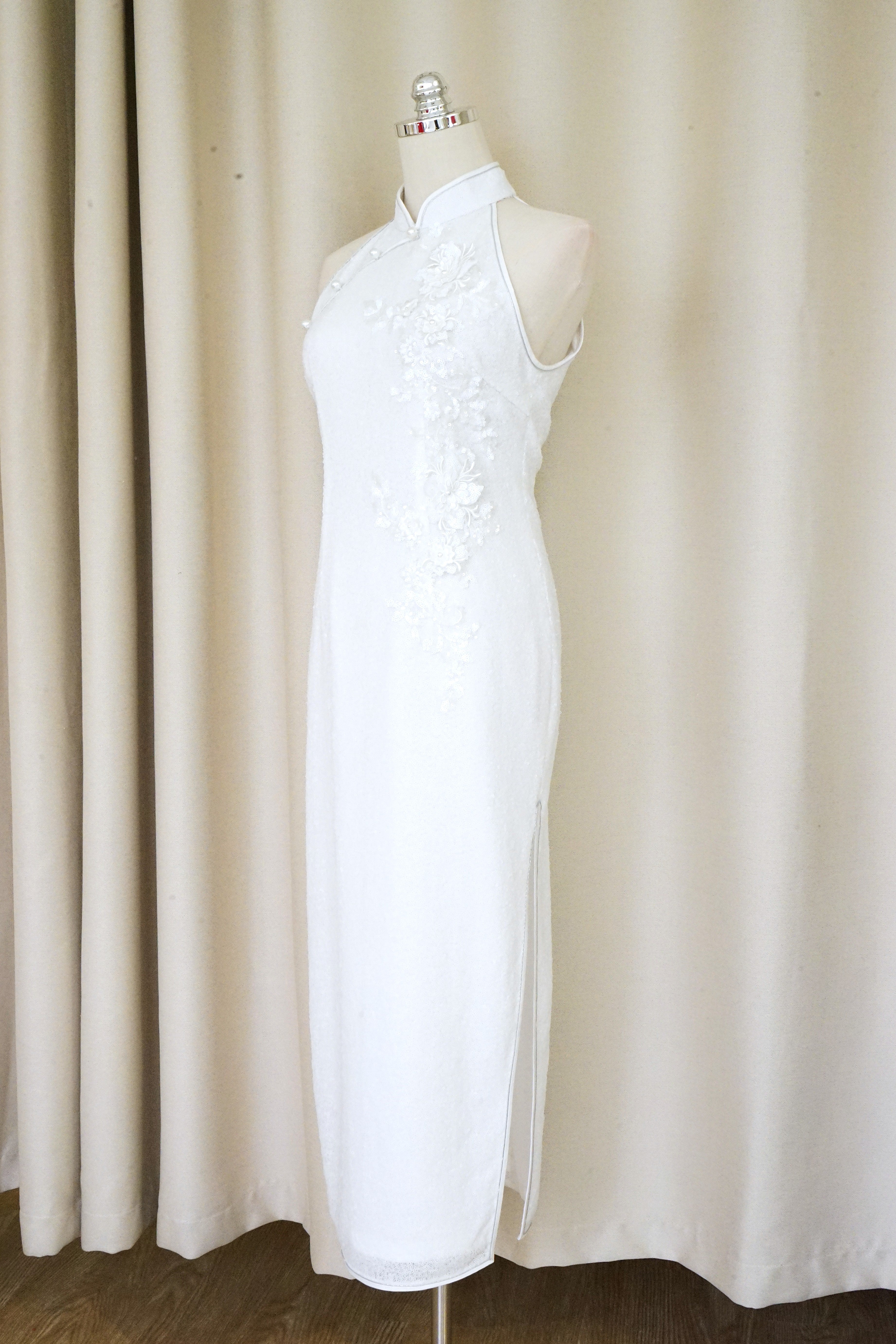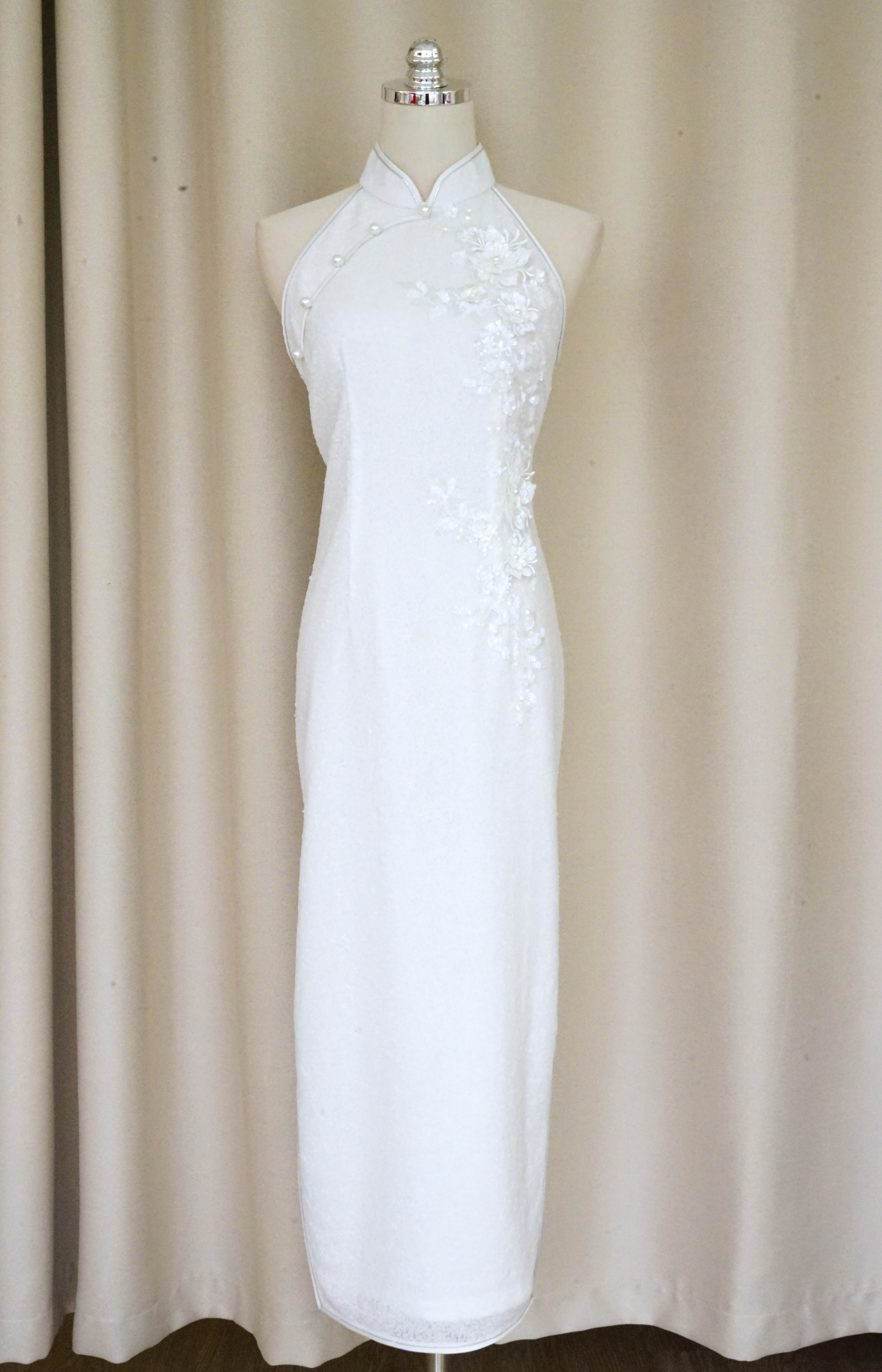 Make a dazzling impression in our Allover Sequin Halter Qipao, a modern and glamorous take on the classic cheongsam.  The floral applique are hand embellished by one of our seamstresses , completed with pearls along the diagonal piping. Designed for civil weddings, pre-wedding photoshoots, or romantic celebrations, this figure-hugging gown combines timeless sophistication with show-stopping shimmer.