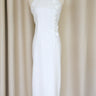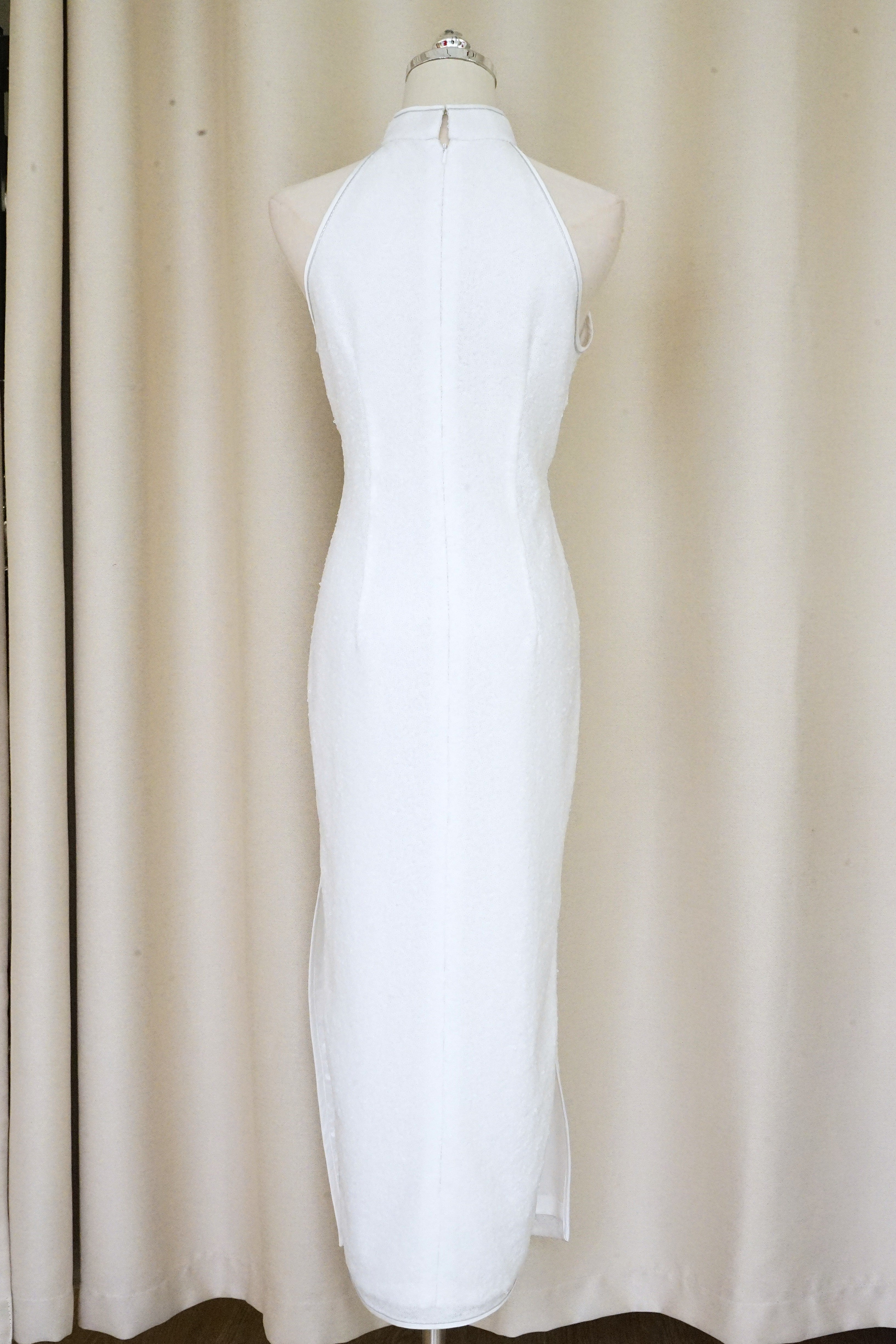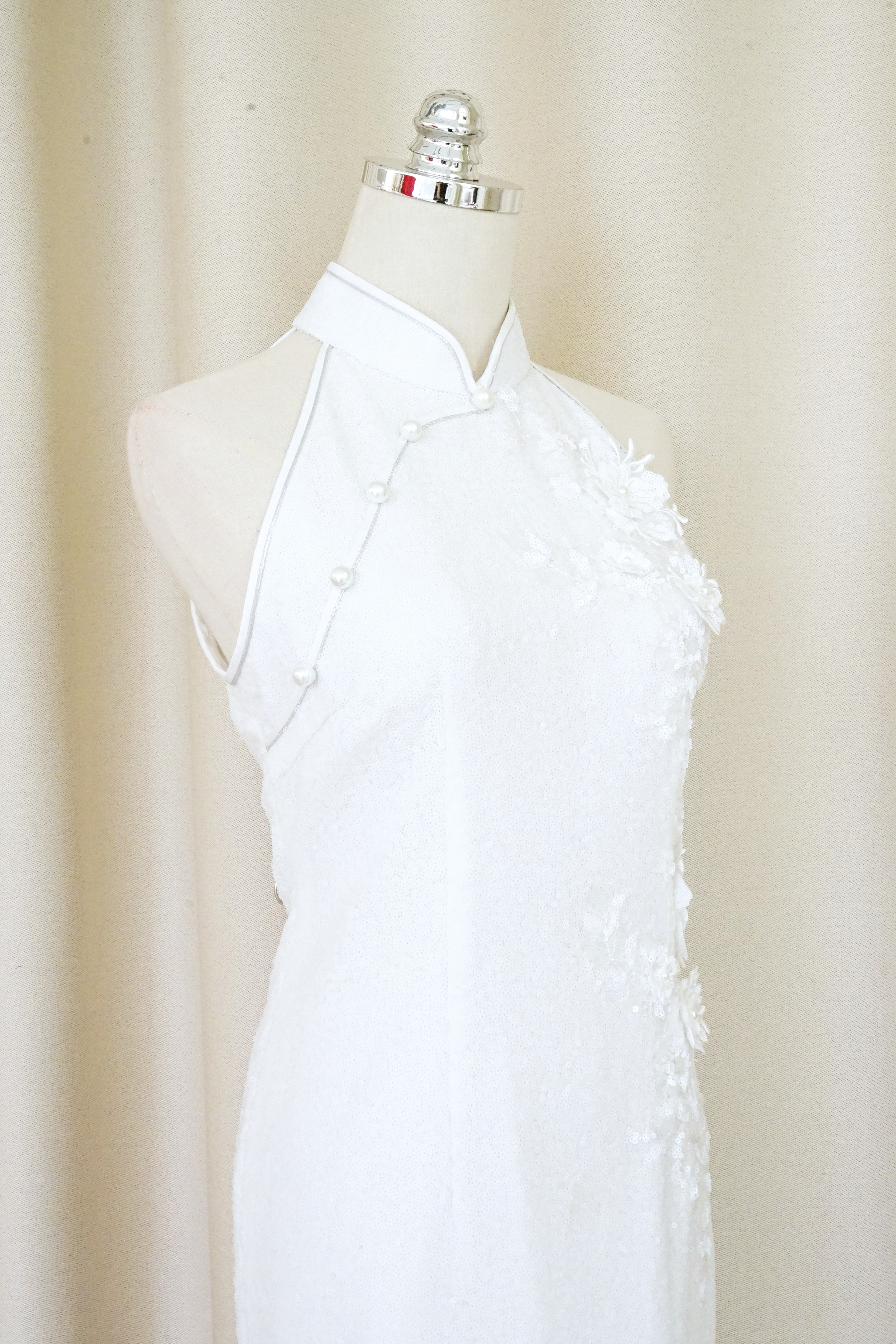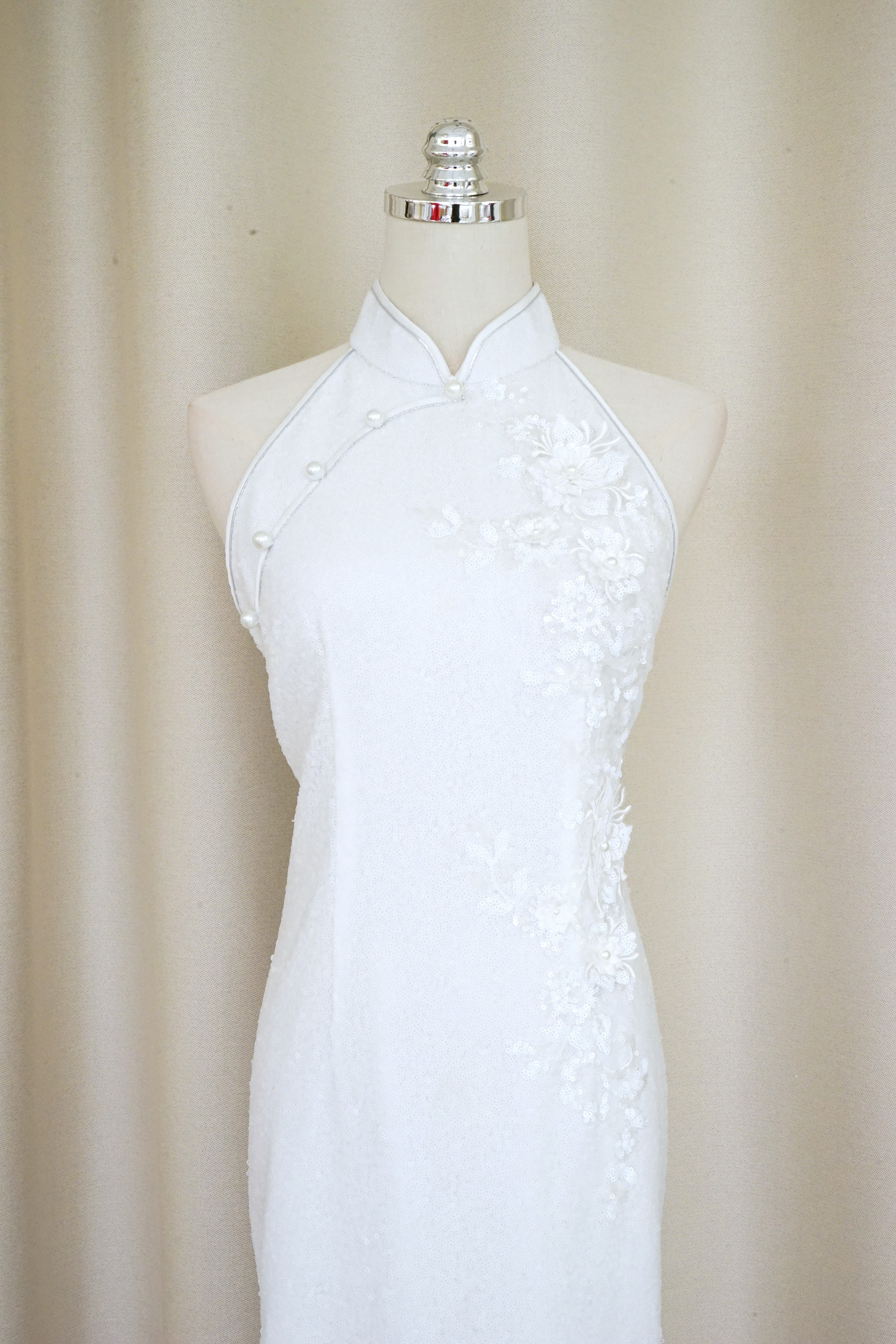 Allover Sequins Halter Qipao w Floral Applique (White) - RTW