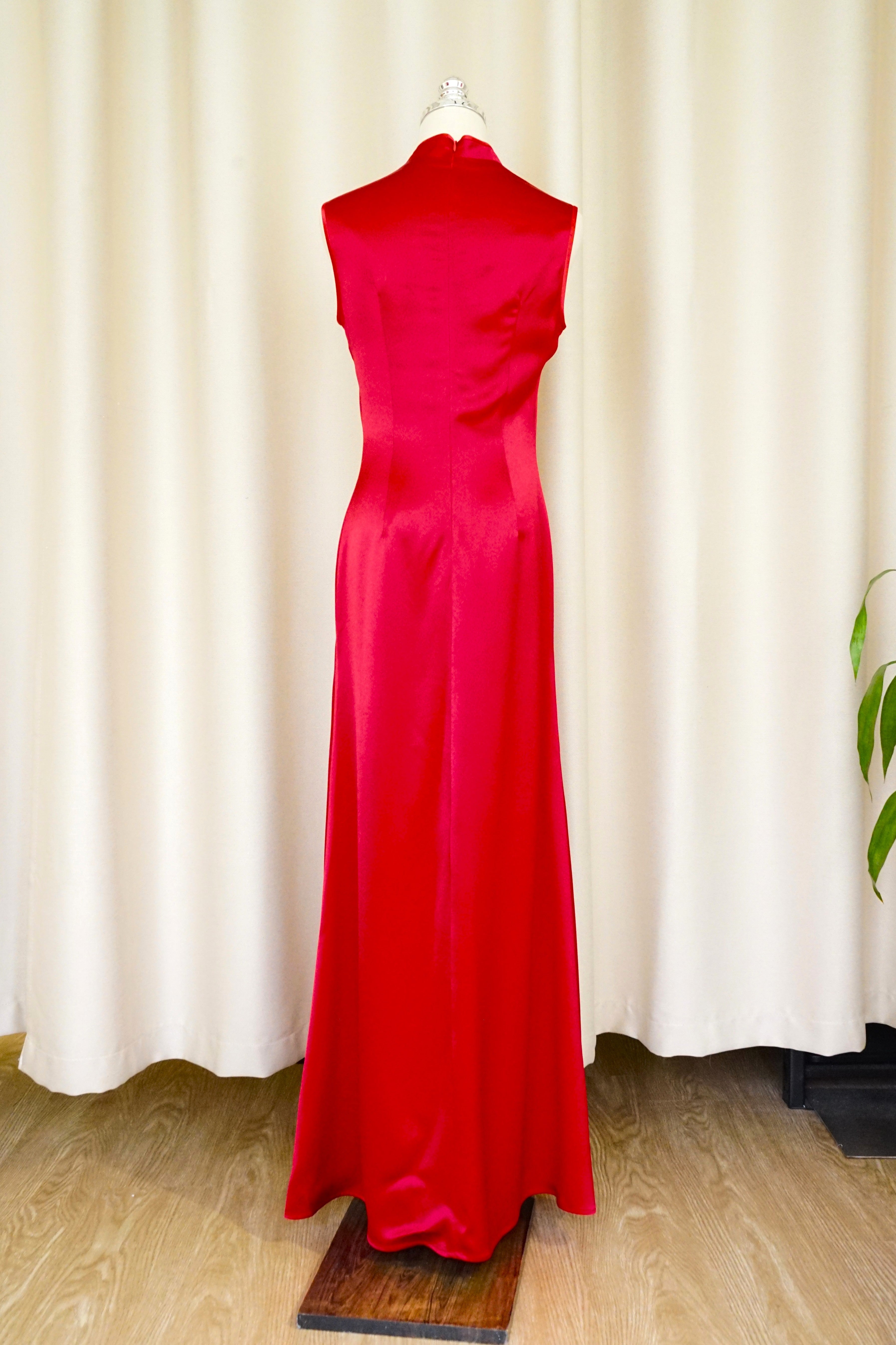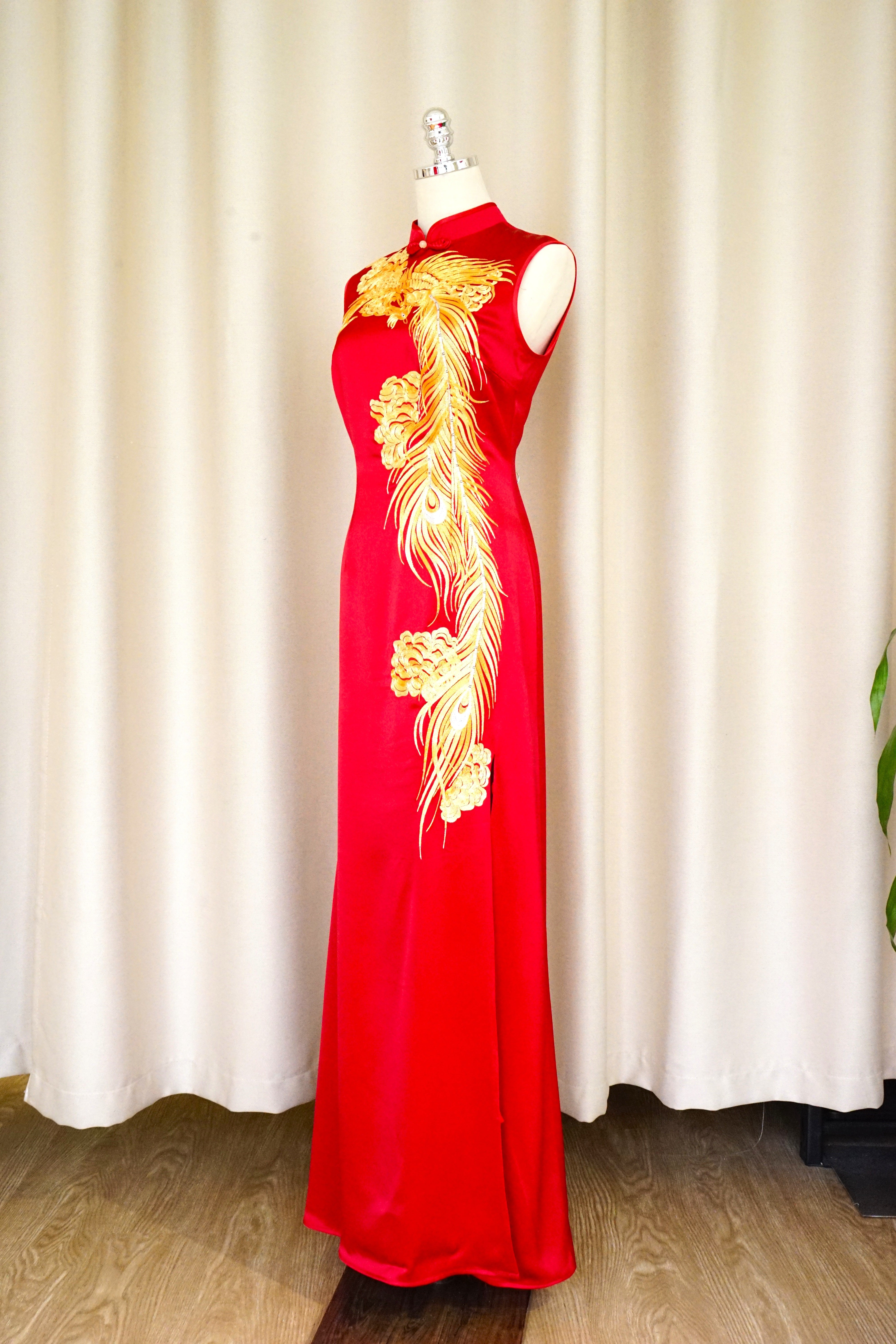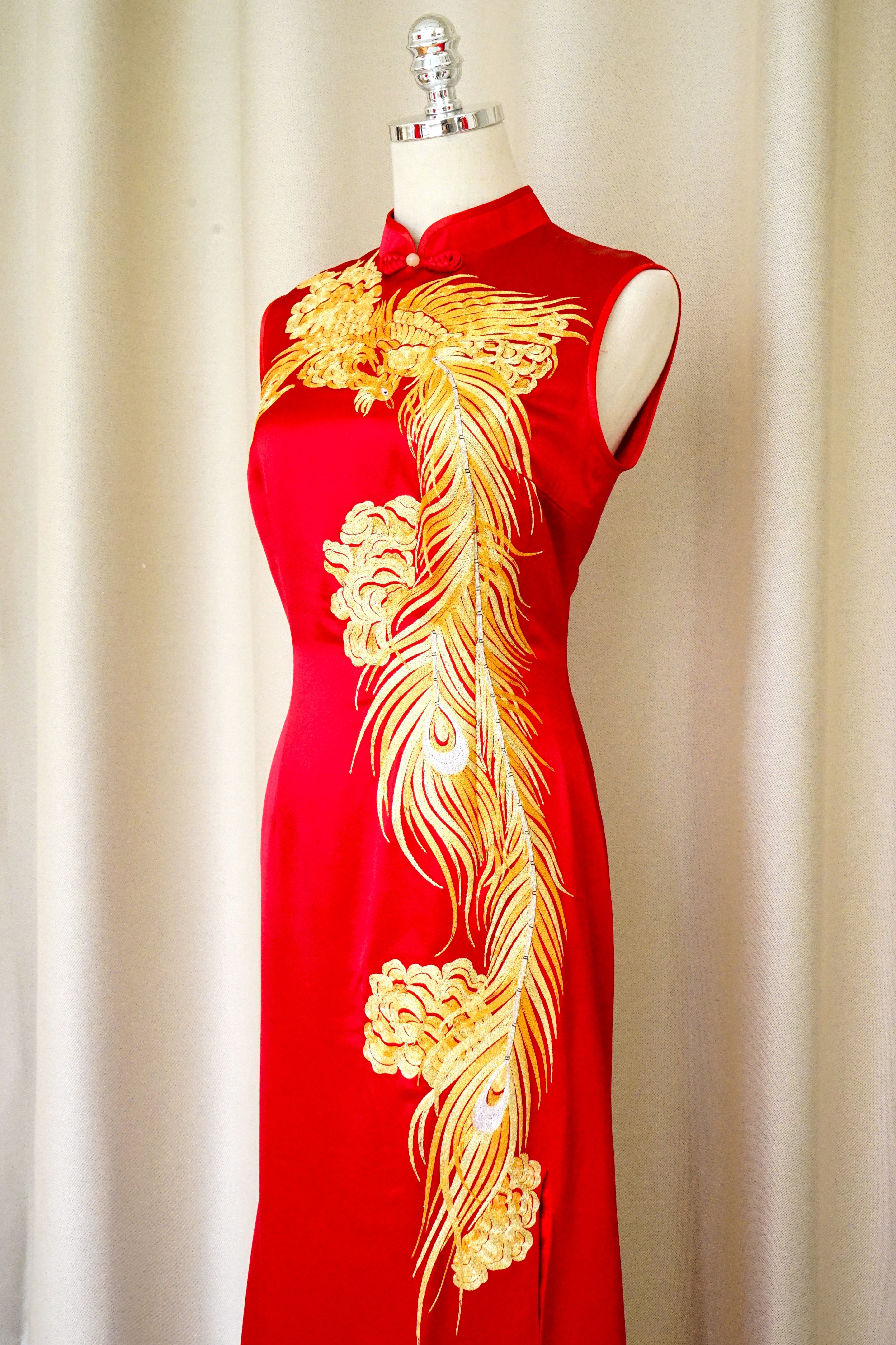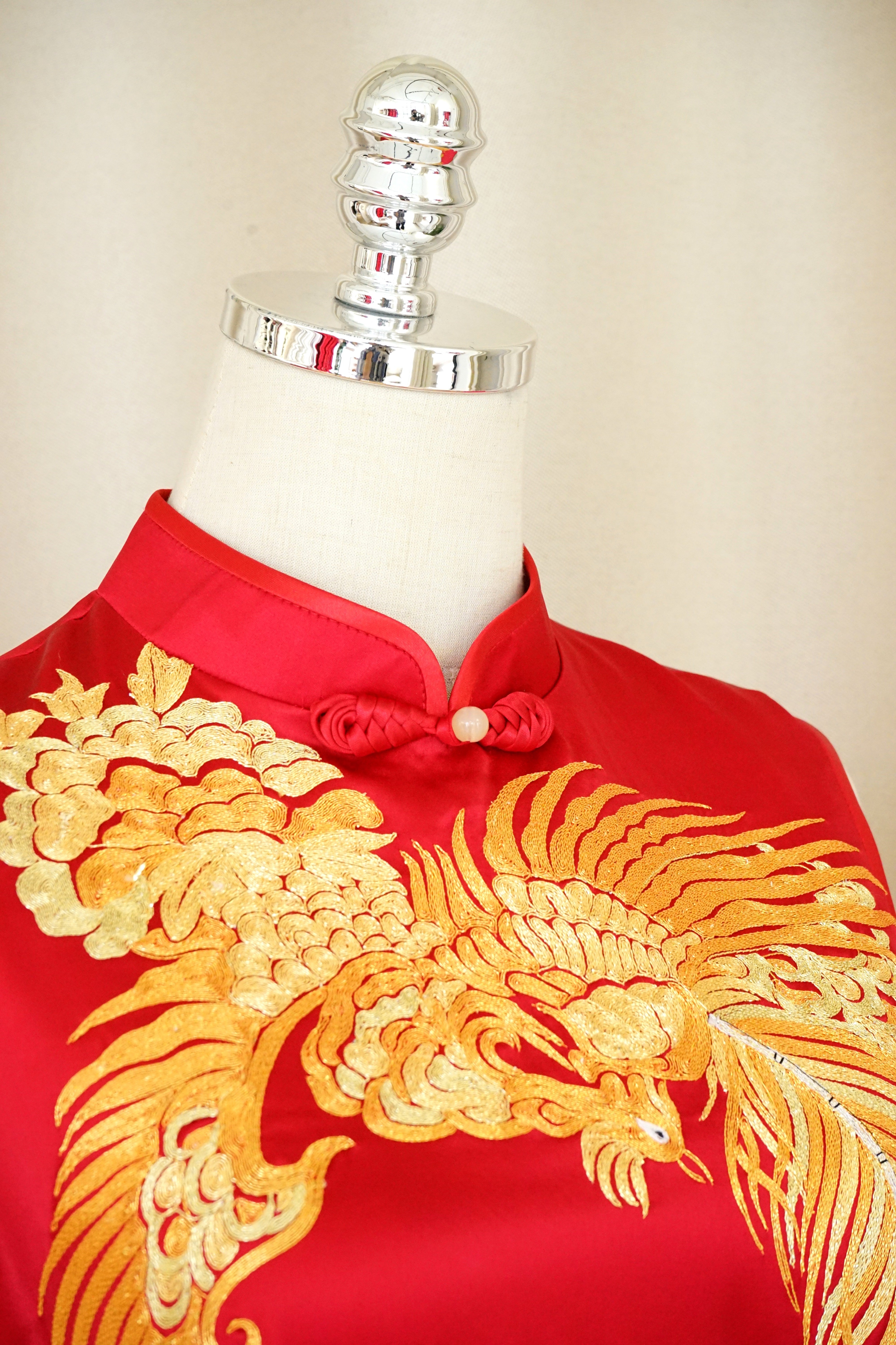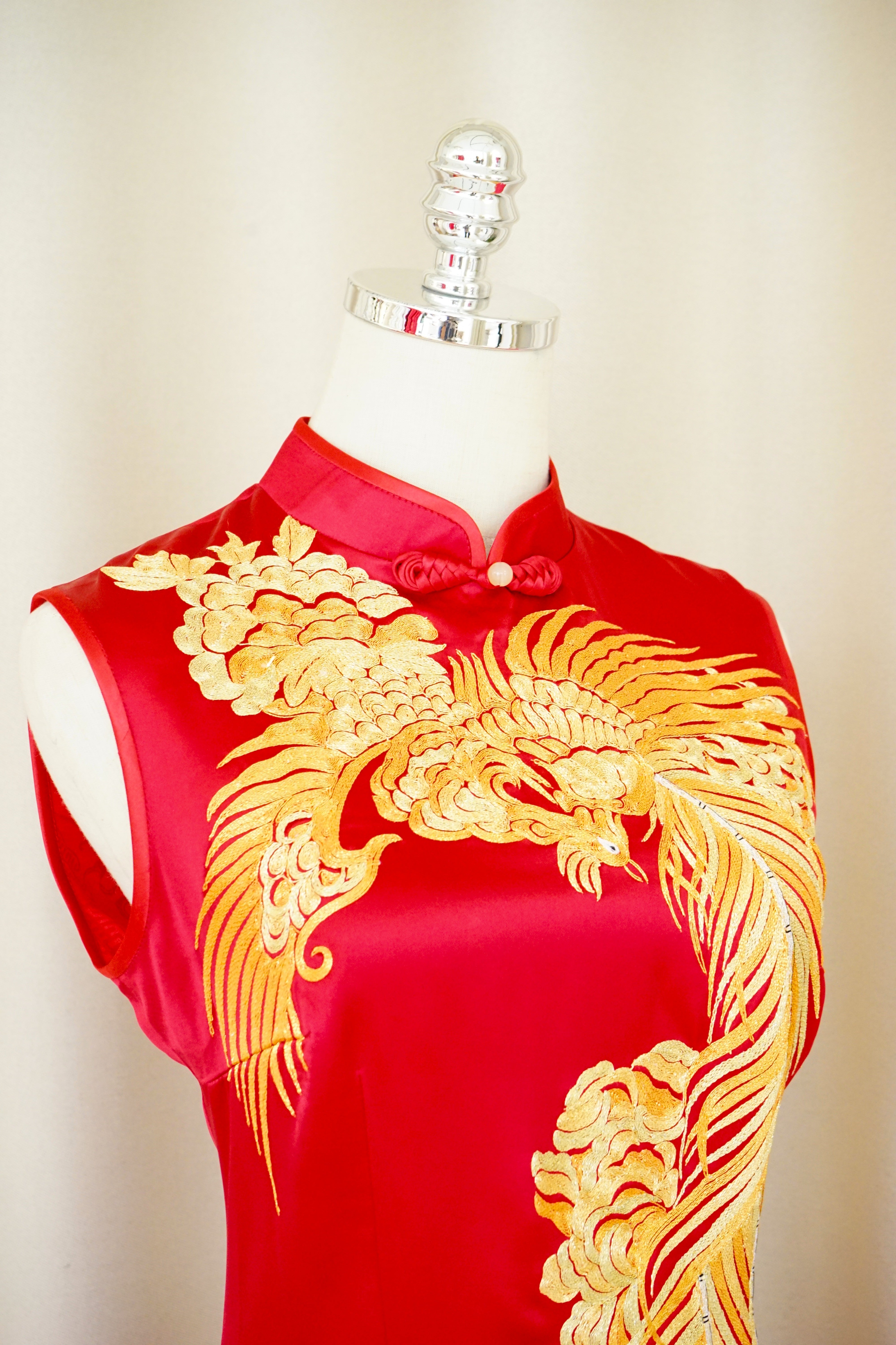 Embrace the perfect blend of contemporary style and traditional allure with our Gloriosa Lily Phoenix Qipao. Made from a heavyweight satin, this qipao showcases a delicate mermaid silhouette, sexy fun, front slit, and exquisite hand-embroidered classic phoenix motifs by our skilled silk tailor. A captivating and refined choice for brides looking to honor their heritage while making a modern statement on their special day.