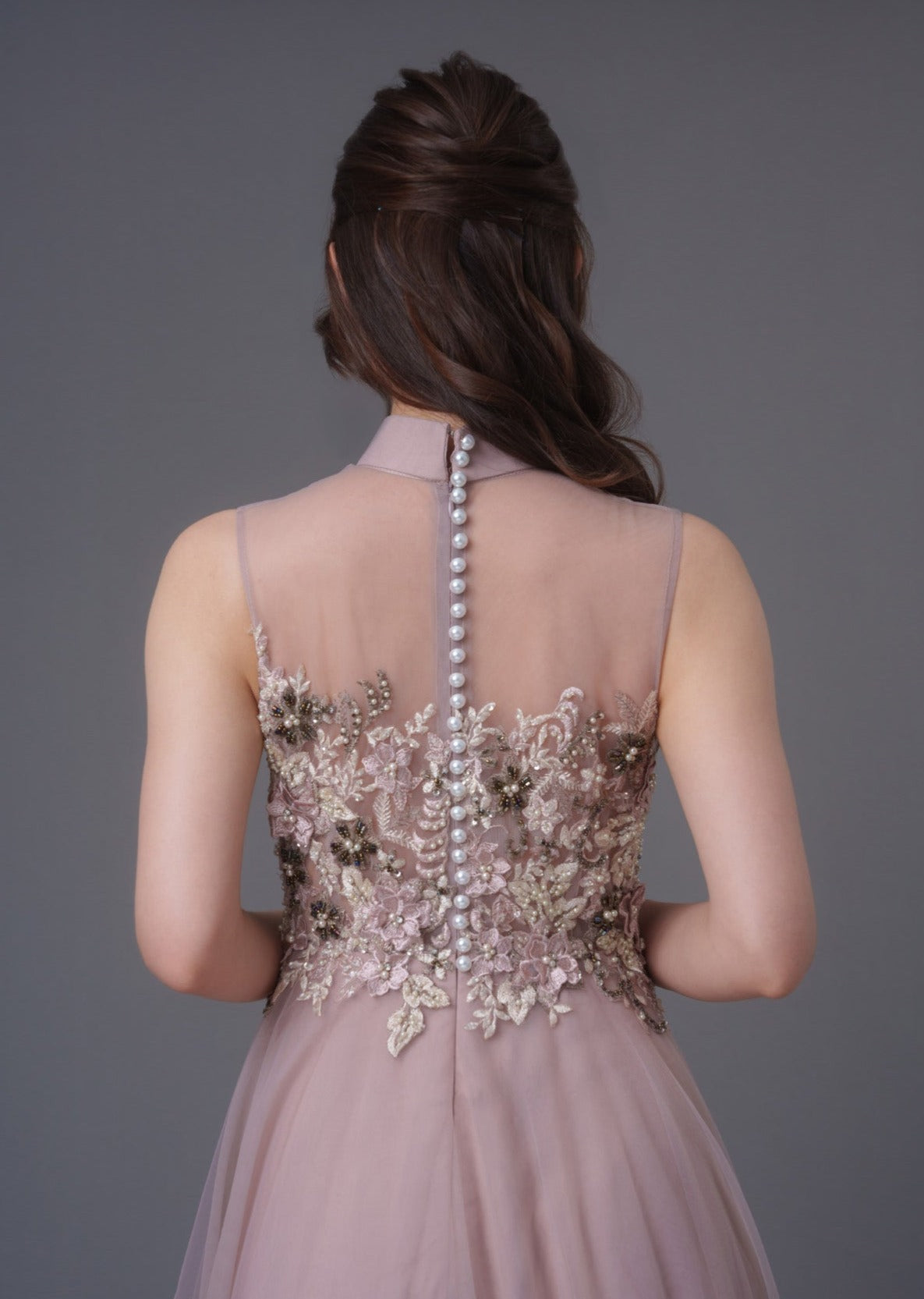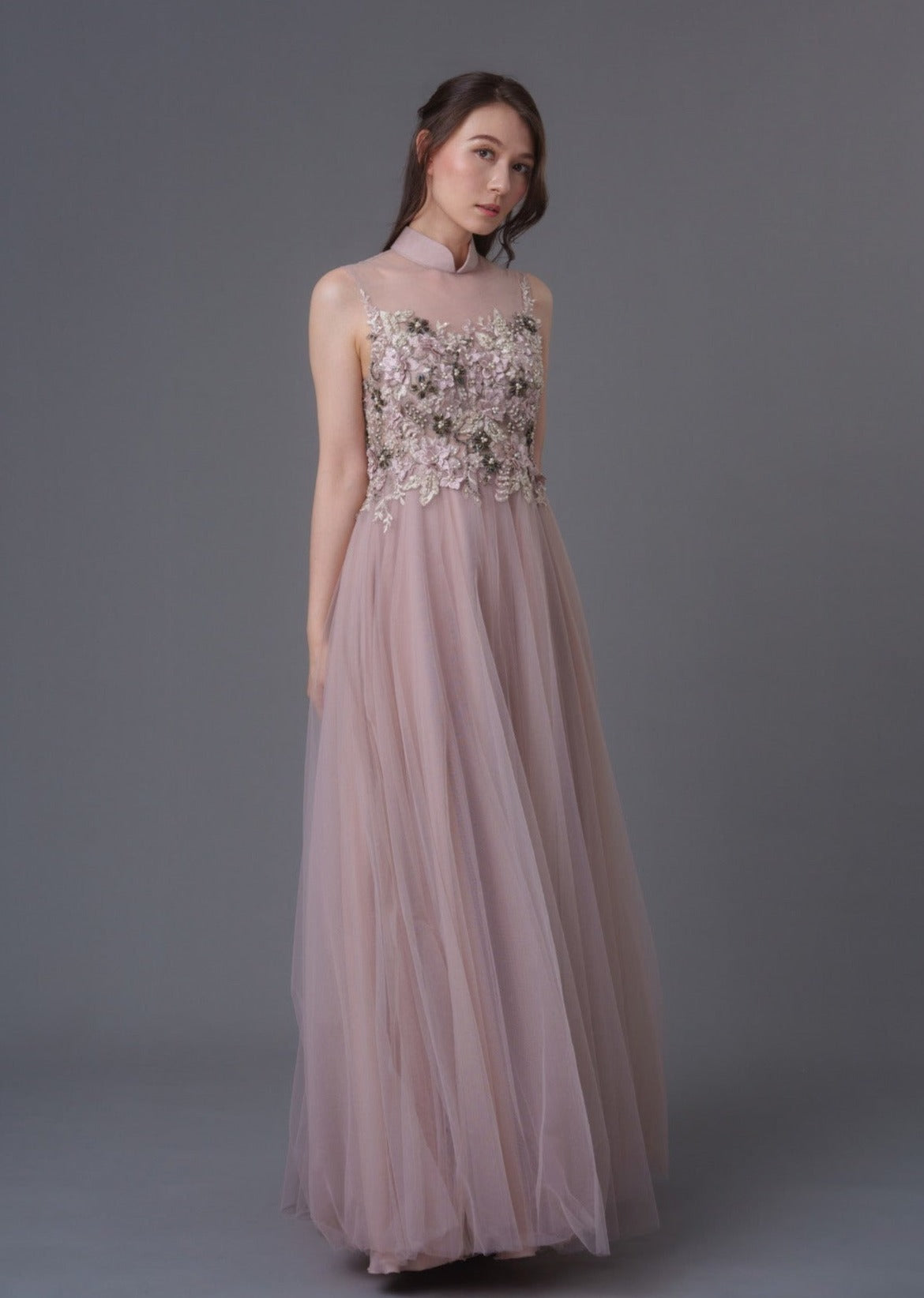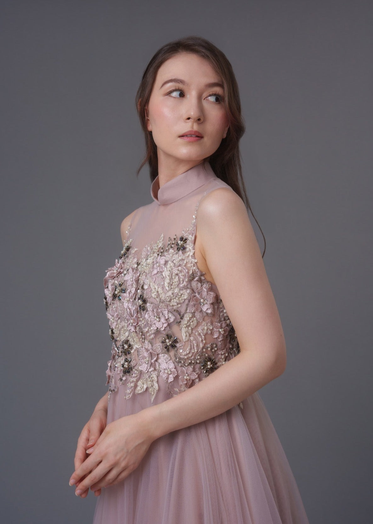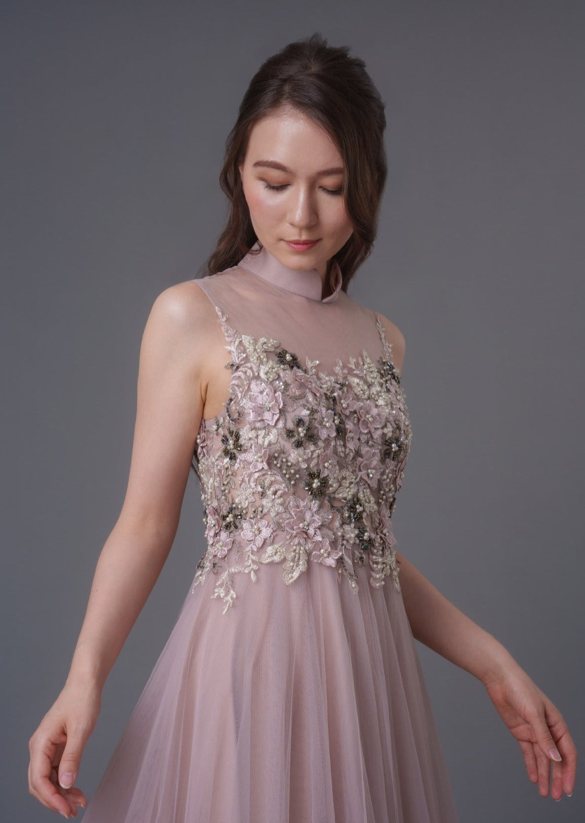 The Oriental Poppy sleeveless qipao gown will make you feel your prettiest at any special occasion. Floral details are beautifully embellished on the mesh bodice and matched with an A-line tulle skirt. This is an extremely flattering silhouette. Match with strappy heels.