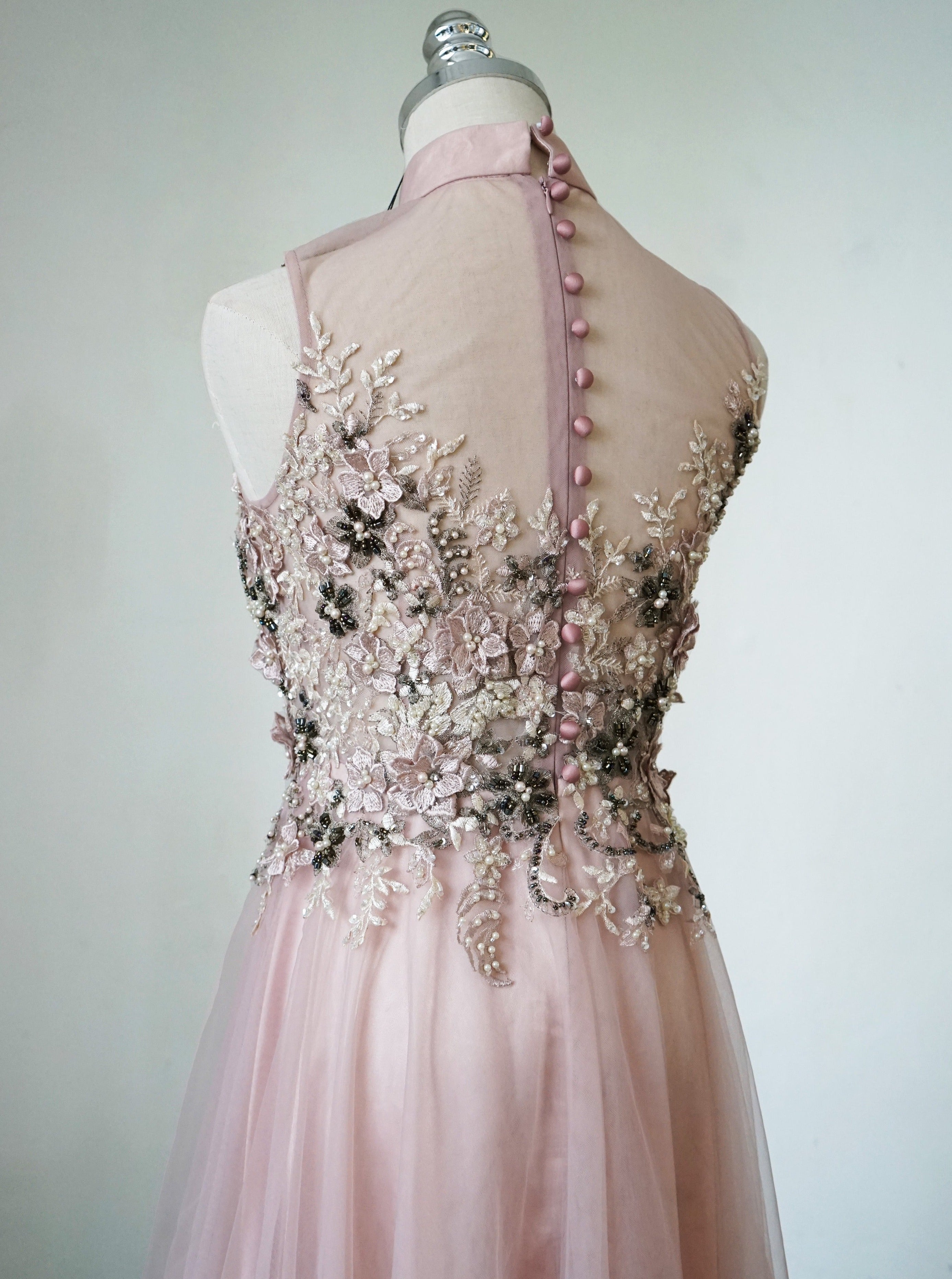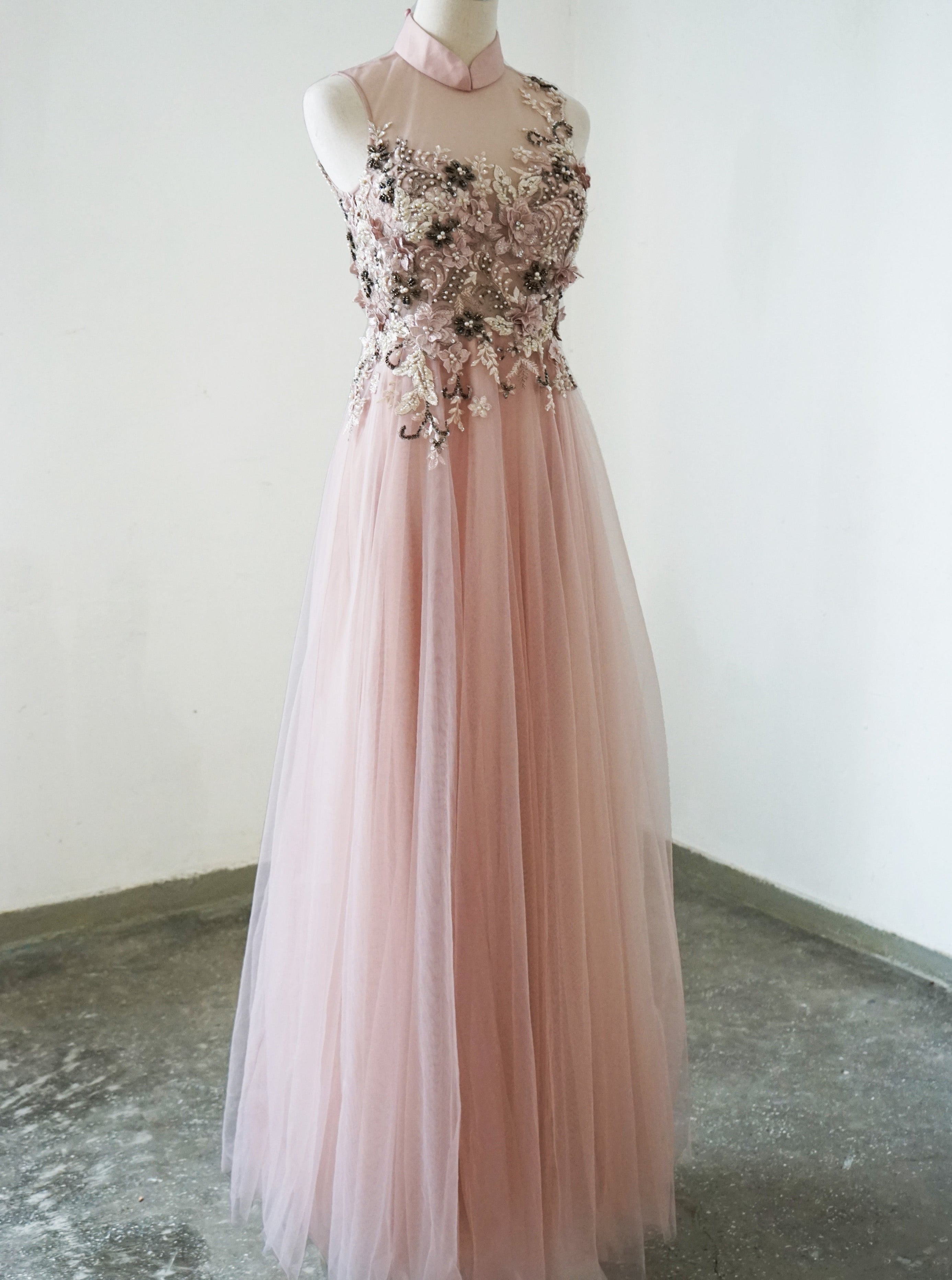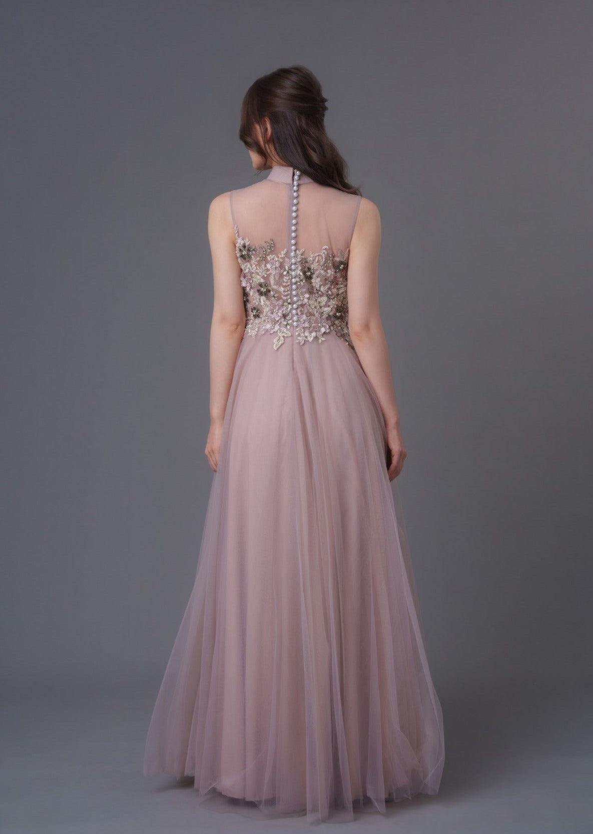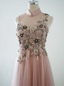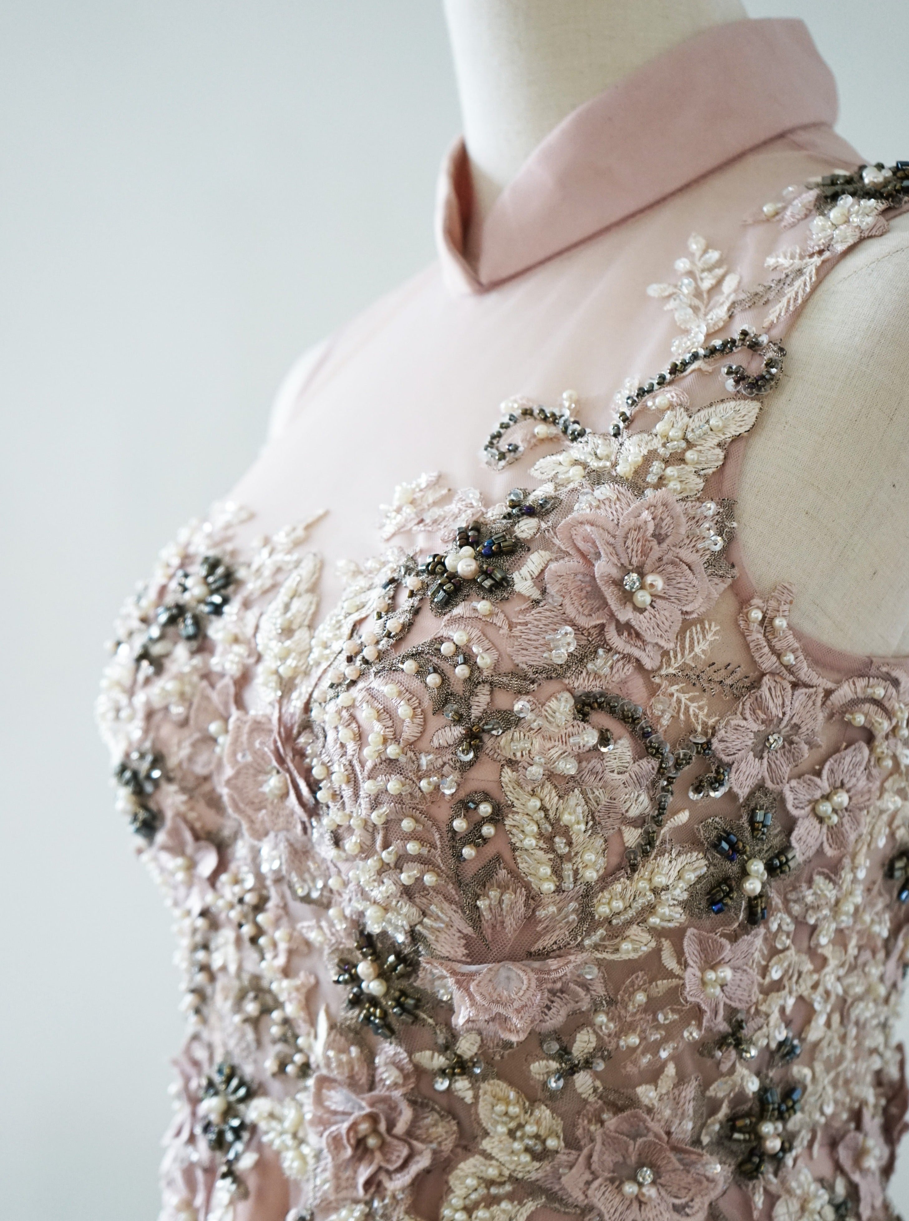 The Oriental Poppy sleeveless qipao gown will make you feel your prettiest at any special occasion. Floral details are beautifully embellished on the mesh bodice and matched with an A-line tulle skirt. This is an extremely flattering silhouette. Match with strappy heels.