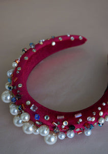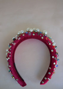 Oversized Pearl & Crystal Velvet Headband (Dark Red)