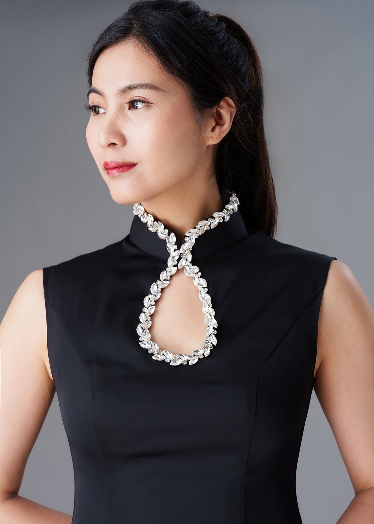 Elevate your evening look with our Crystal Keyhole Qipao, a stunning black dress featuring a flattering A-line silhouette. The dramatic keyhole detail is beautifully accentuated by crystals so there is no need for added jewelry. This exquisite design combines modern elegance with a touch of glamour, making it perfect for formal events or special occasions.