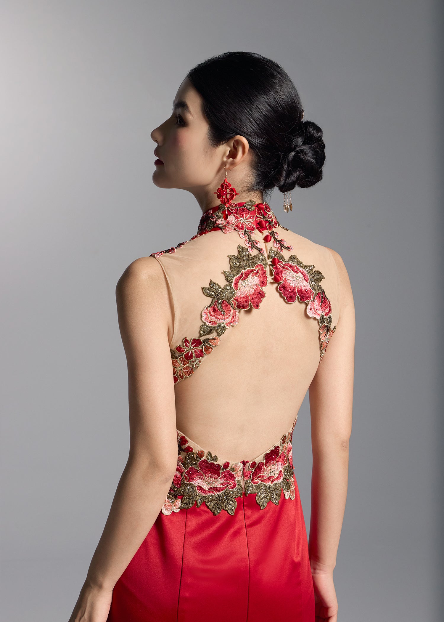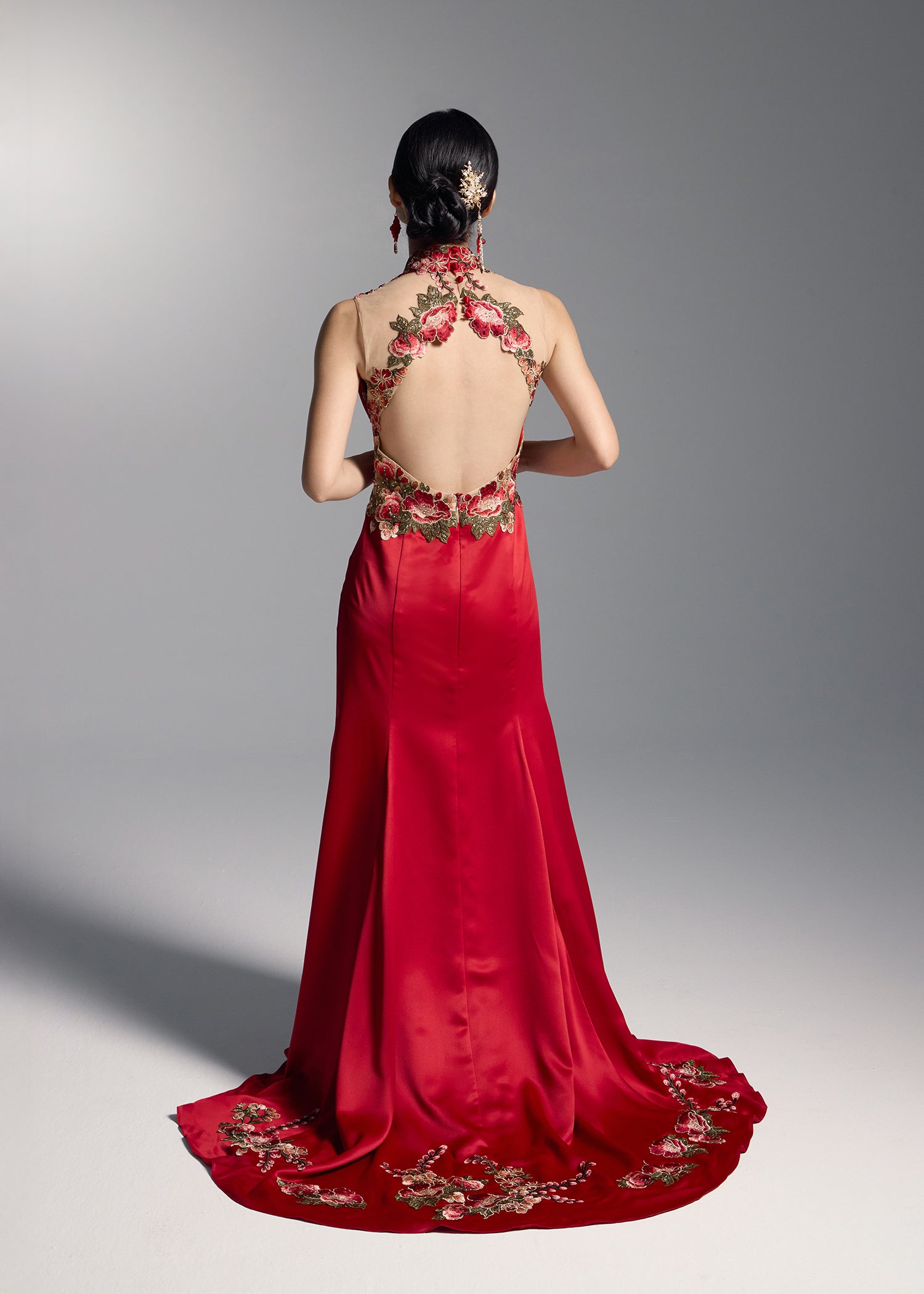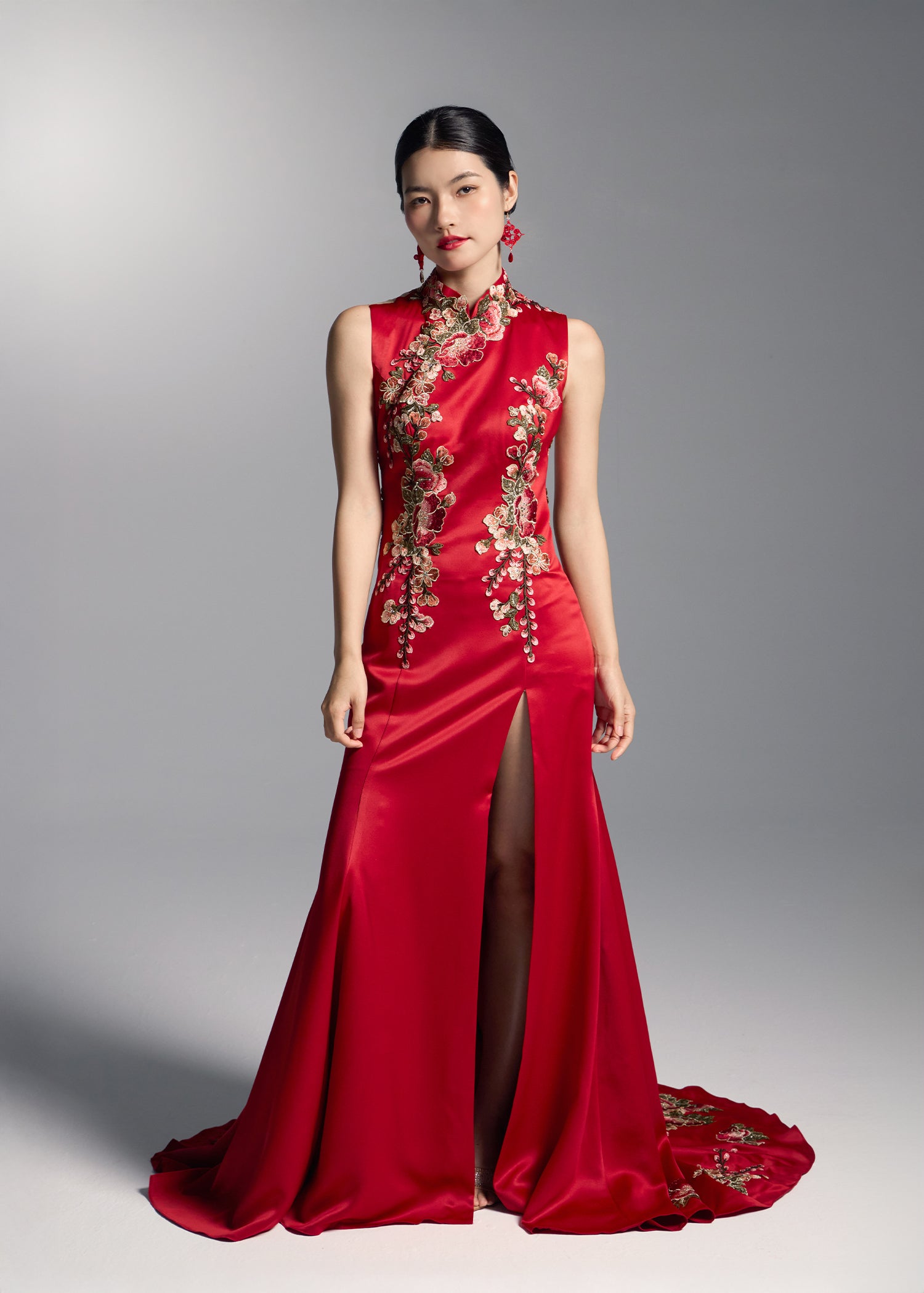 This exquisite red bridal gown showcases intricate floral embroidery that elegantly contrasts with the vibrant red fabric, creating a striking visual appeal. The sleeveless open back design matched with a mermaid silhouette, accentuates the feminine curves. This qipao dress combines romance and modern sophistication making it the perfect choice for brides looking to make a bold statement on their special day.