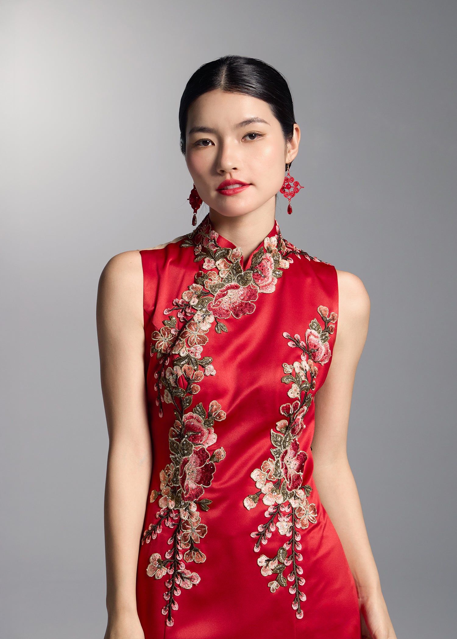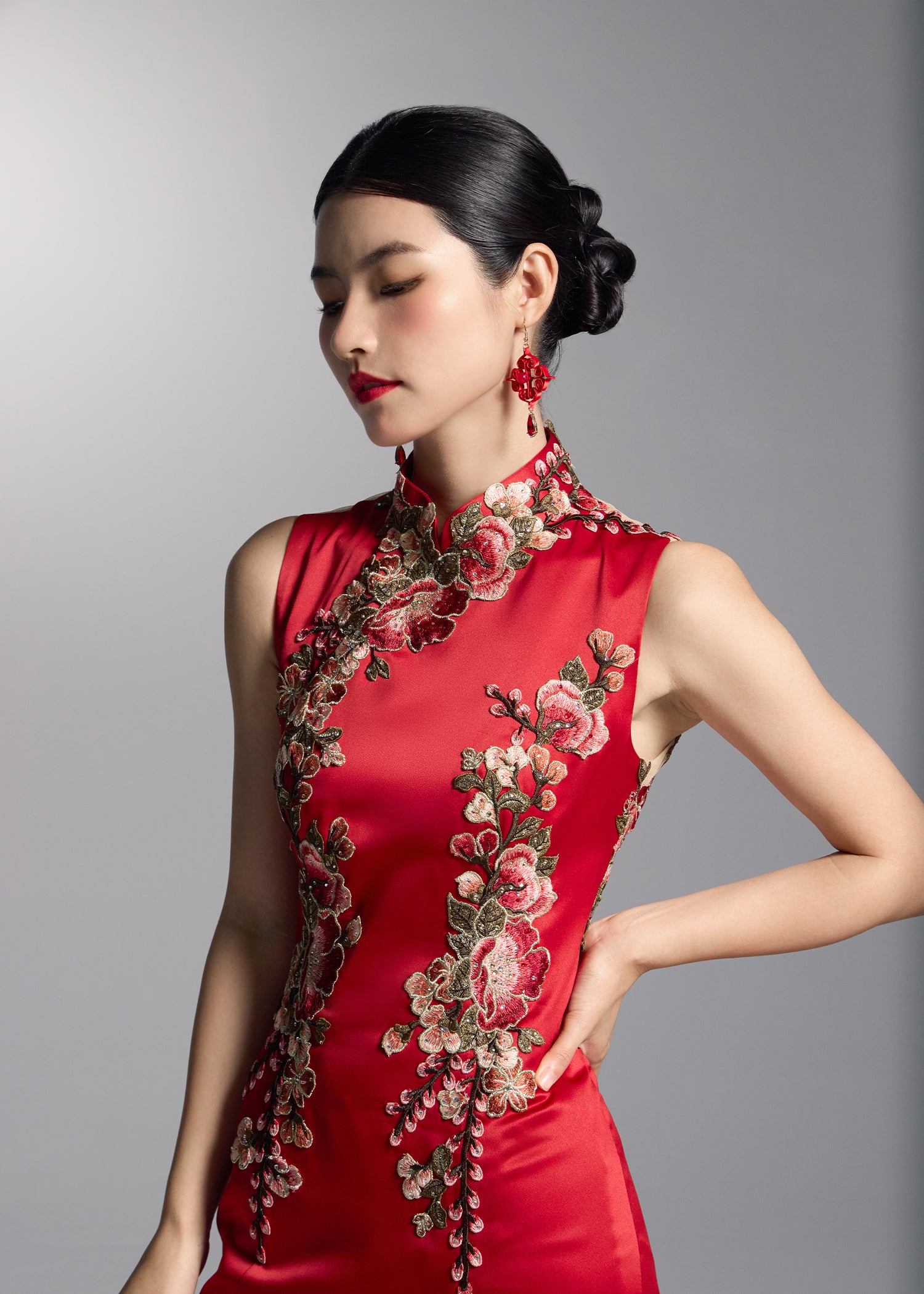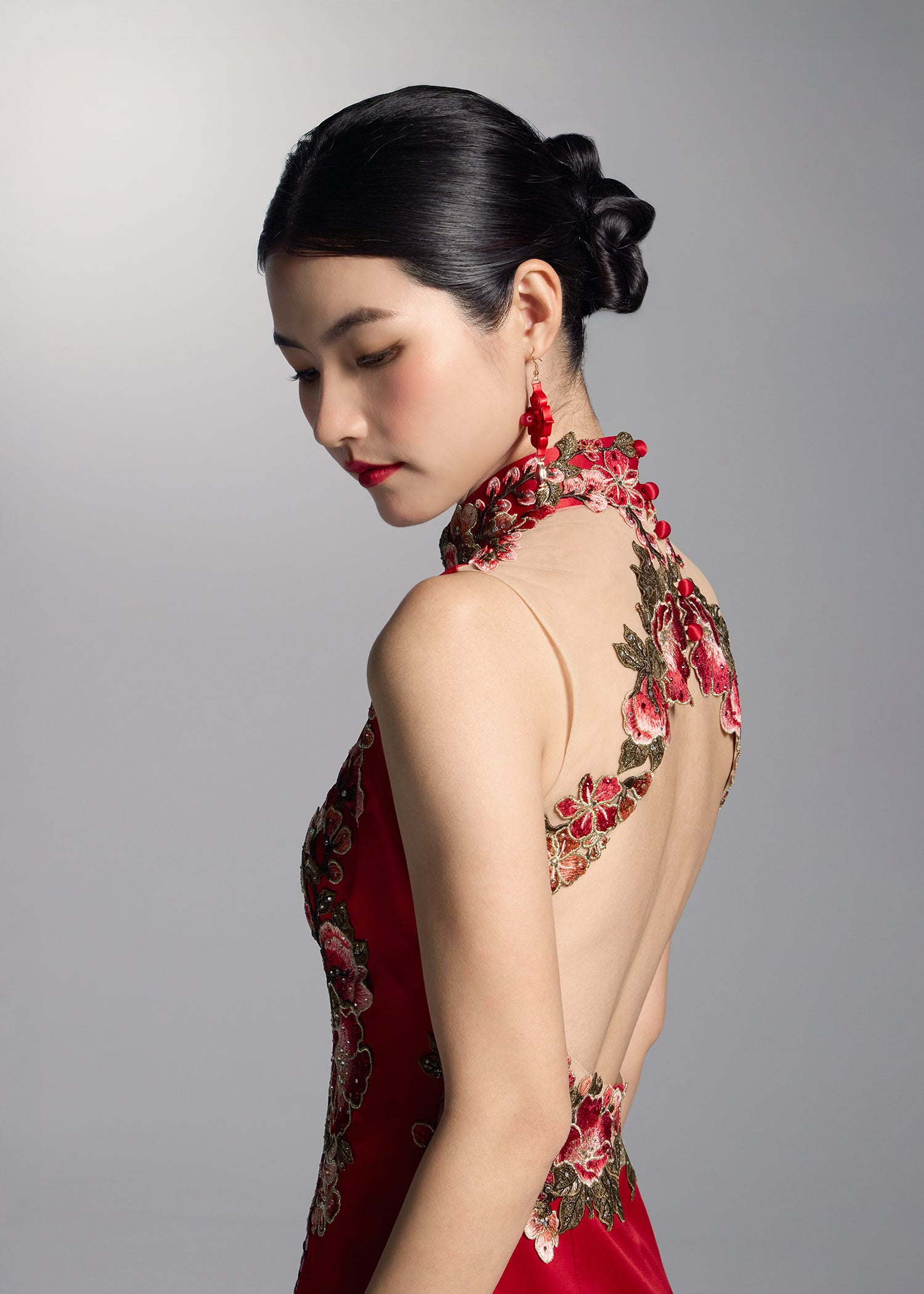 This exquisite red bridal gown showcases intricate floral embroidery that elegantly contrasts with the vibrant red fabric, creating a striking visual appeal. The sleeveless open back design matched with a mermaid silhouette, accentuates the feminine curves. This qipao dress combines romance and modern sophistication making it the perfect choice for brides looking to make a bold statement on their special day.