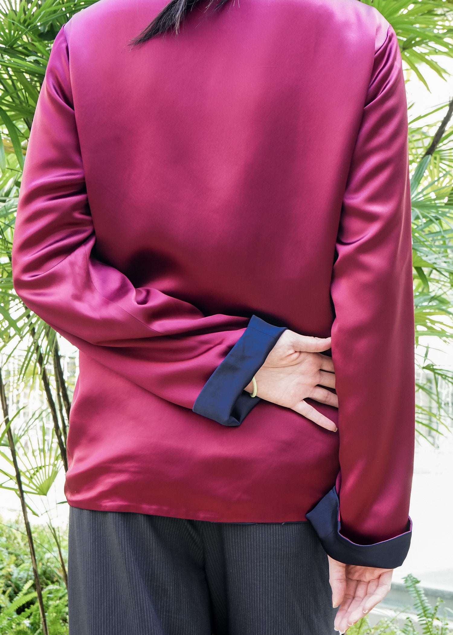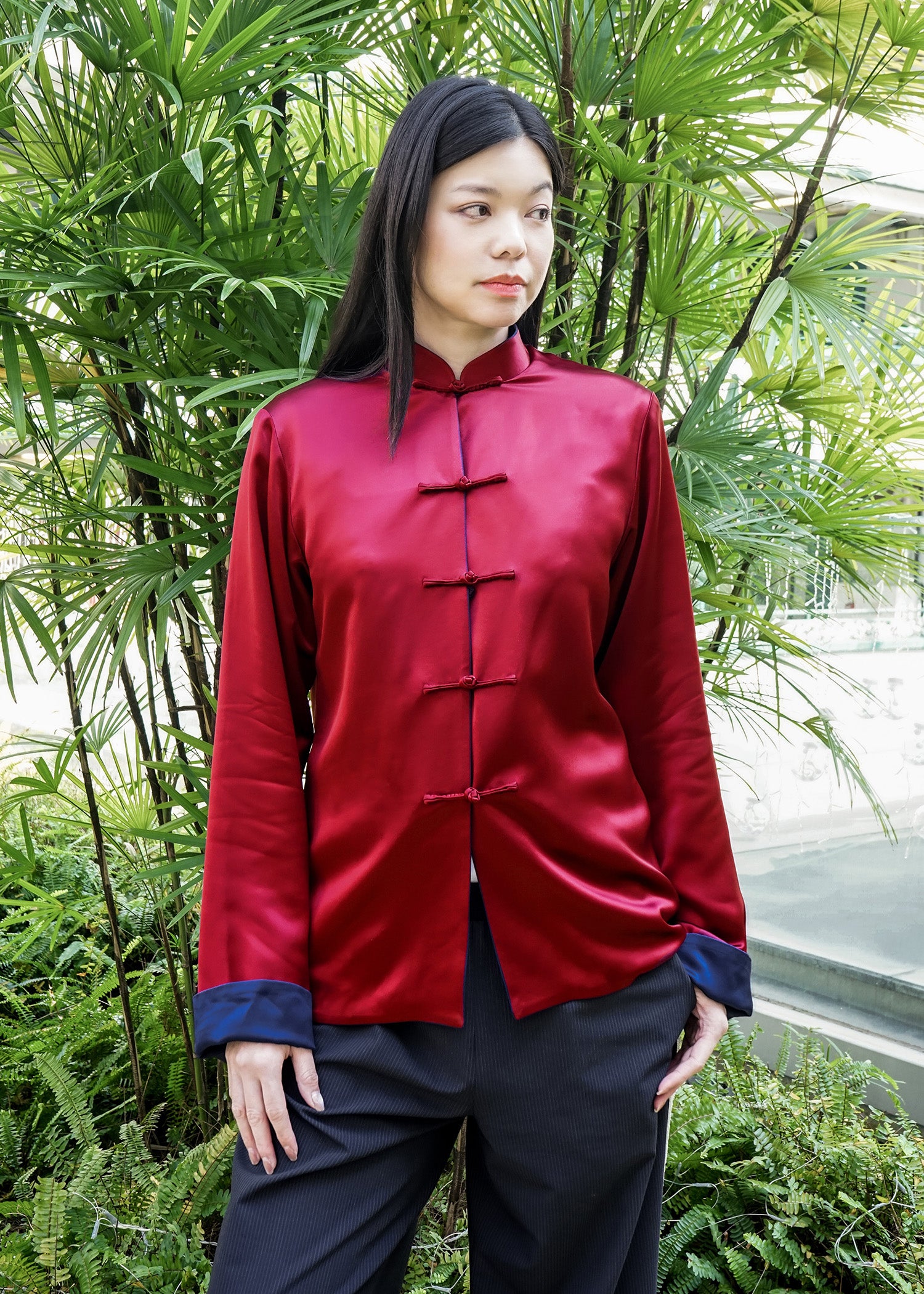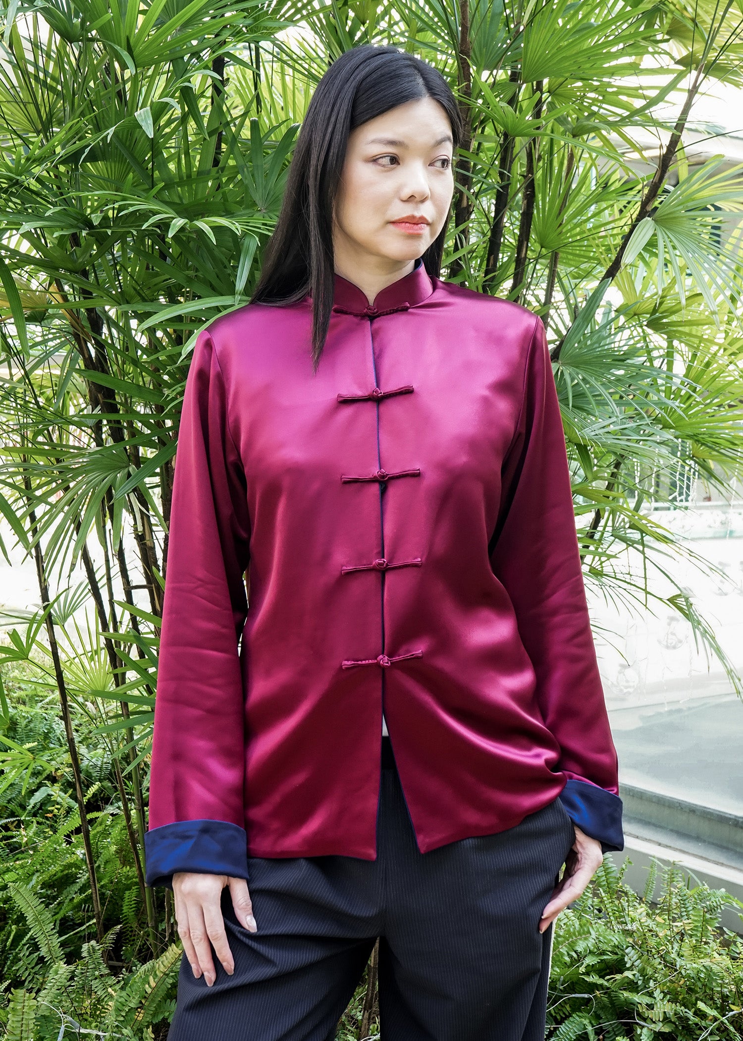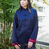 Elevate your style with our versatile reversible Tang jacket. Crafted from luxurious satin, this jacket features a dark blue side and a elegant burgundy side. Adorned with traditional frog buttons, it is perfect for both daily wear and Chinese New Year - a timeless addition to your wardrobe.
