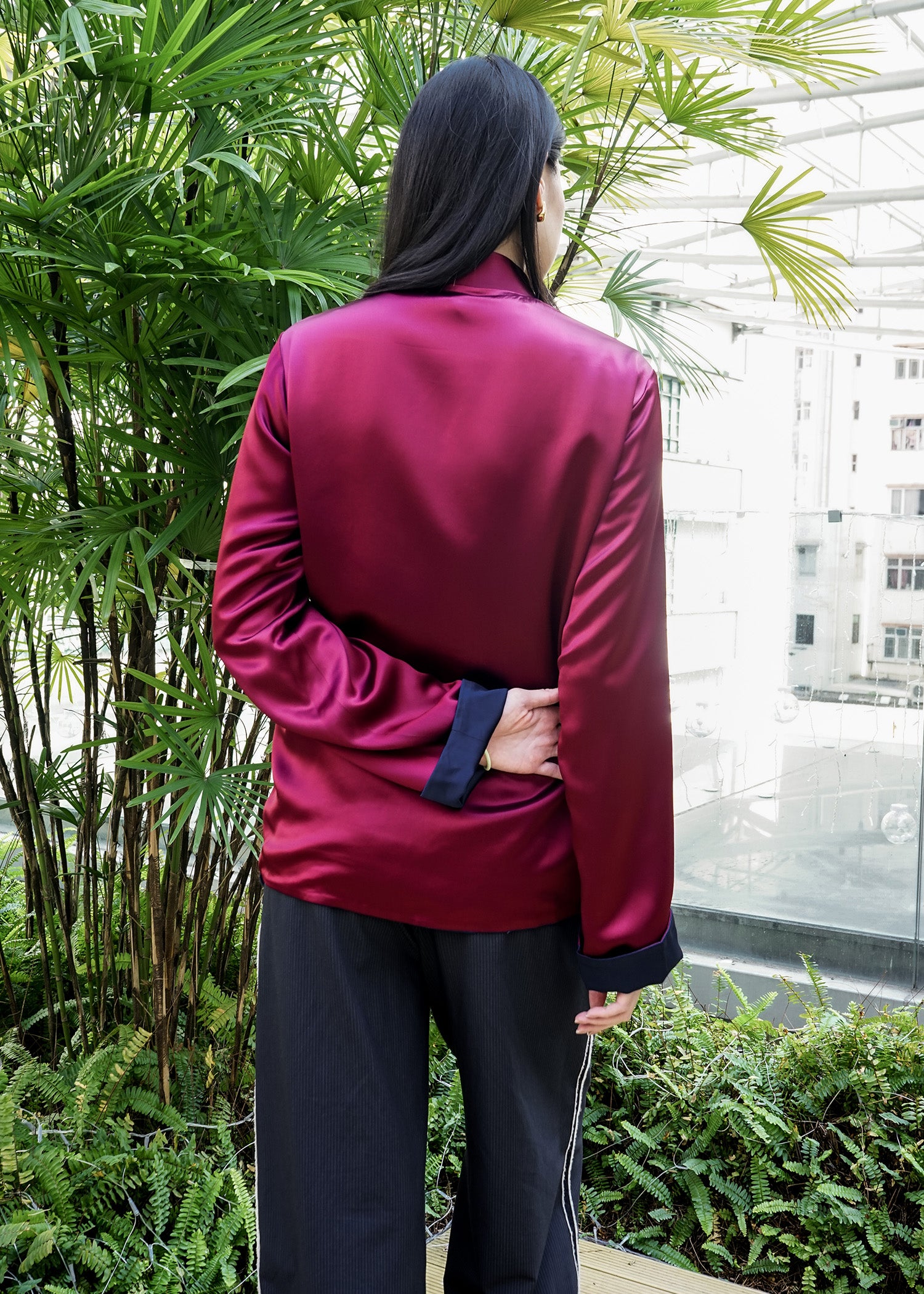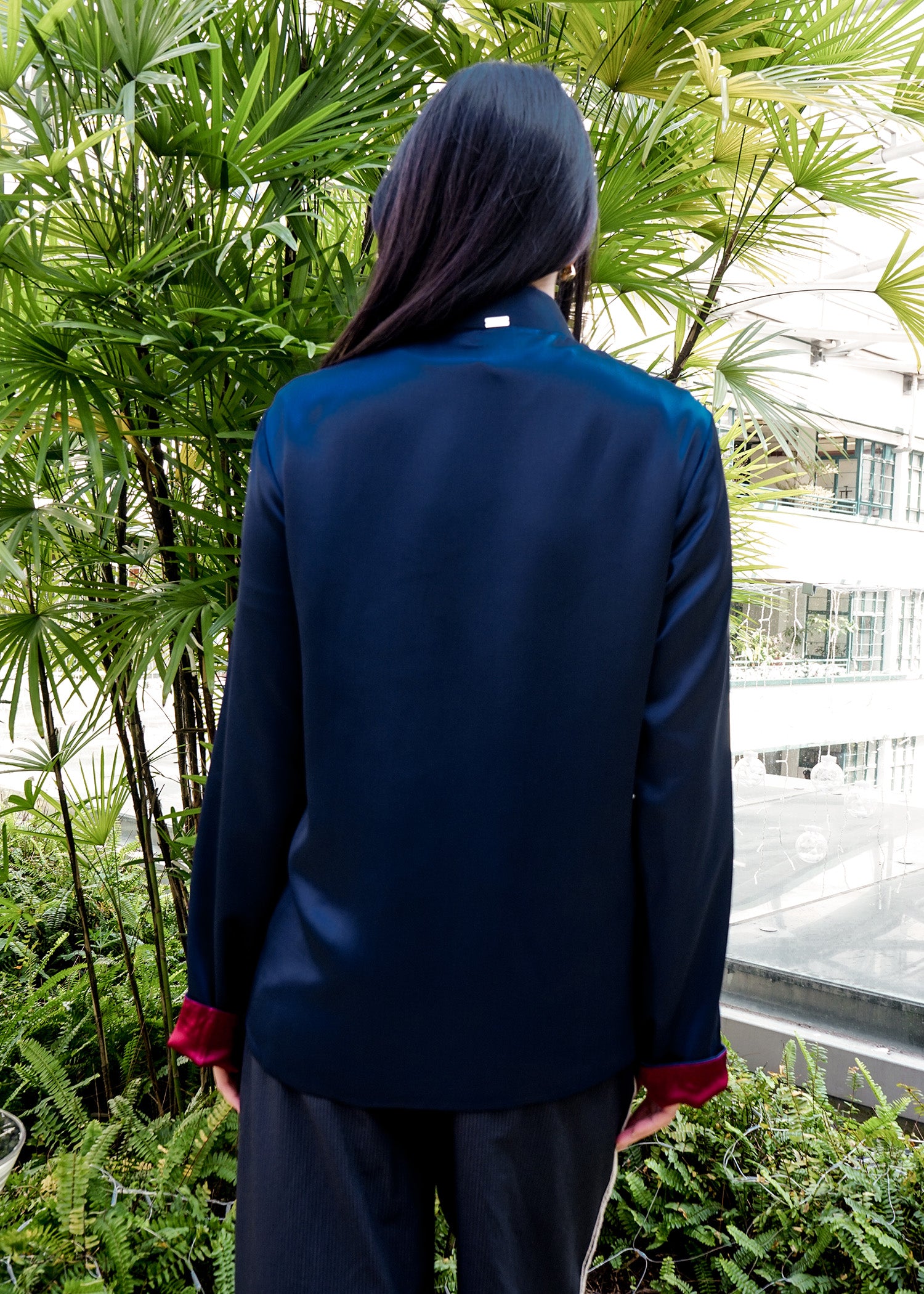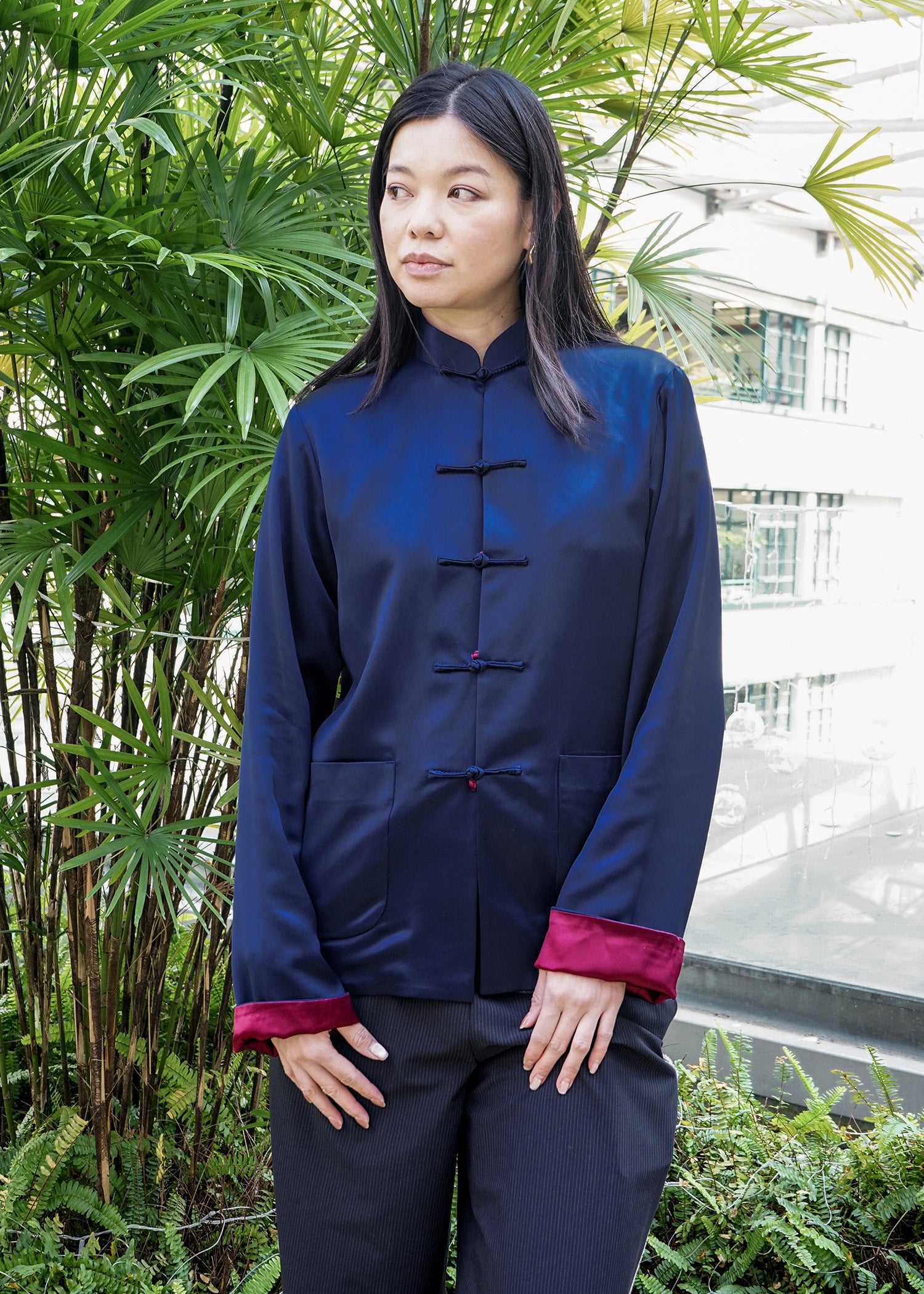 Elevate your style with our versatile reversible Tang jacket. Crafted from luxurious satin, this jacket features a dark blue side and a elegant burgundy side. Adorned with traditional frog buttons, it is perfect for both daily wear and Chinese New Year - a timeless addition to your wardrobe.