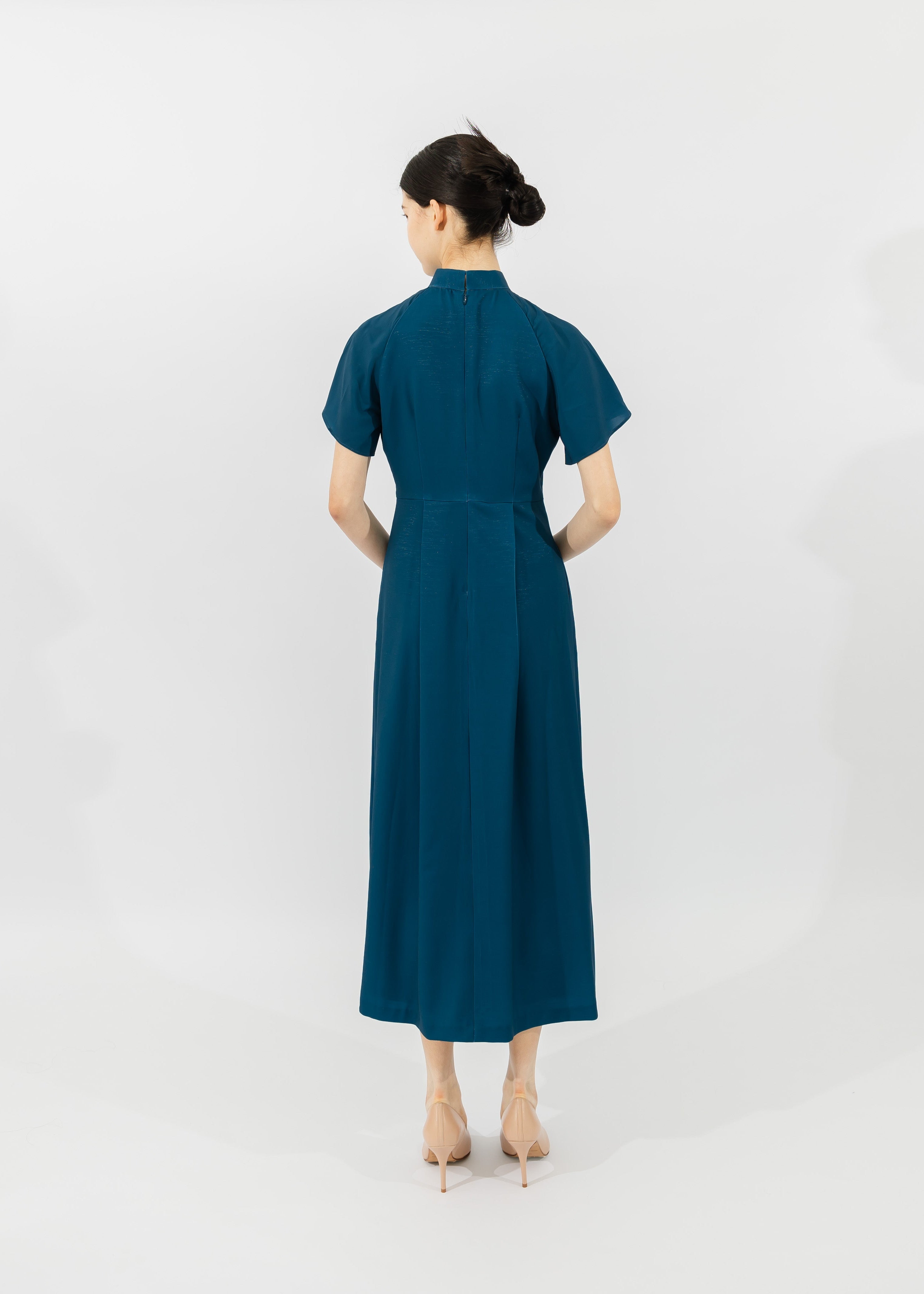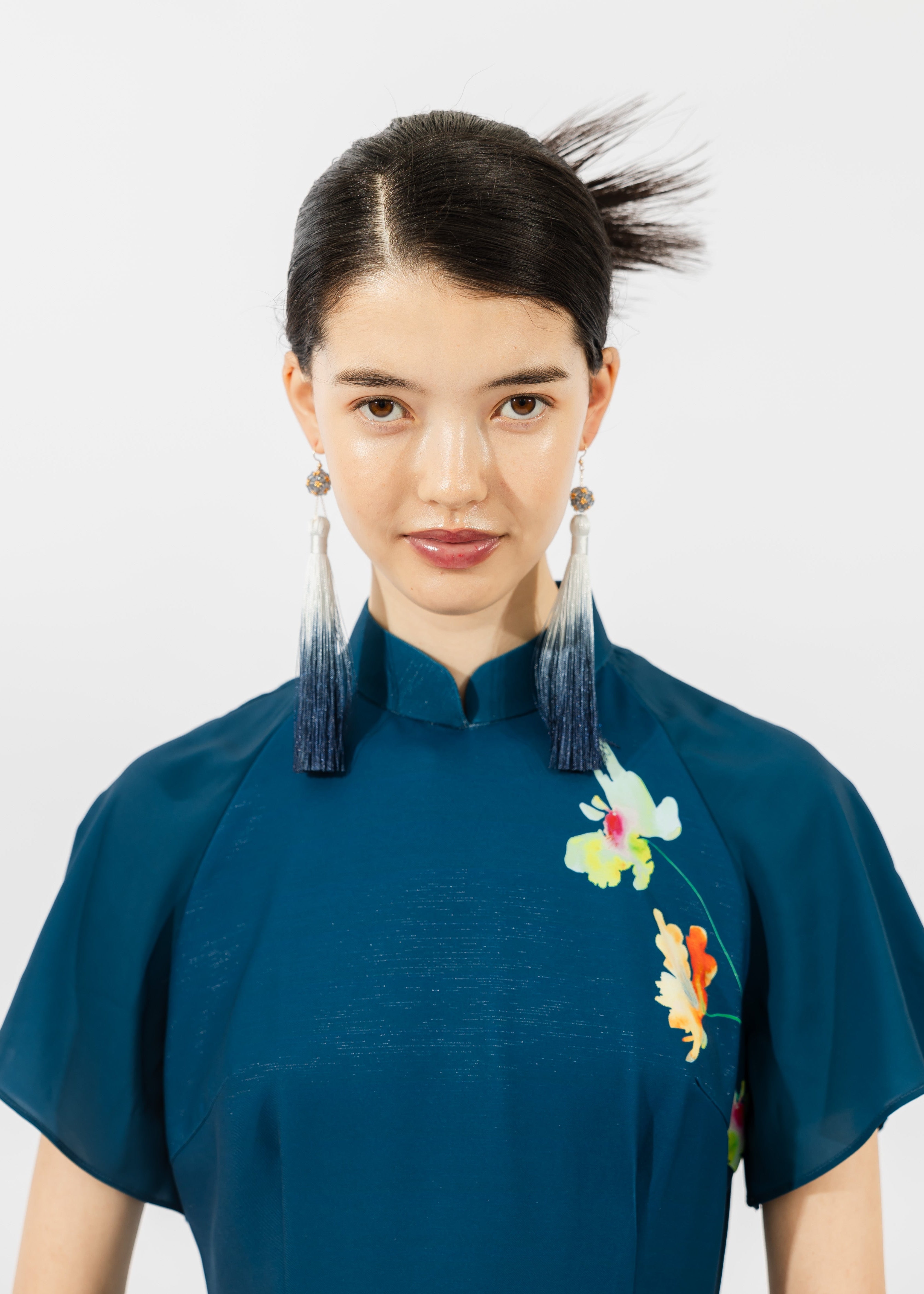 A contemporary qipao infused with soft movement and artistic expression. This midi-length design features fluttering chiffon sleeves that bring lightness and fluidity to the classic silhouette, while the structured bodice and panelled skirt create an elegant, elongated shape.