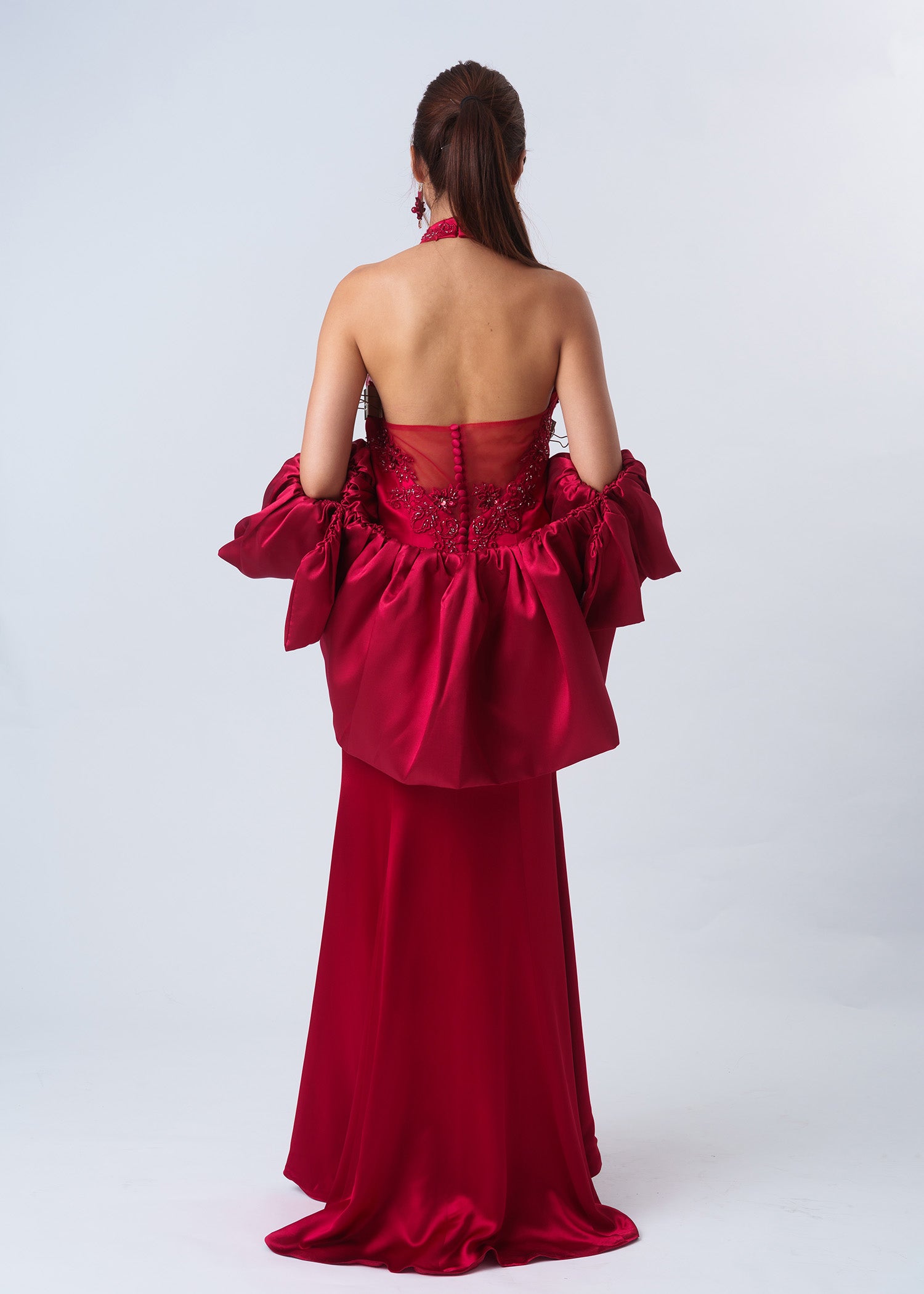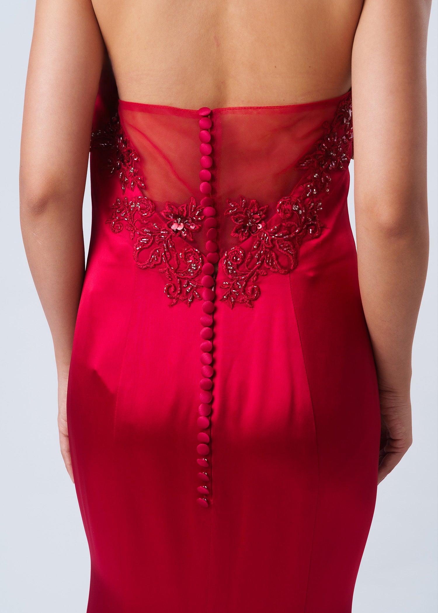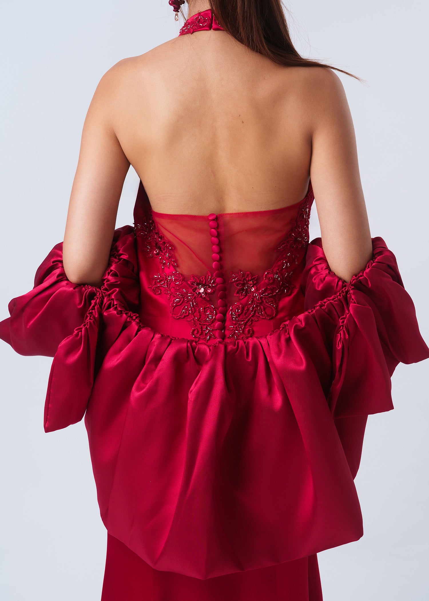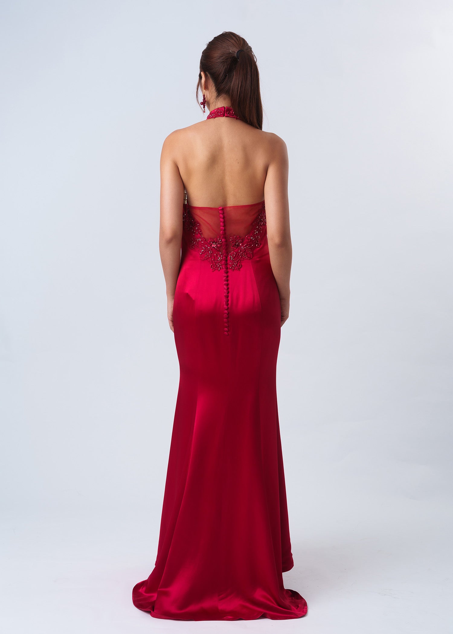 在您的特別日子裡,穿上我們的Nasturtium緞面婚禮深紅色旗袍,讓您成為眾人矚目的焦點。完美融合了東方傳統與西方優雅,這款旗袍設計採用了浪漫的心形領口,優雅地搭配經典的企領設計,魚尾裙剪能凸顯您的身形曲線,創造出令人驚艷的造型。