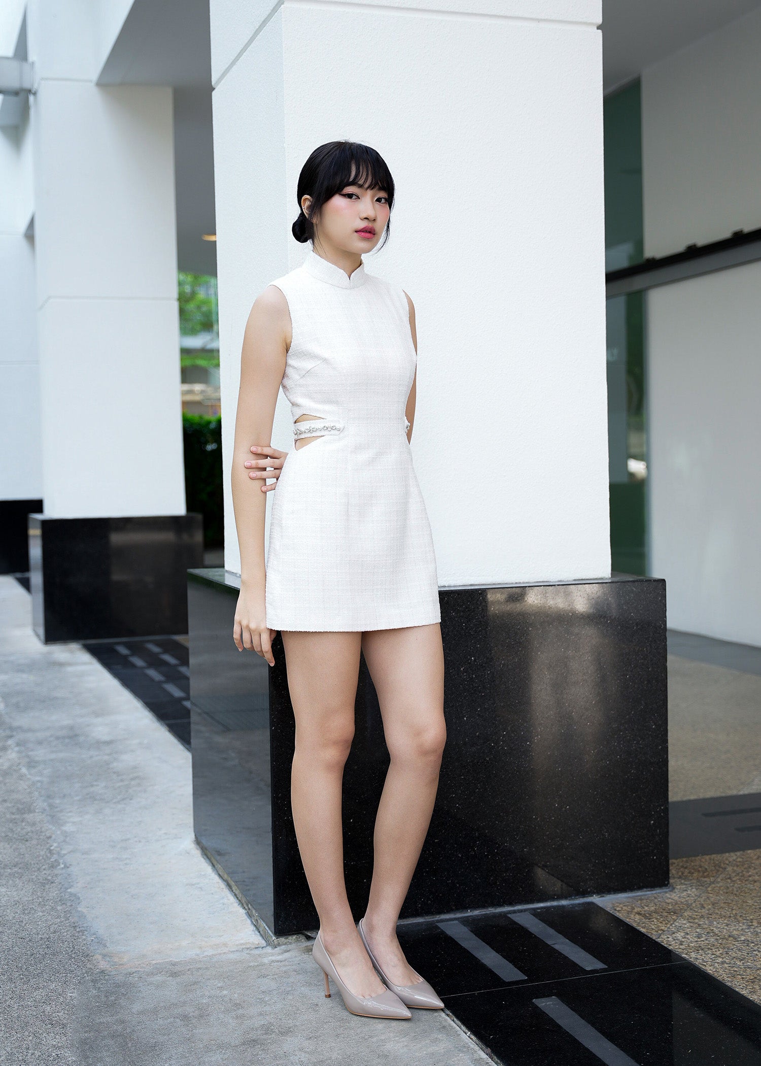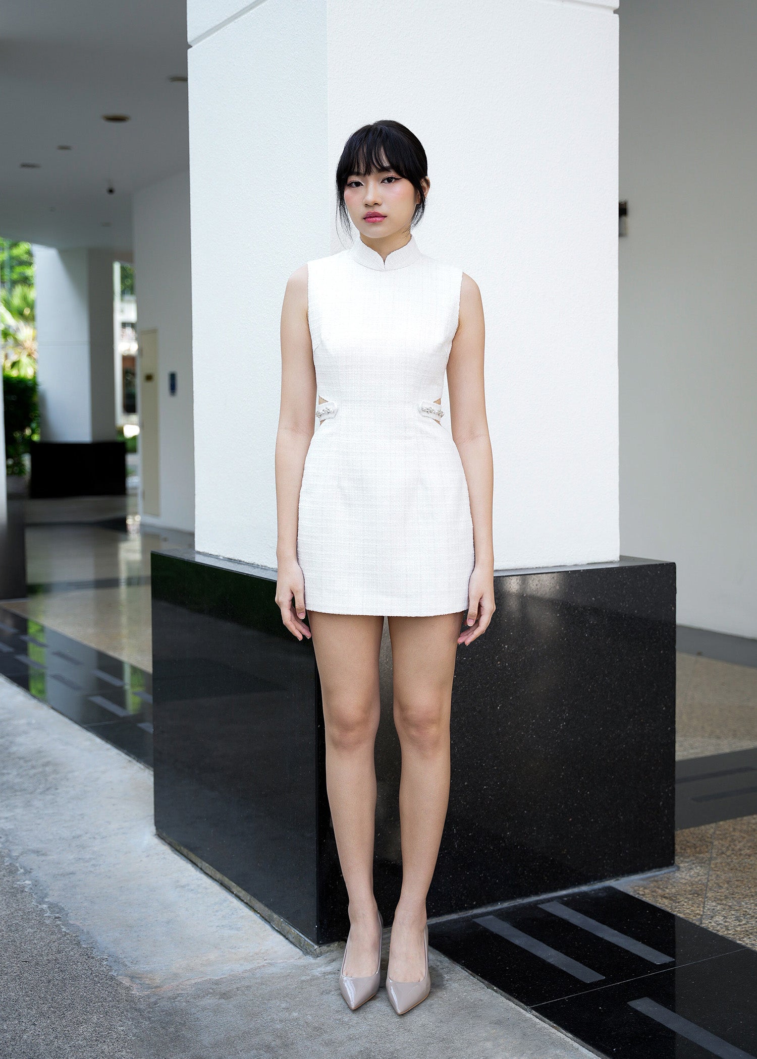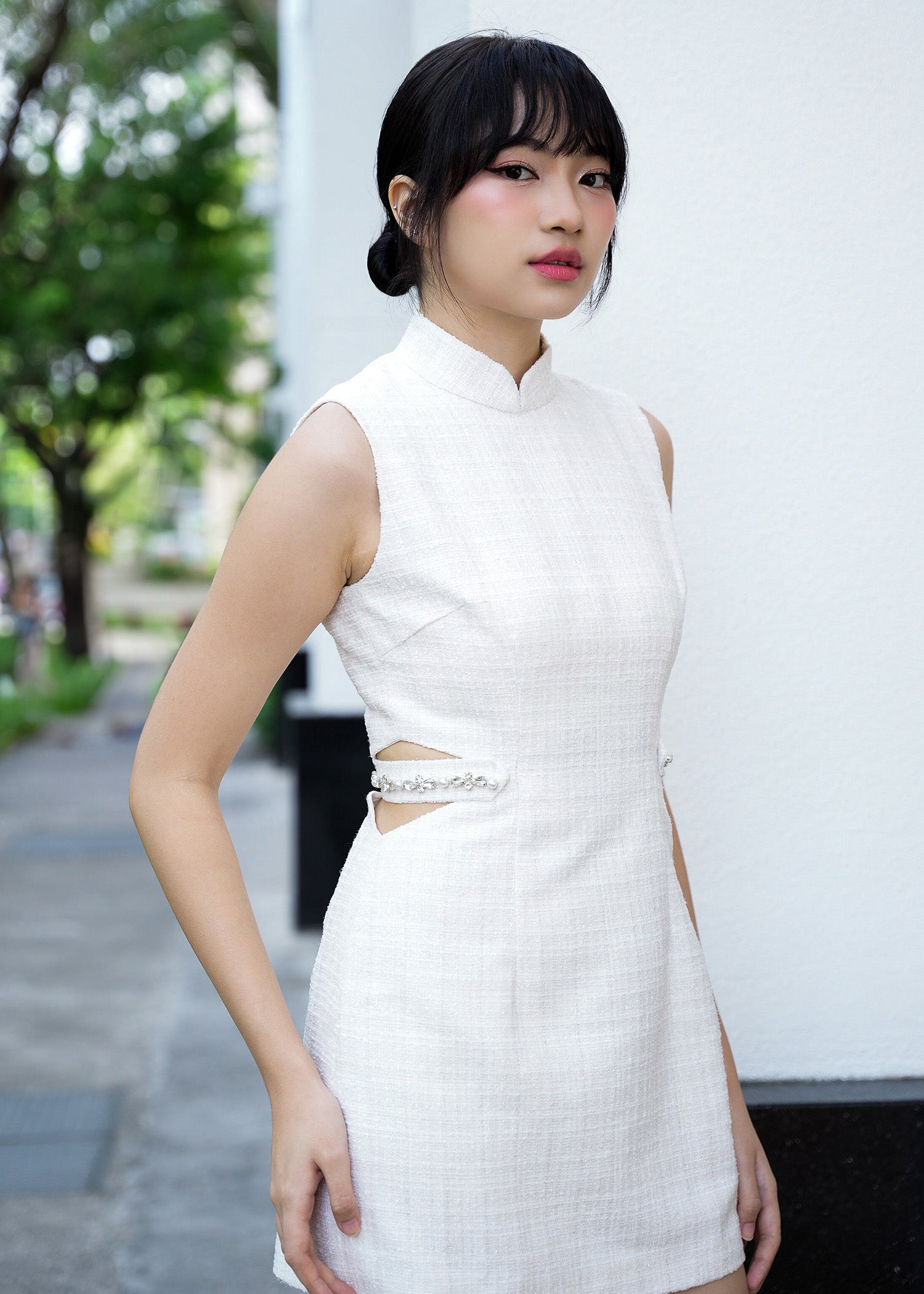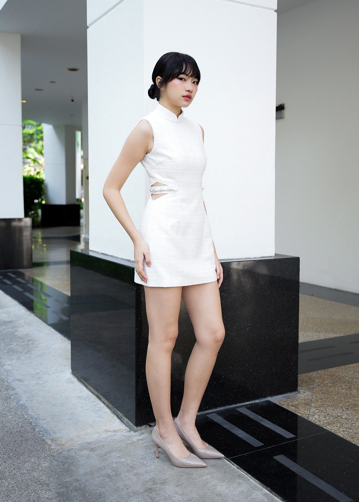 我們的Gardenia鏤空西式旗袍迷你裙採用了輕盈柔軟的粗花呢面料製成。結合了現代感與經典風格,這款迷你貼身旗袍採用了立領設計,並在腰部位置鏤空點綴水晶裝飾增添了奢華氣息,令整體造型更加迷人奪目。這款旗袍非常適合晚宴和婚姻登記等場合佩戴。搭配白色細高跟鞋和垂墜耳環,整體造型優雅動人。
