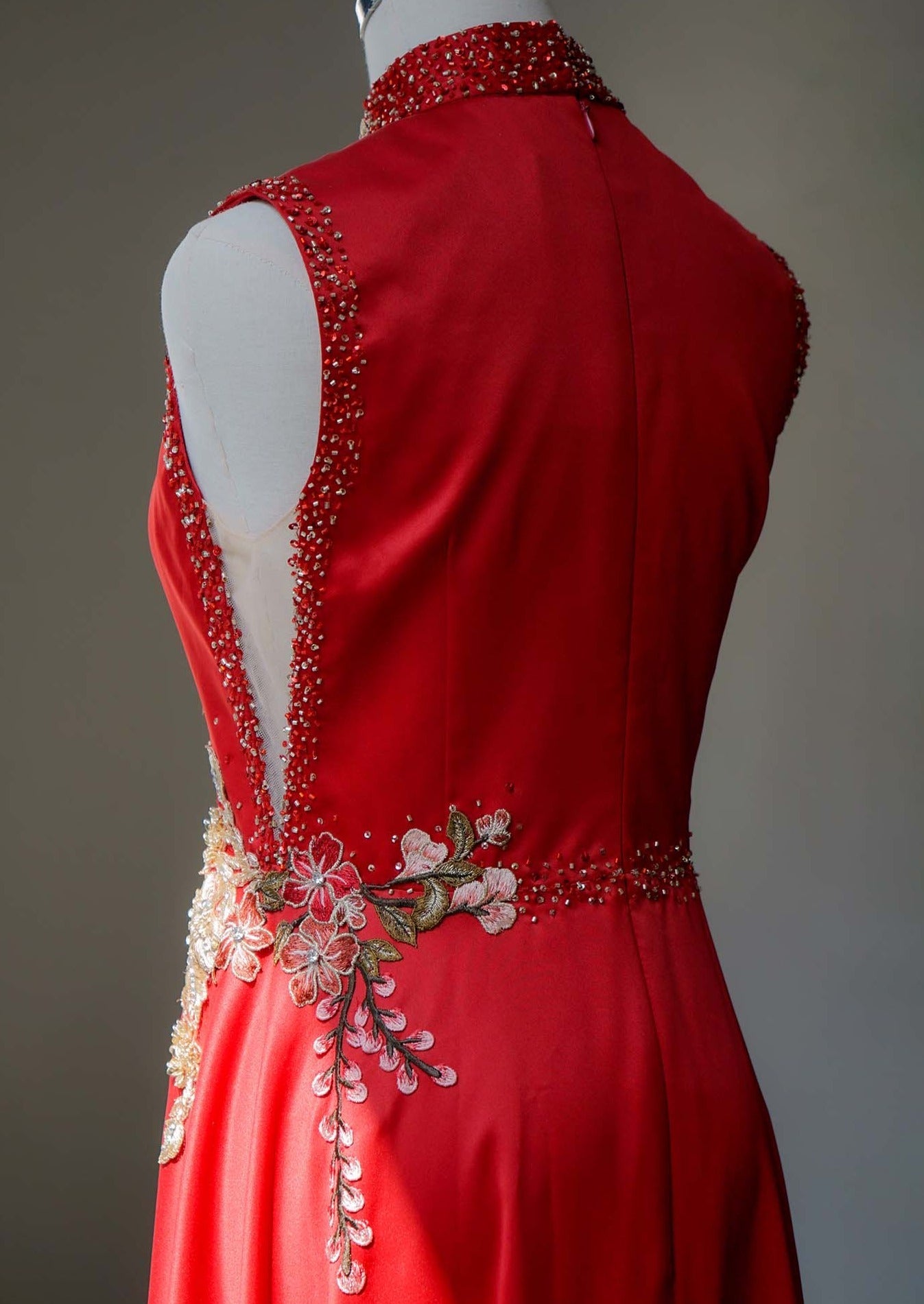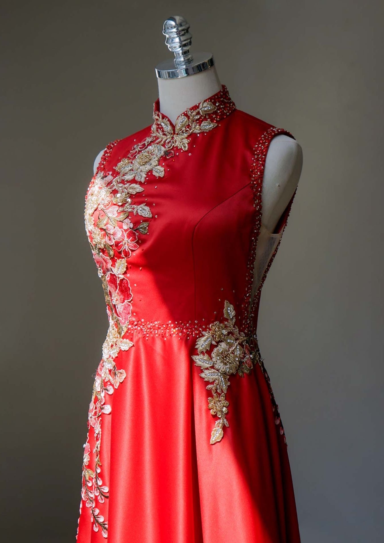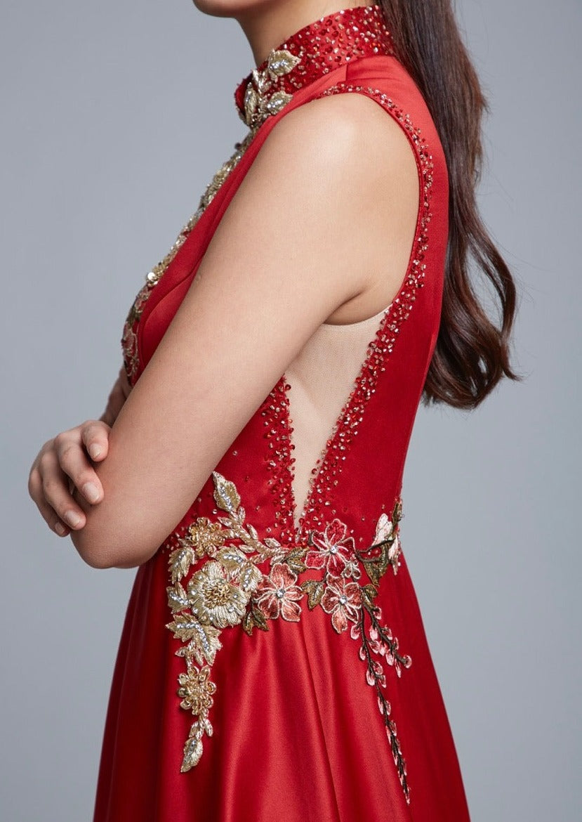 我們設計的每件紅色旗袍都以現代新娘為中心,這件旗袍也不例外。紅色Bauhinia旗袍採用緞面布料製成,A 字裙擺適合各種體型。禮服腰身兩側採用膚色網紗,再搭配中式立領以及由我們的裁縫精心手工縫製花卉裝飾,確實是獨一無二的。