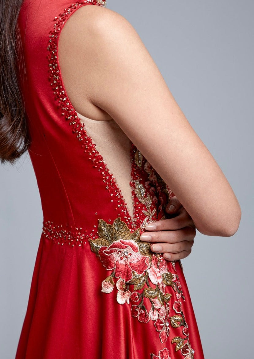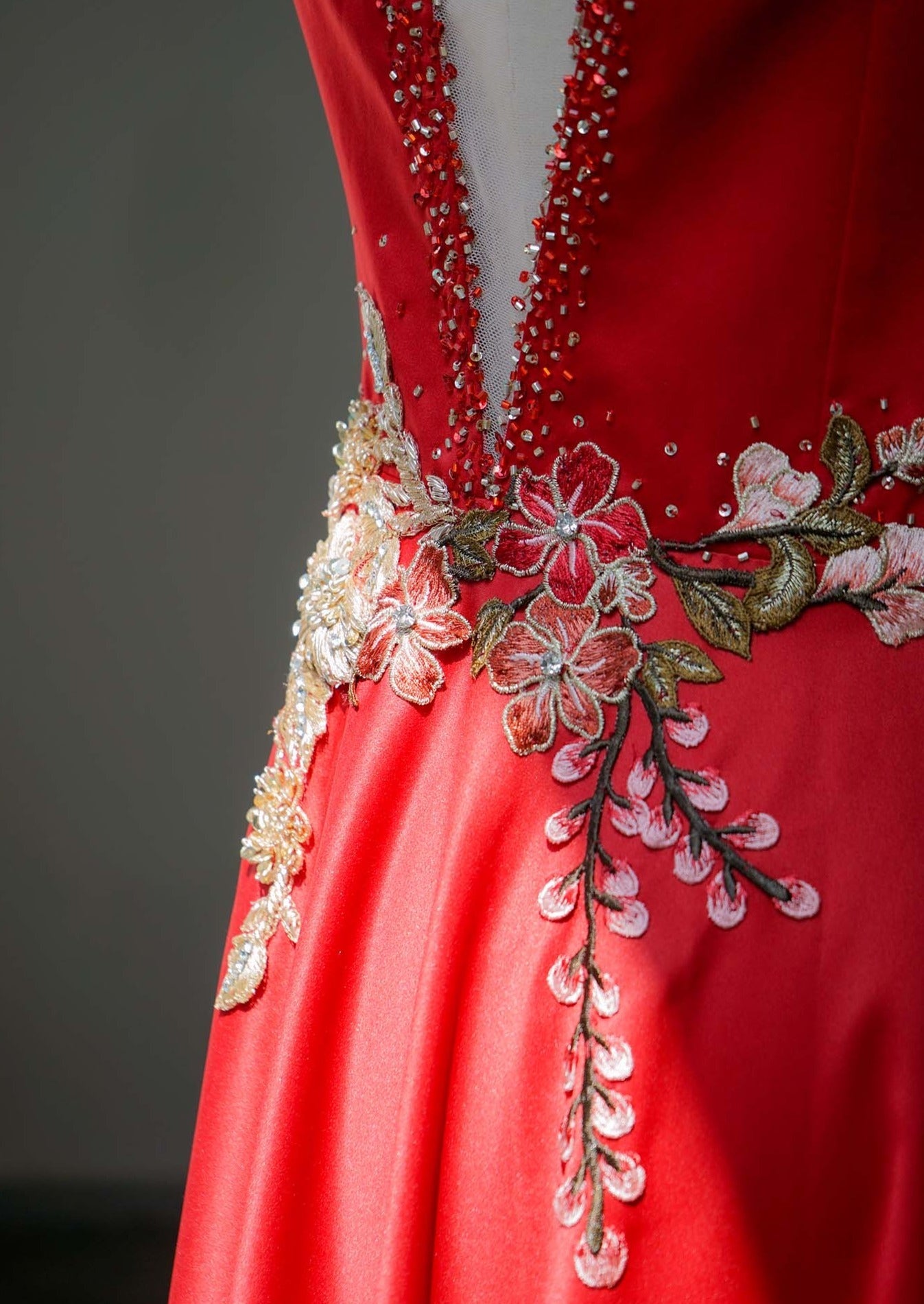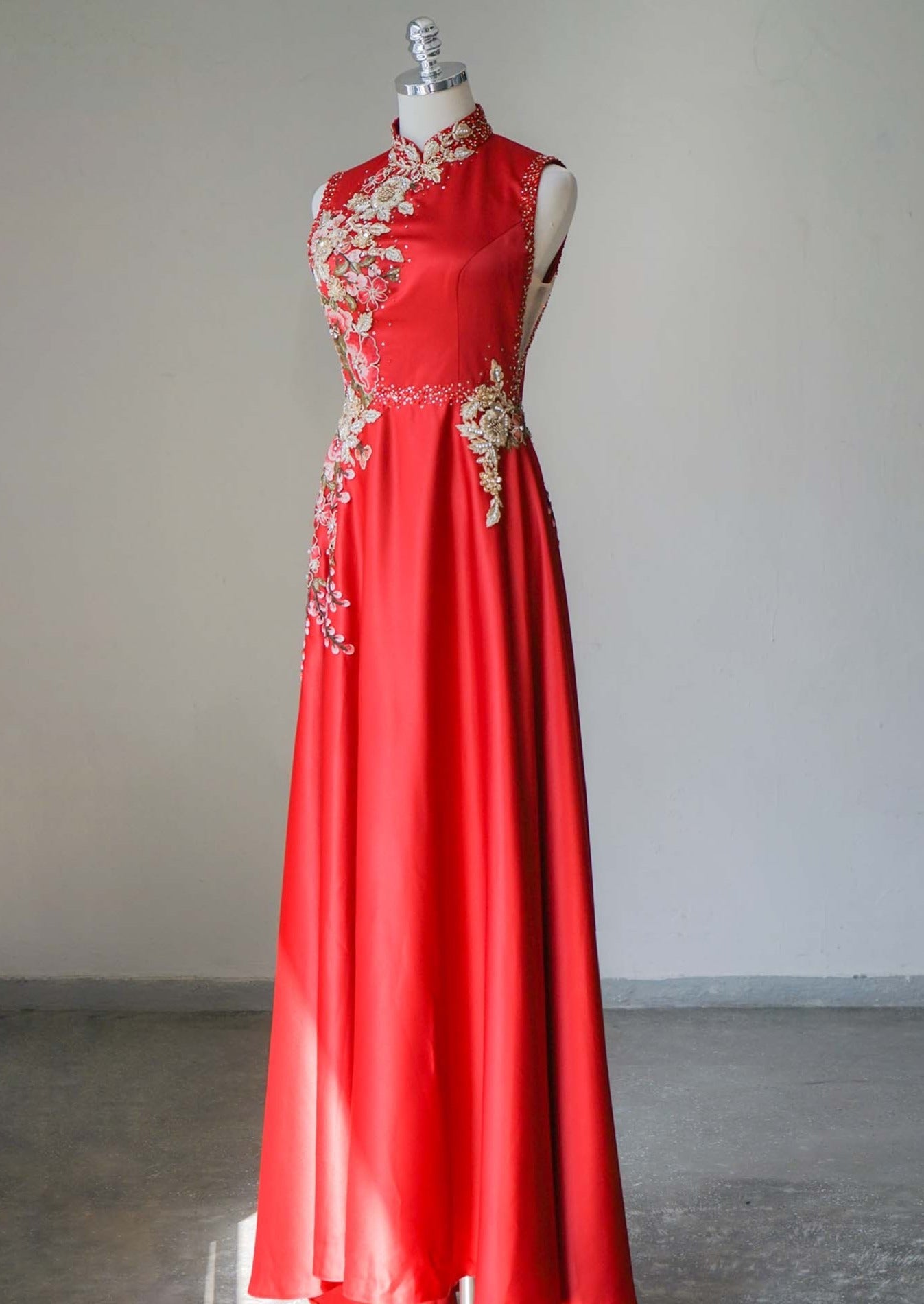 我們設計的每件紅色旗袍都以現代新娘為中心,這件旗袍也不例外。紅色Bauhinia旗袍採用緞面布料製成,A 字裙擺適合各種體型。禮服腰身兩側採用膚色網紗,再搭配中式立領以及由我們的裁縫精心手工縫製花卉裝飾,確實是獨一無二的。