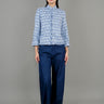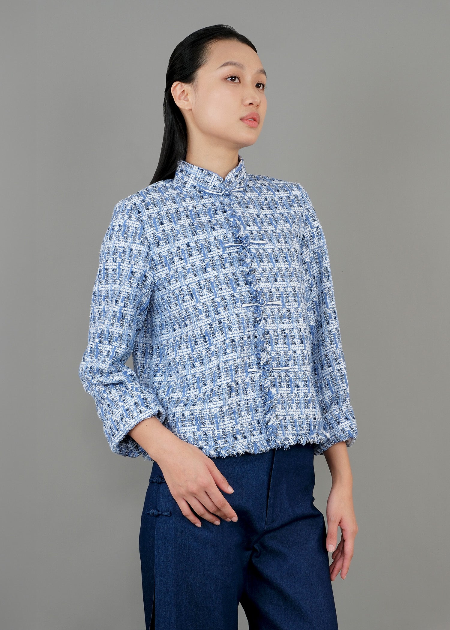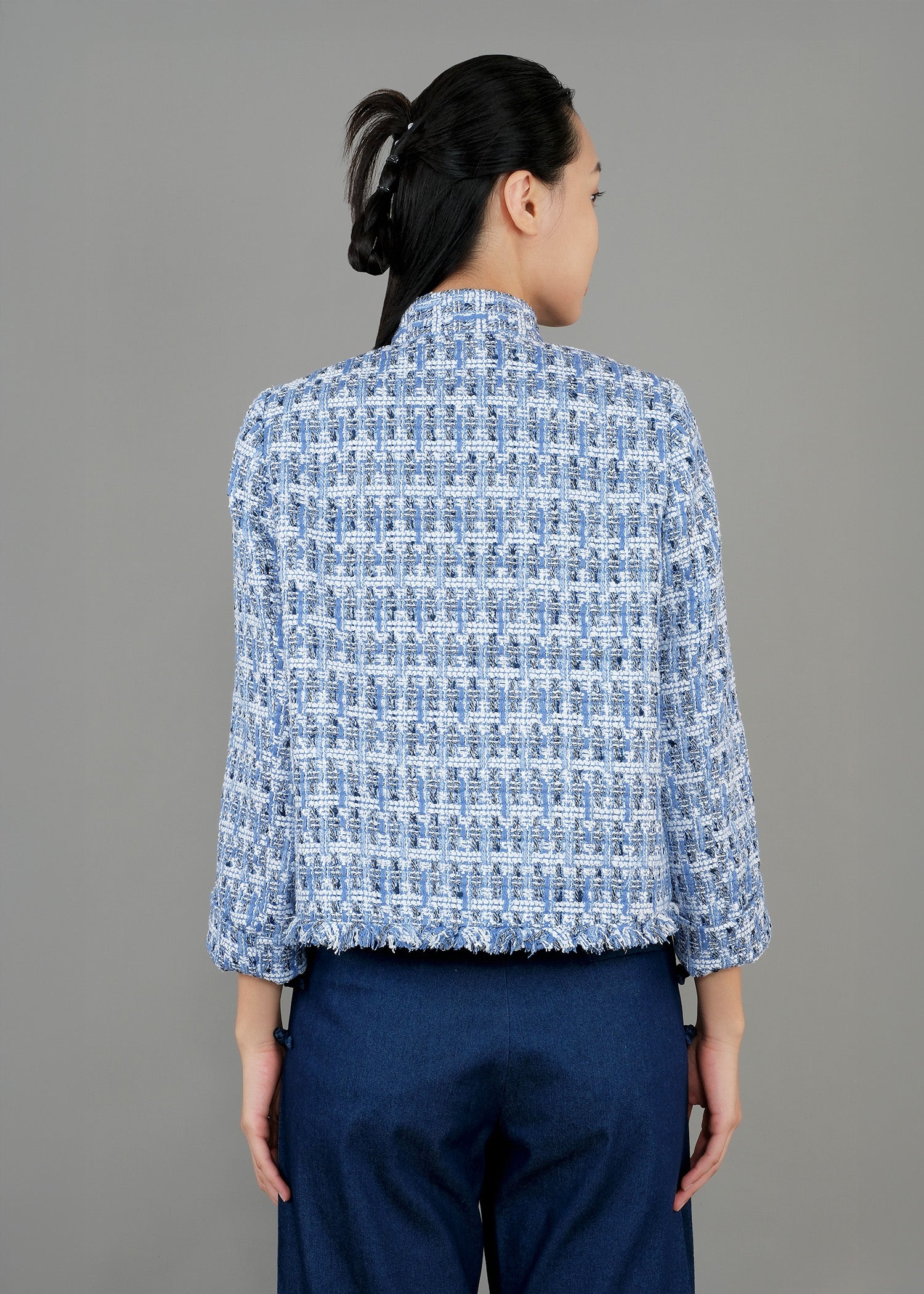 以精緻藍色粗花呢打造,這款外套散發低調奢華氣質。俐落的立體剪裁結合經典領口與精巧鈕扣,勾勒出優雅而洗練的輪廓。質感豐富的粗花呢面料,增添層次與永恆魅力,無論是正式場合或精緻休閒穿搭,皆能展現不凡品味。