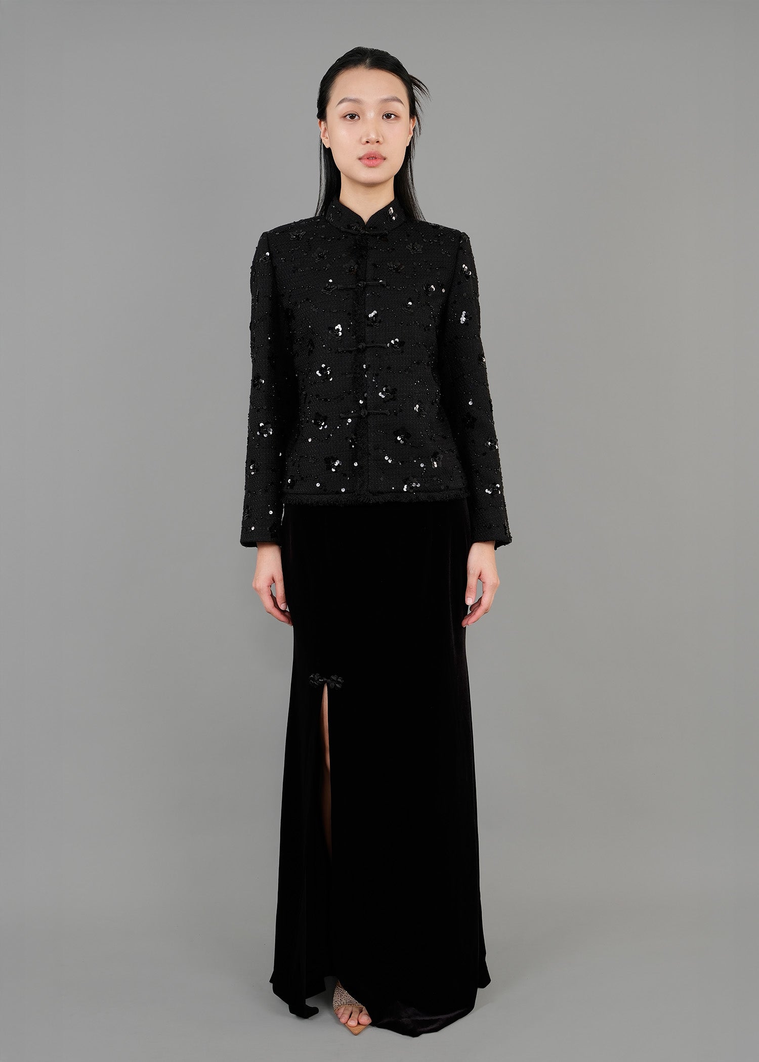 以經典黑色搭配精緻亮片圖案,這款粗花呢唐裝外套為你的衣櫥注入低調華麗。略帶A字的剪裁,巧妙融合傳統優雅與現代魅力。搭配修身長褲可展現洗練格調,配上牛仔褲則輕鬆打造率性時尚。