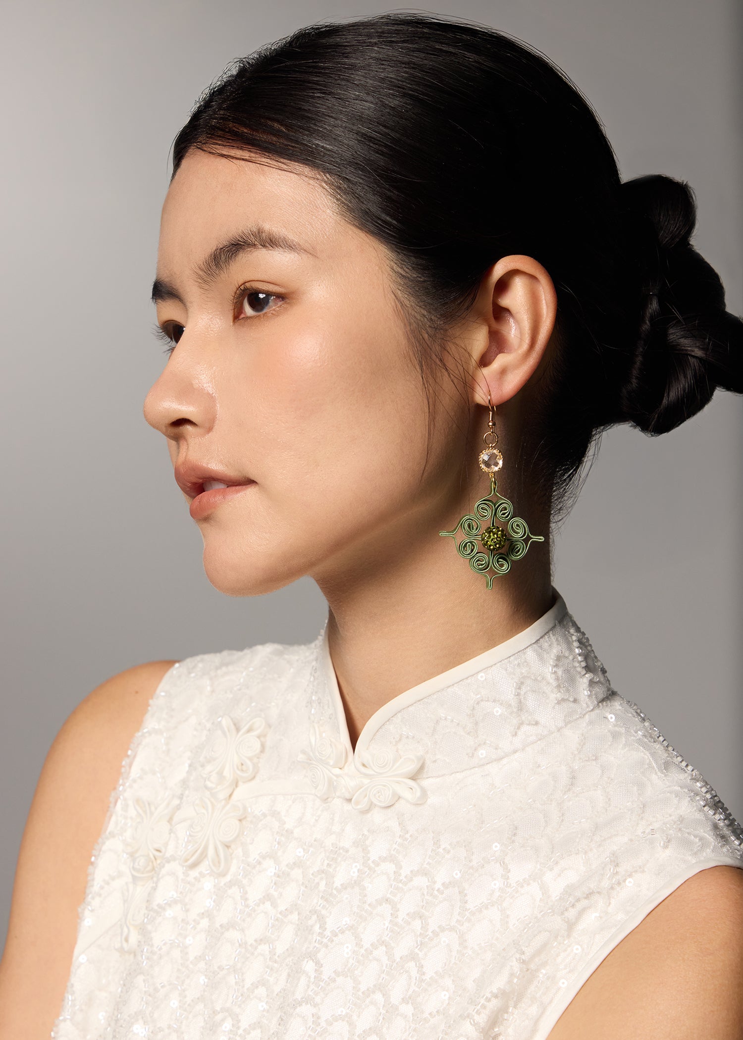 我們的如意盤扣耳環完美融合了傳統優雅與現代設計。修長的造型使得這款耳環無論是搭配派對旗袍,還是精緻的日常裝扮,都能有效提升整體氣質,彰顯出獨特的魅力與風格。