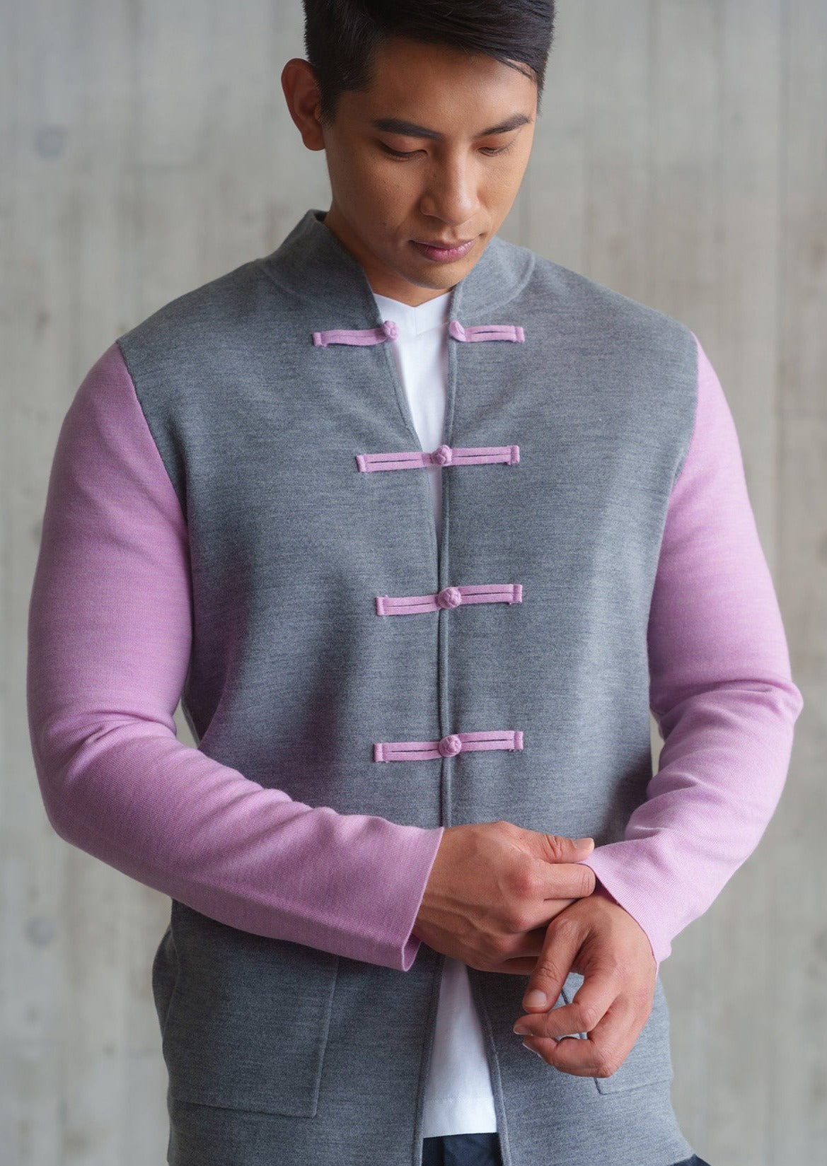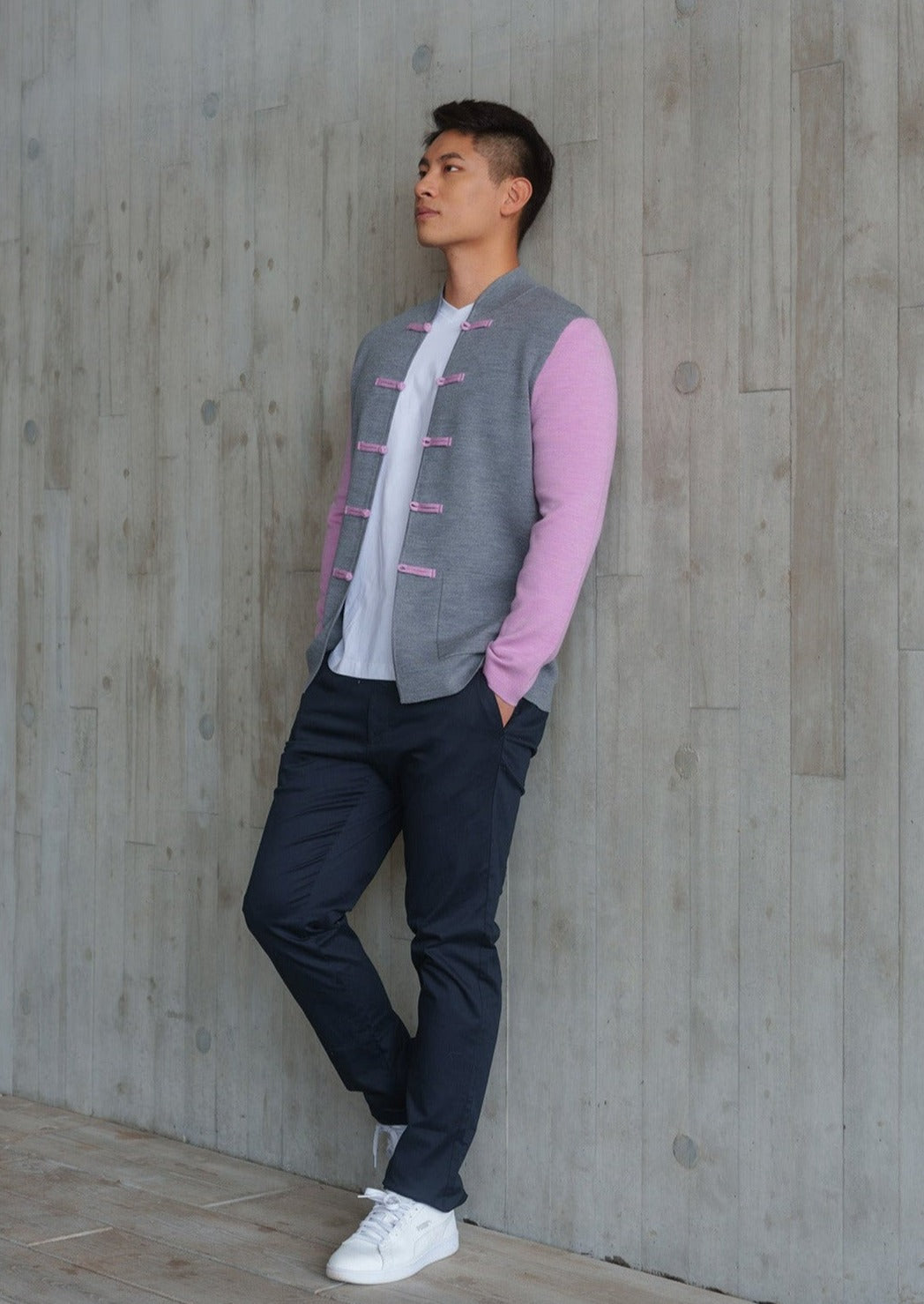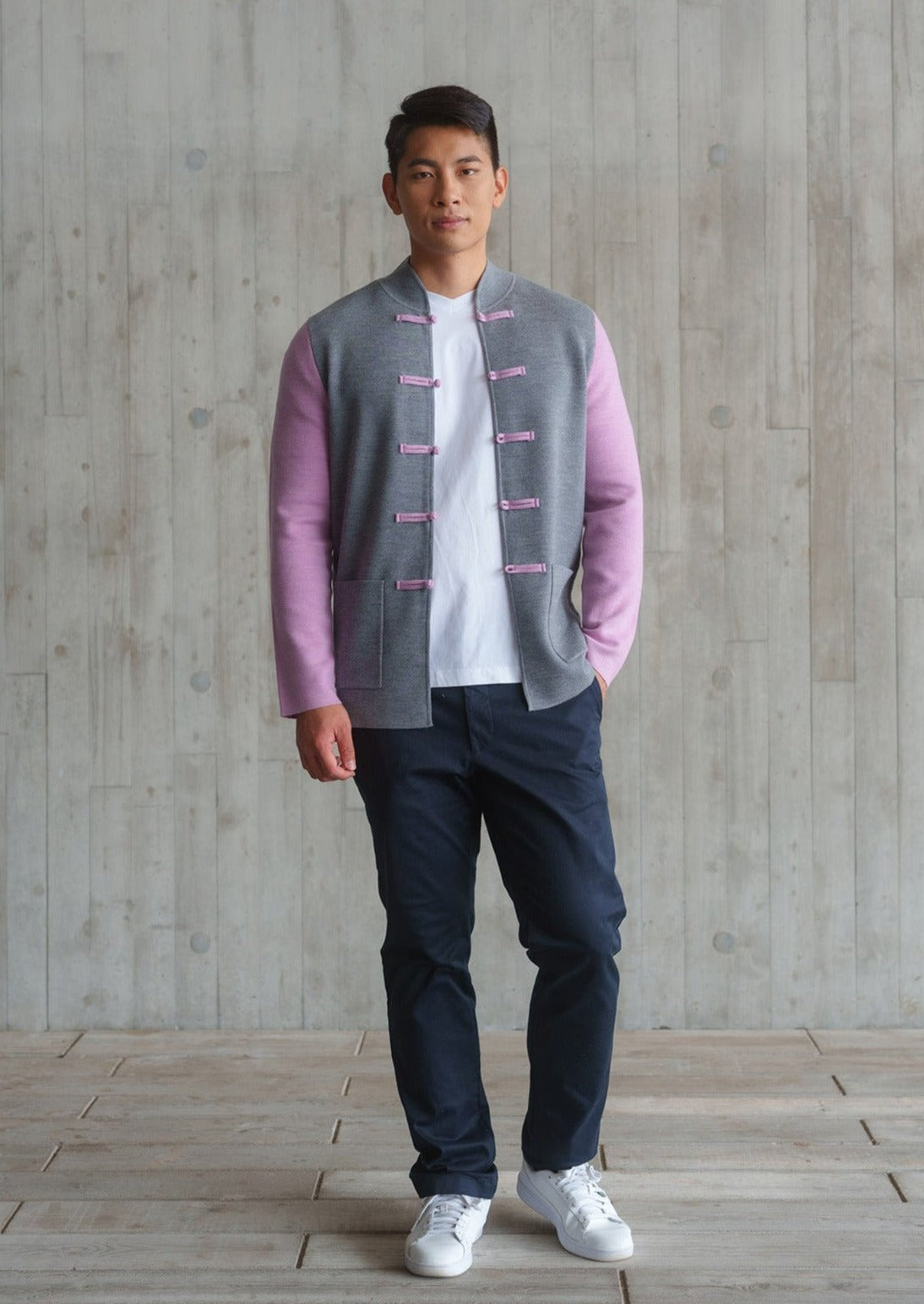 拼色針織中式唐裝外套 (灰色/ 紫色)