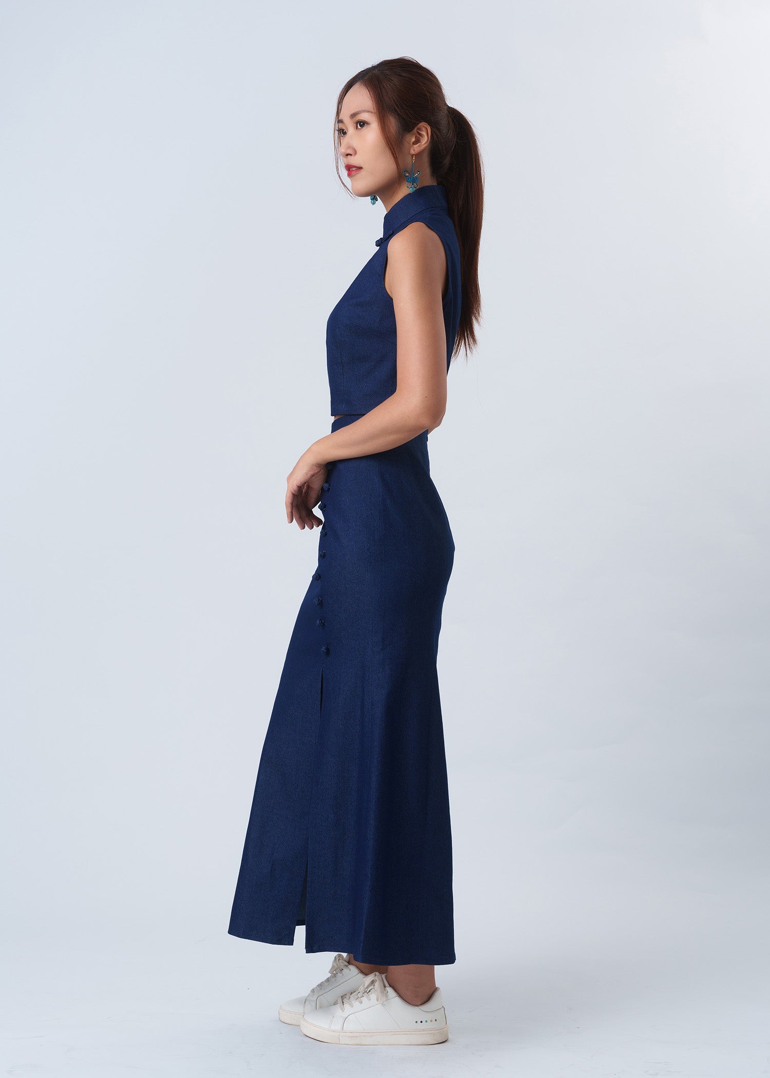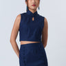 女士無袖水滴領牛仔唐裝上衣 (牛仔藍色)