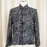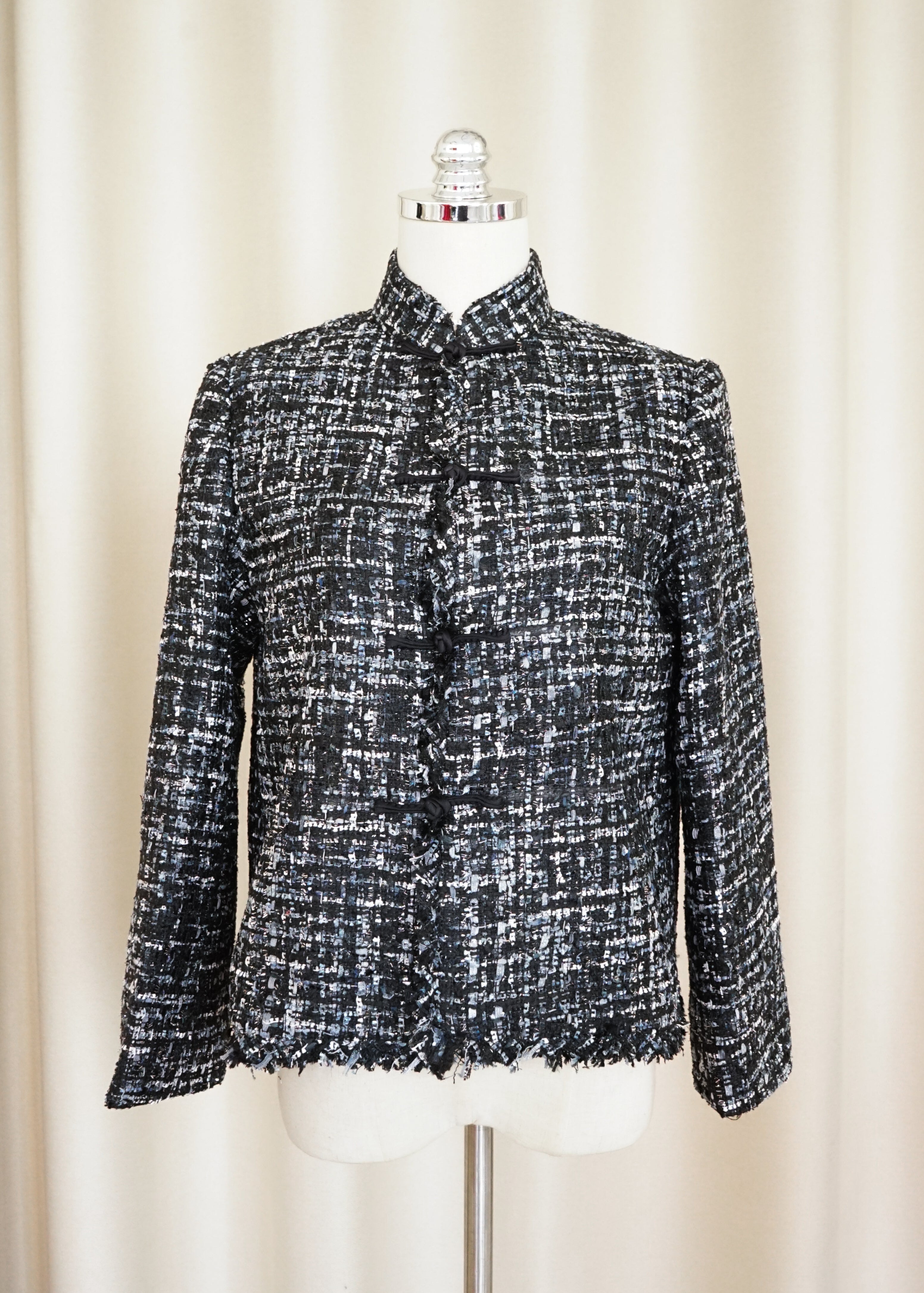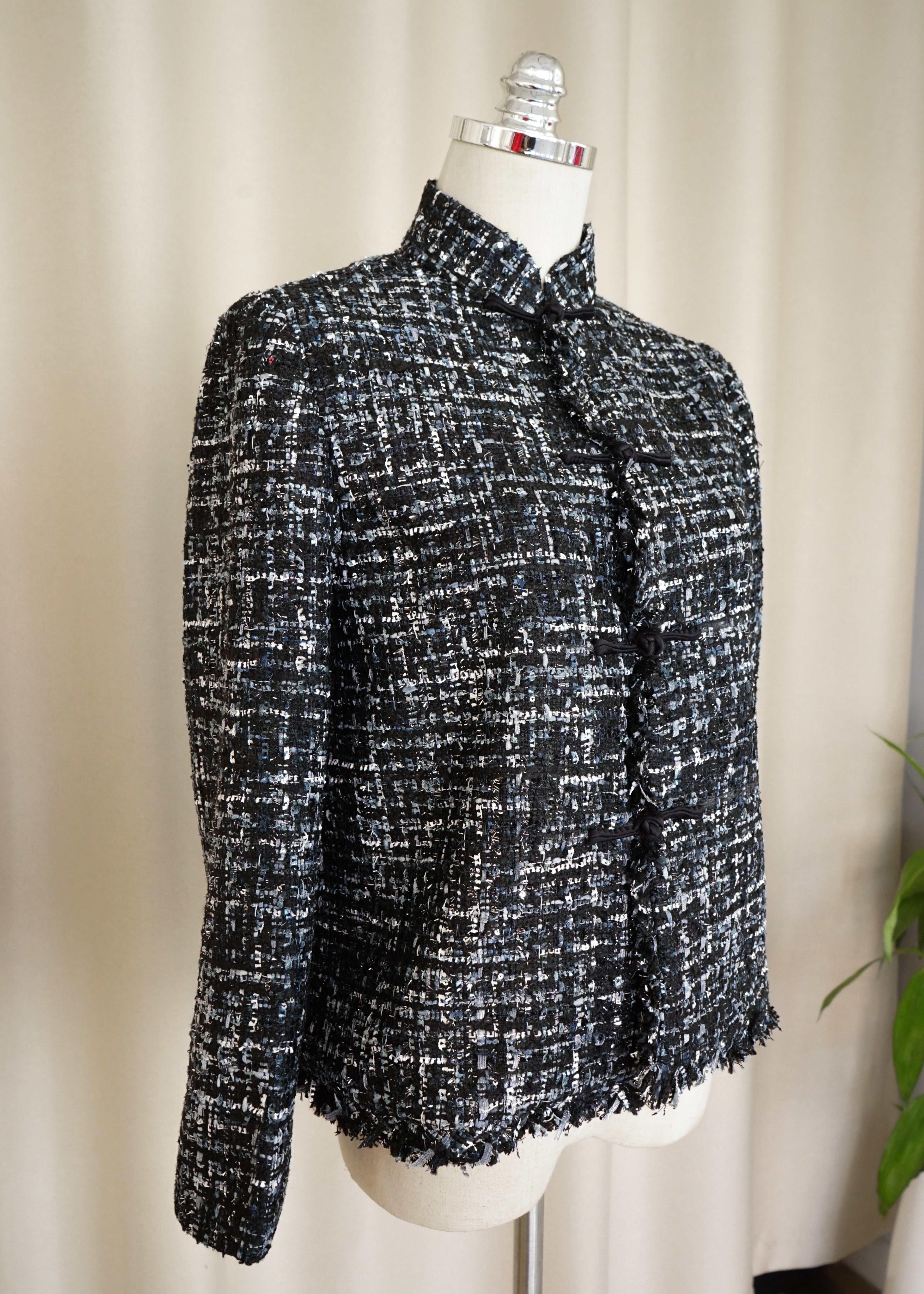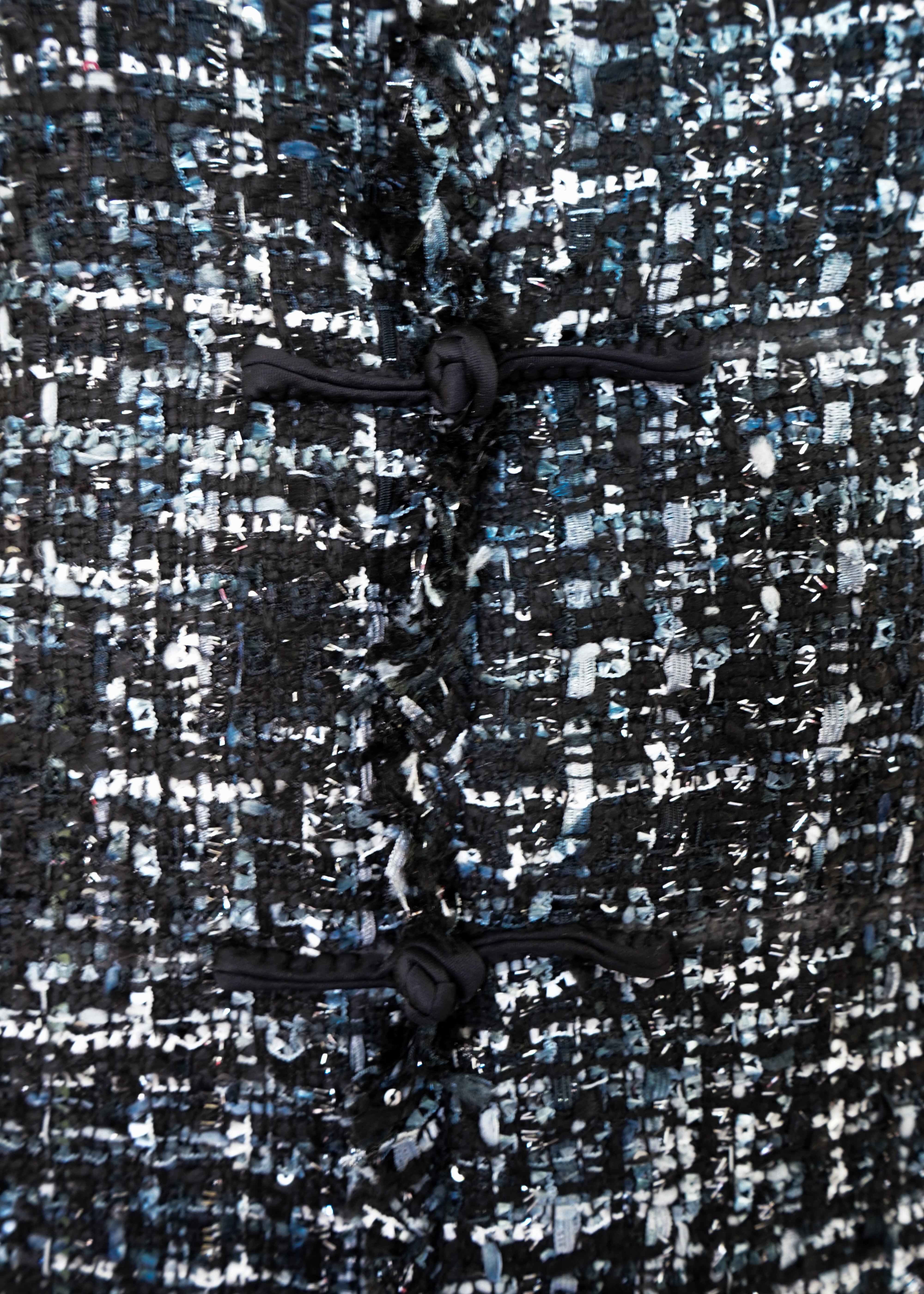 現在推出我們的經典混合藍色花呢料唐裝外套!這款外套設計有優雅的緞面盤扣,點綴亮片,為任何造型增添了一絲精緻感和閃耀光彩。非常適合將您的休閒造型提升至時尚風格。