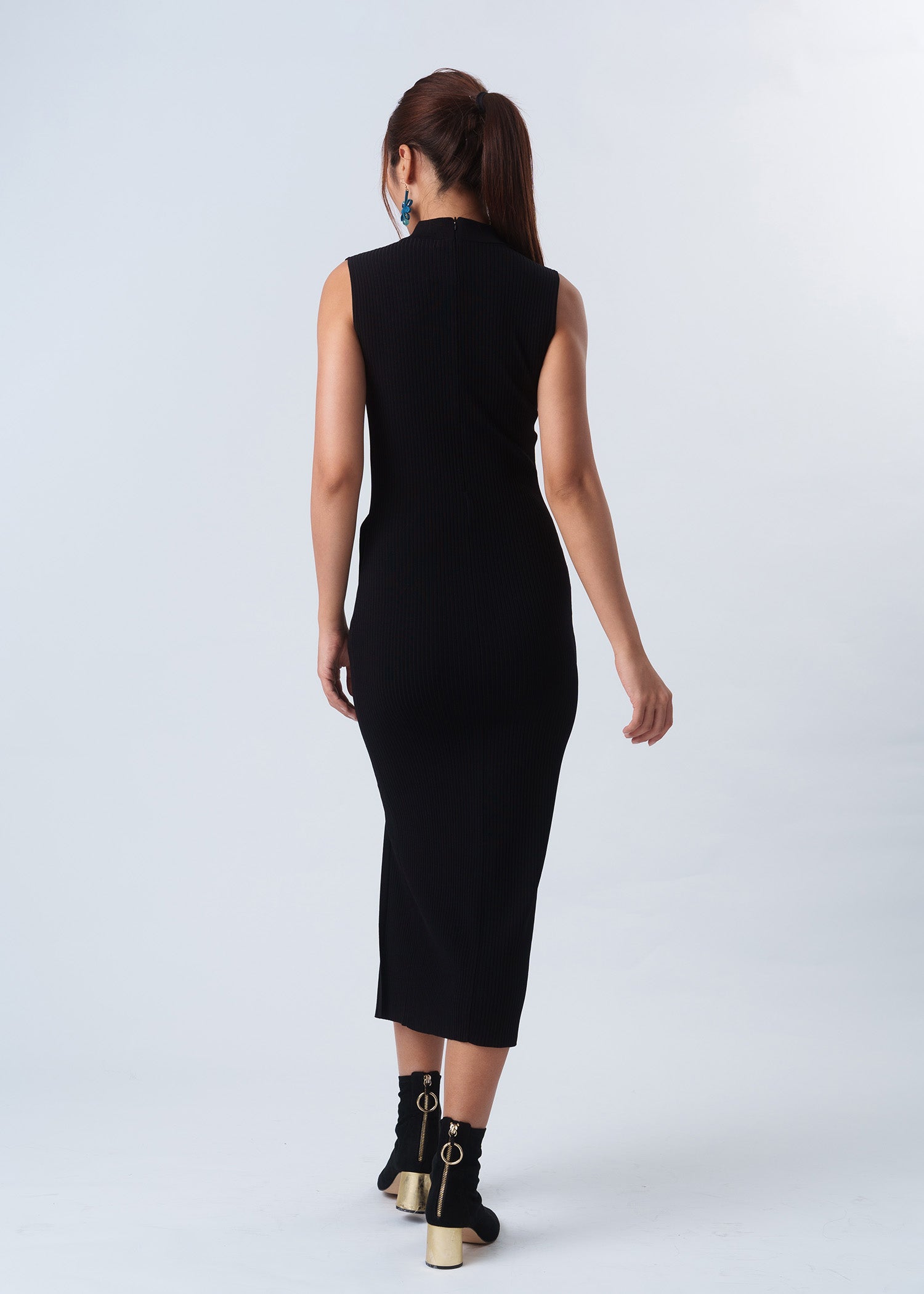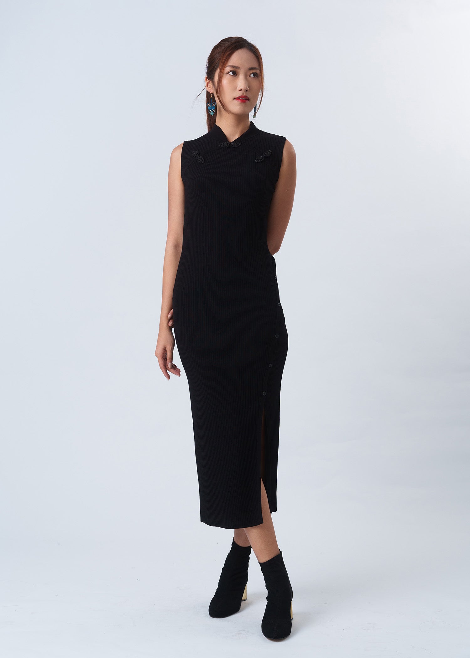 女士中式無袖羅紋盤扣側衩旗袍 (黑色)