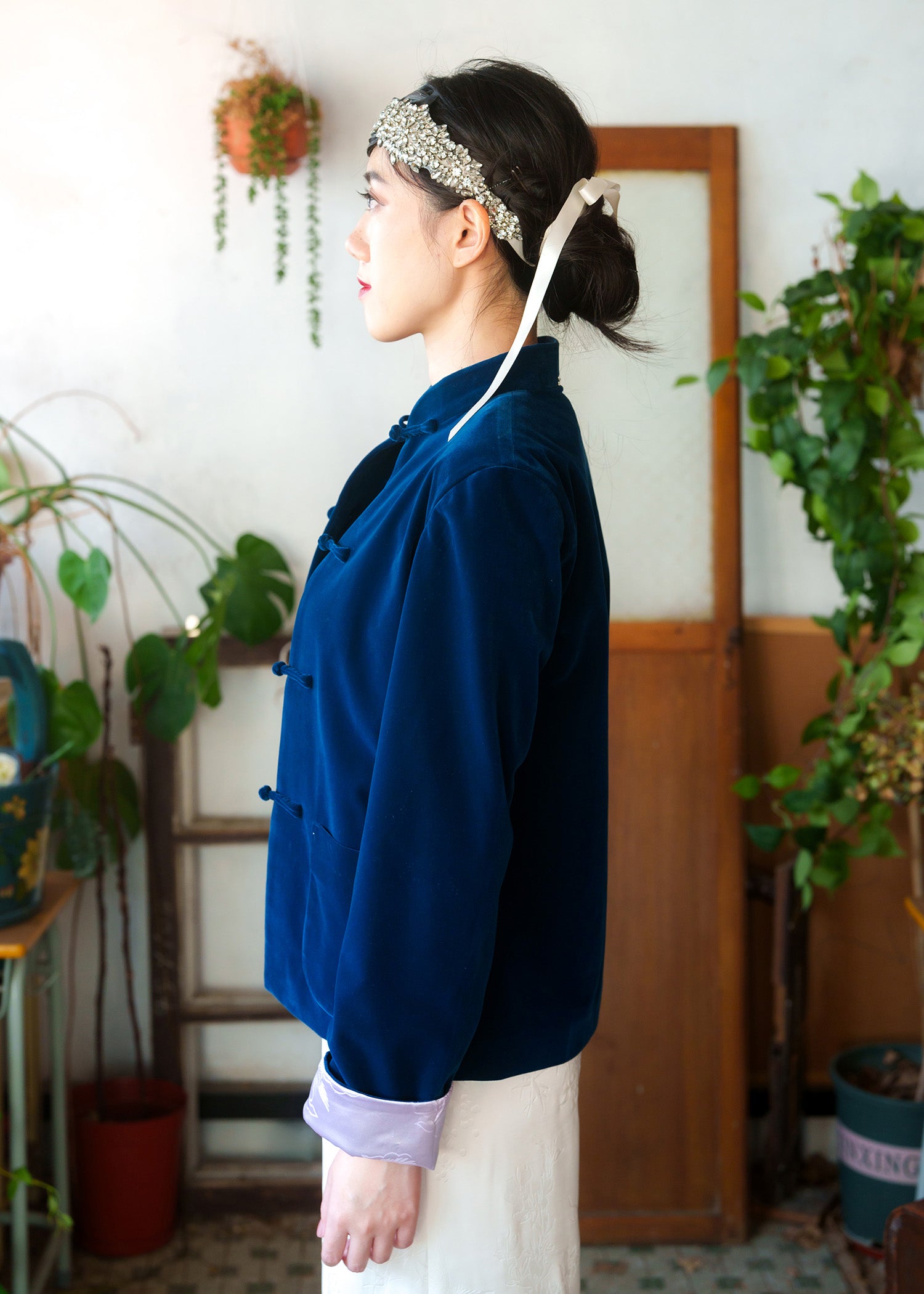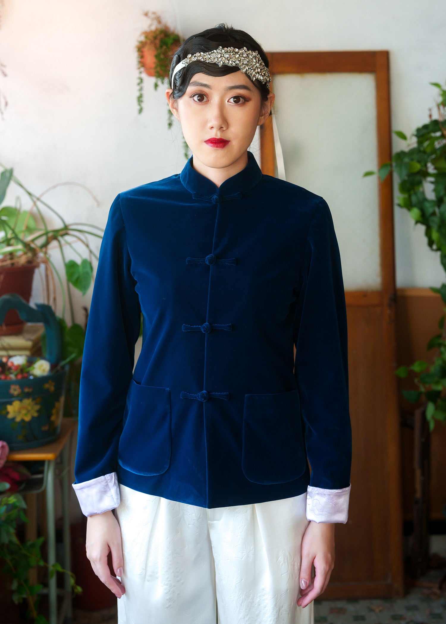 女士天鵝絨中式唐裝外套 (深藍綠色/ 淺紫色)