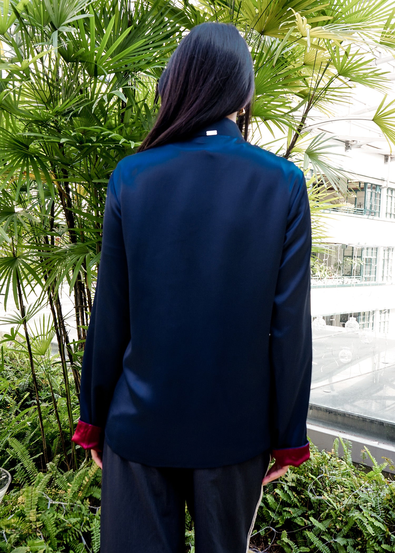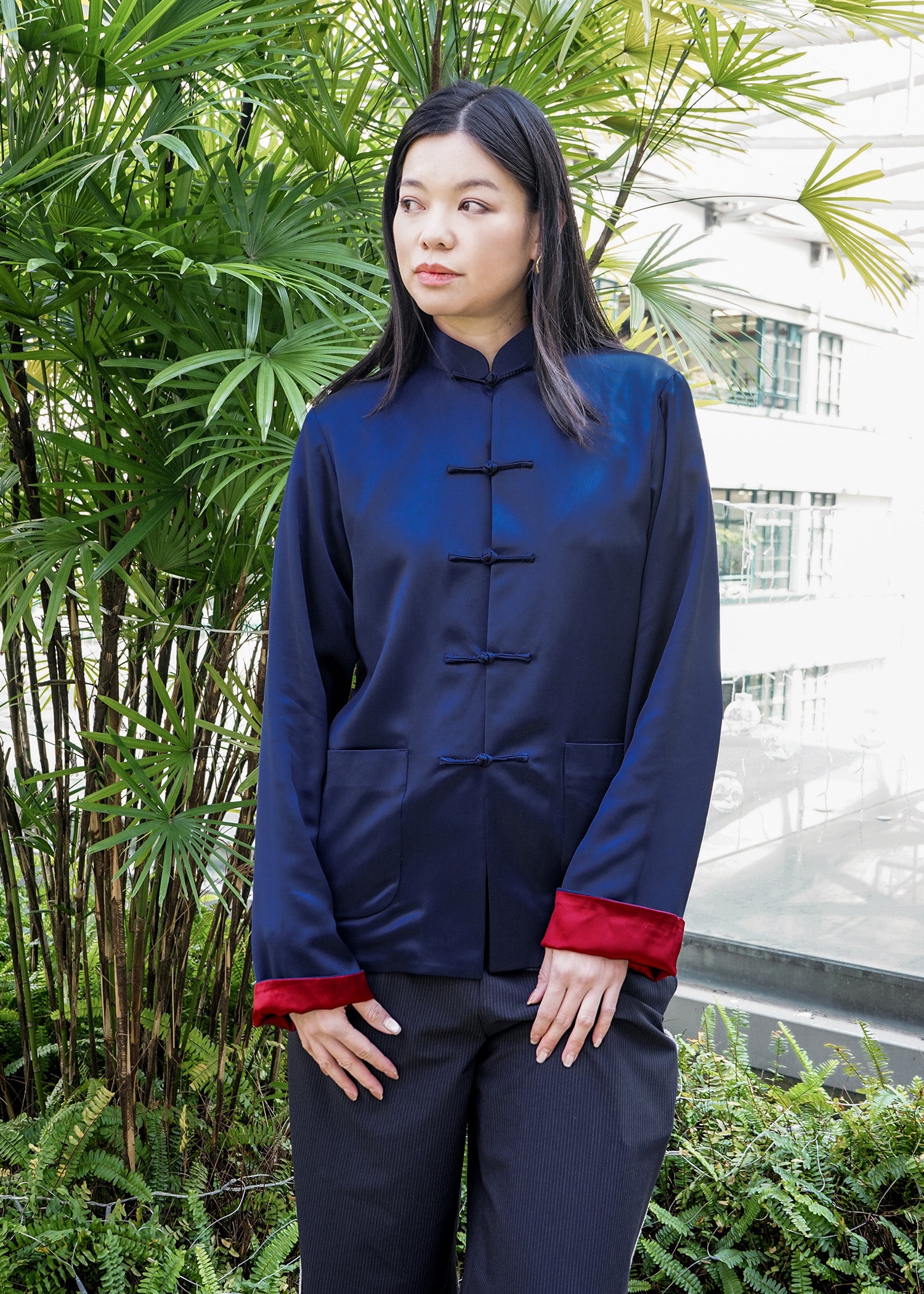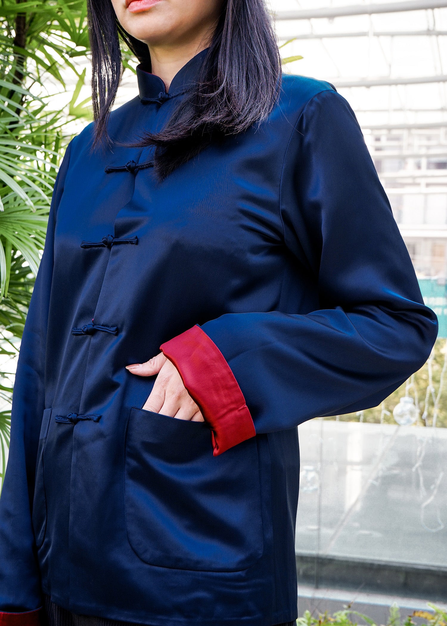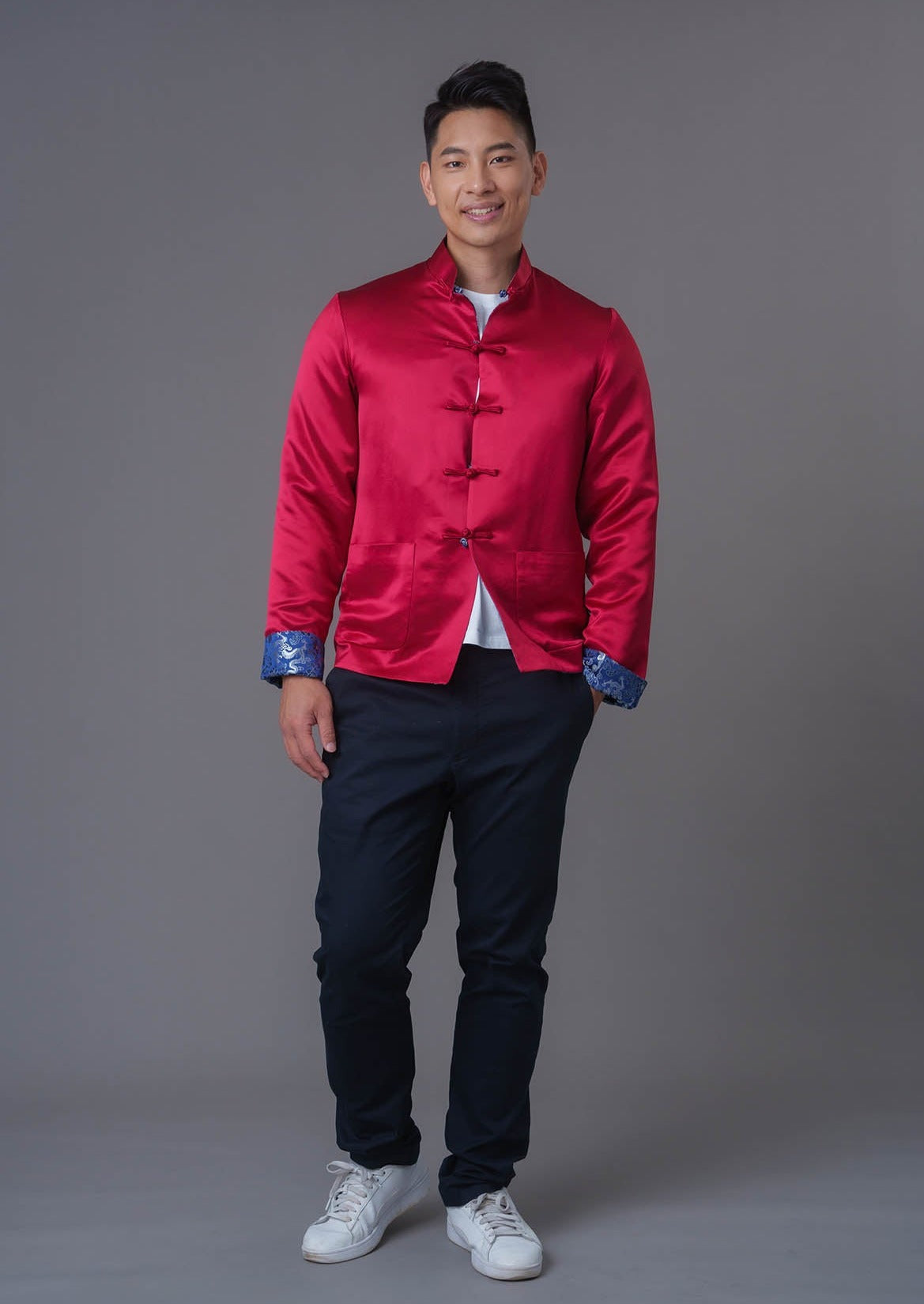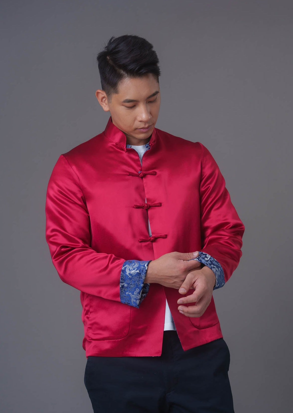 這款香港傳統男士唐裝外雙面套是新郎的時尚百搭單品。以奢華的緞面布料製作,搭配精緻的龍紋錦緞,並飾有獨特的中式一字扣。在大喜的日子裡,穿上紅色龍紋錦緞面,與新娘相得益彰;婚禮後可反面穿著,輕鬆提升各種場合的造型。