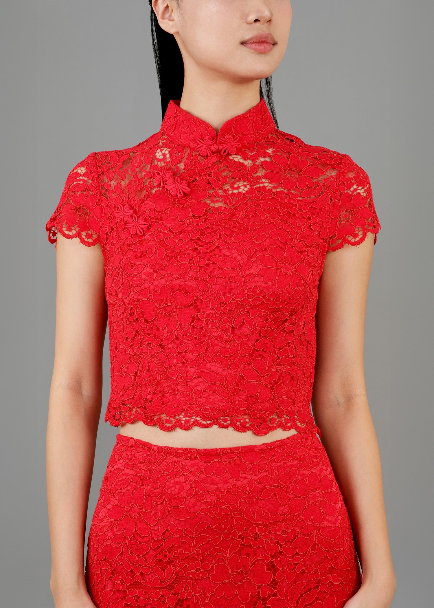這款Rosemist兩件式套裝包含小鳳仙袖蕾絲旗袍上衣,搭配高腰中長裙與側開衩設計,將傳統元素融入現代剪裁。兩件式設計更具靈活性,讓單品可輕鬆搭配於不同場合。特別適合尋求現代風格的新娘於敬茶儀式穿著,展現優雅與新意。
