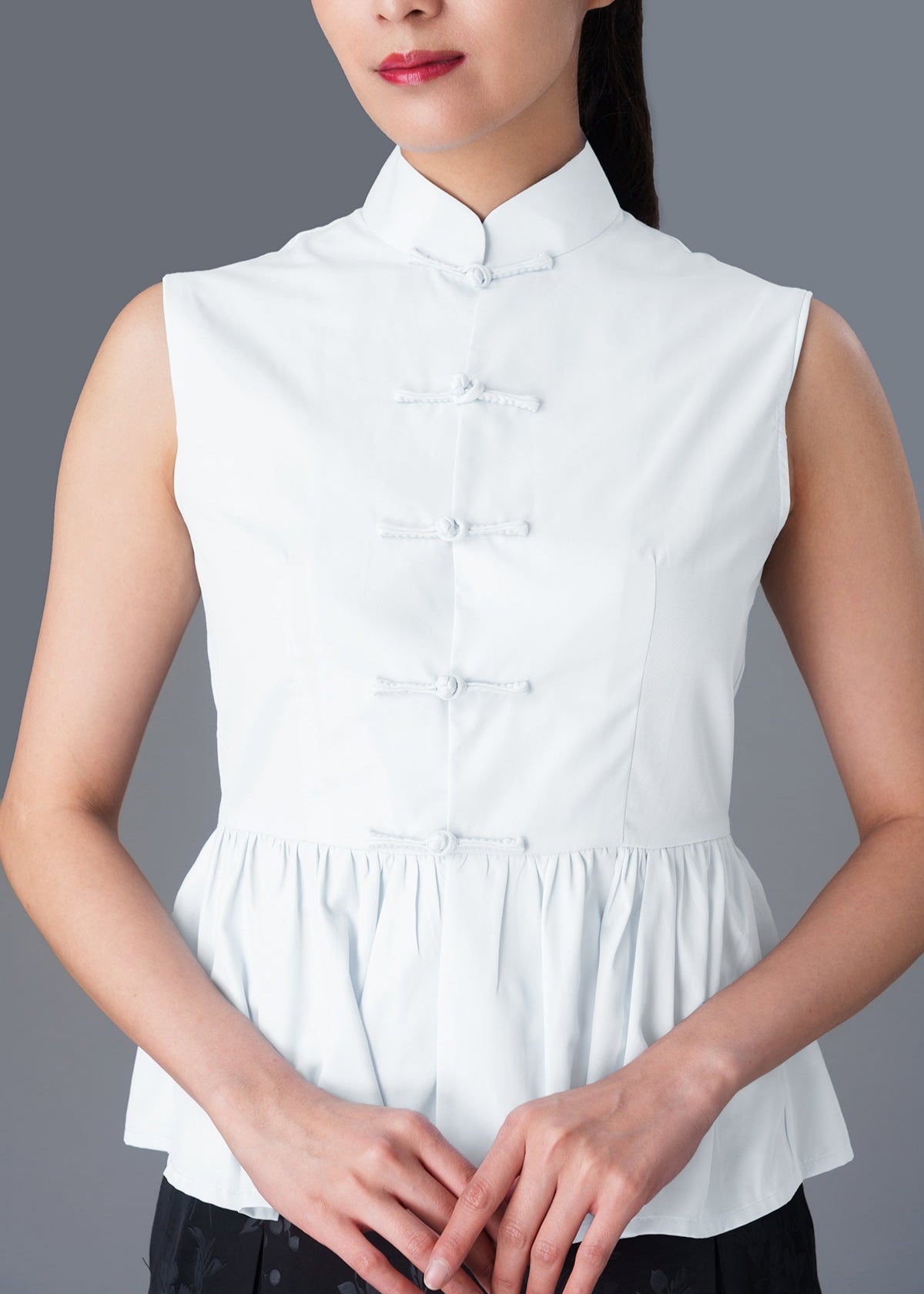 這款改良旗袍上衣以柔軟棉質面料製成,修身版型搭配下擺靈動荷葉邊,為傳統設計注入現代浪漫。經典白色與淺藍雙色可選,輕鬆駕馭多種場合。